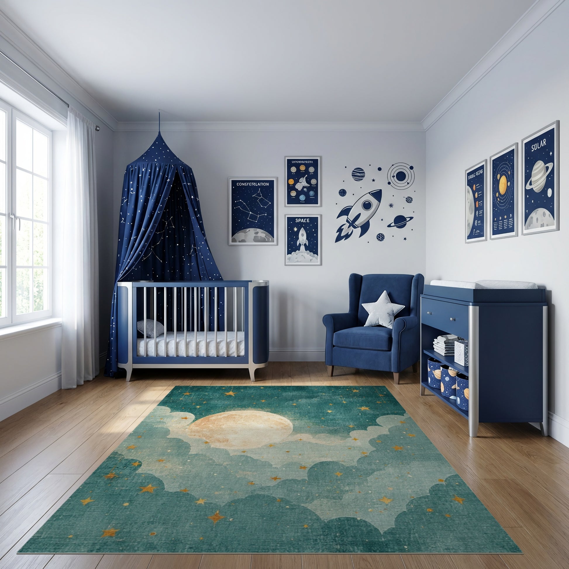 Teal Whimsical Stars Moon Clouds Rug