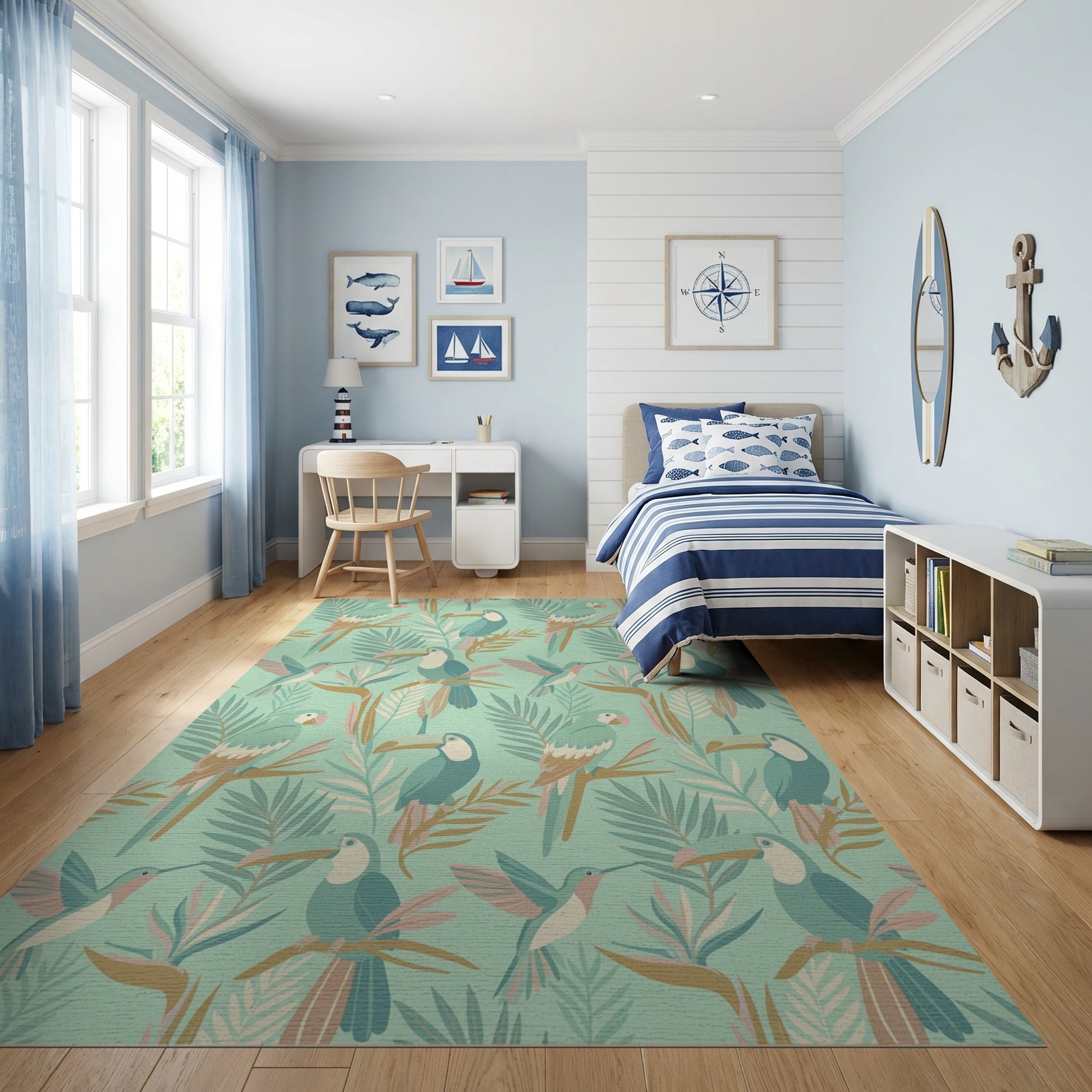 Flatwoven High Traffic Area Rug, Tropical Teal Toucan Fern Hummingbird Rug, Non Slip, Stain Resistant, Washable Area Rugs for Study Room, Playroom, Bedroom Overview:
