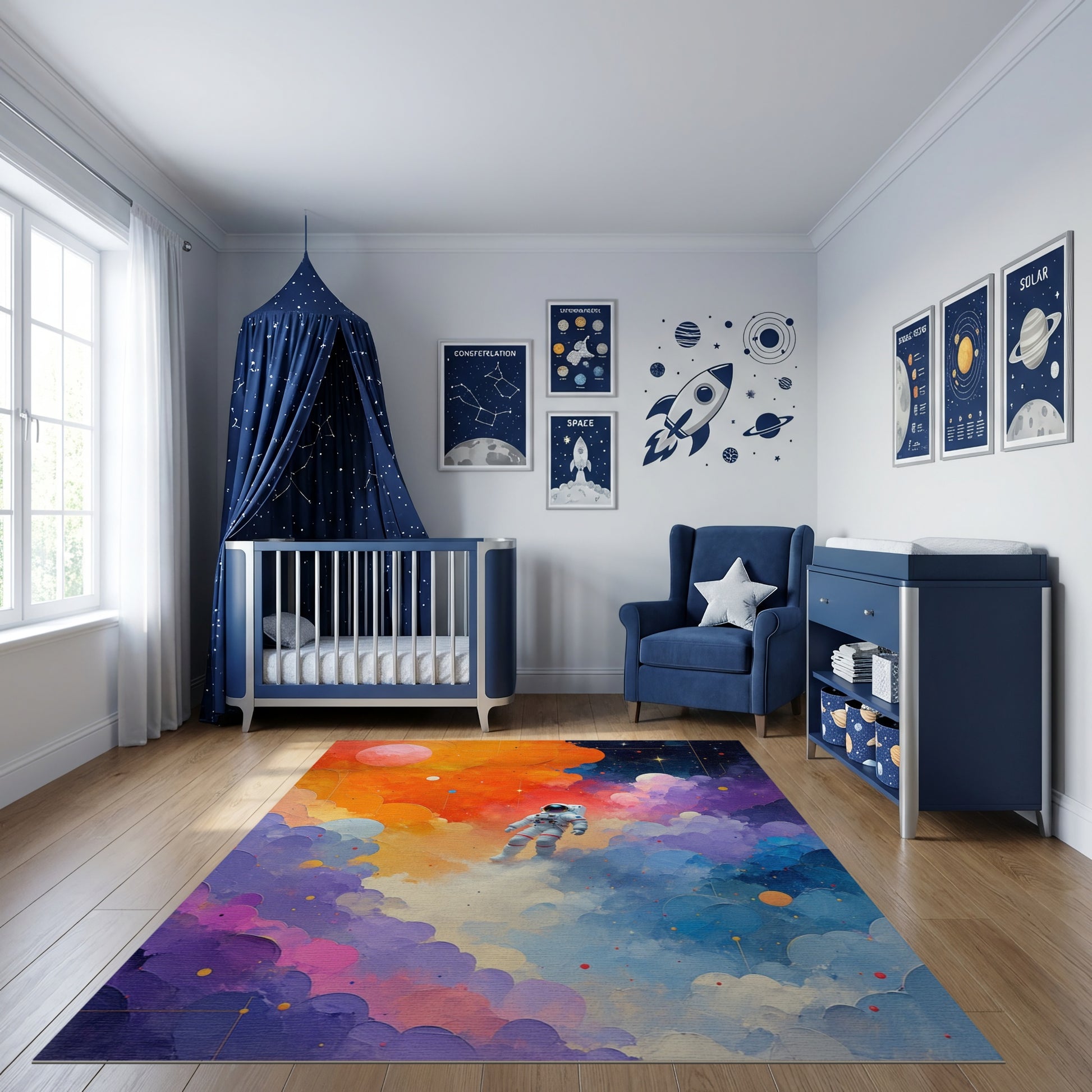 Flatwoven High Traffic Area Rug, Vibrant Astronaut Cosmic Nebula Clouds Rug, Non Slip, Stain Resistant, Washable Area Rugs for Study Room, Playroom, Bedroom Overview: