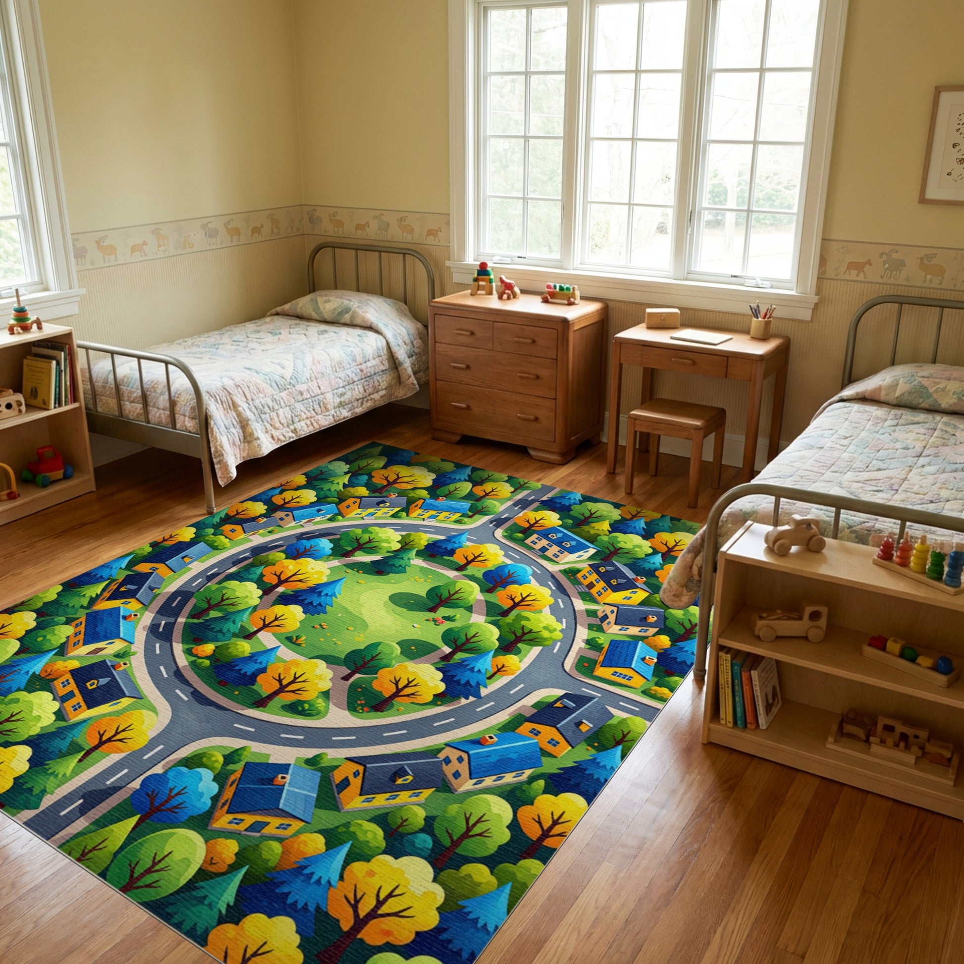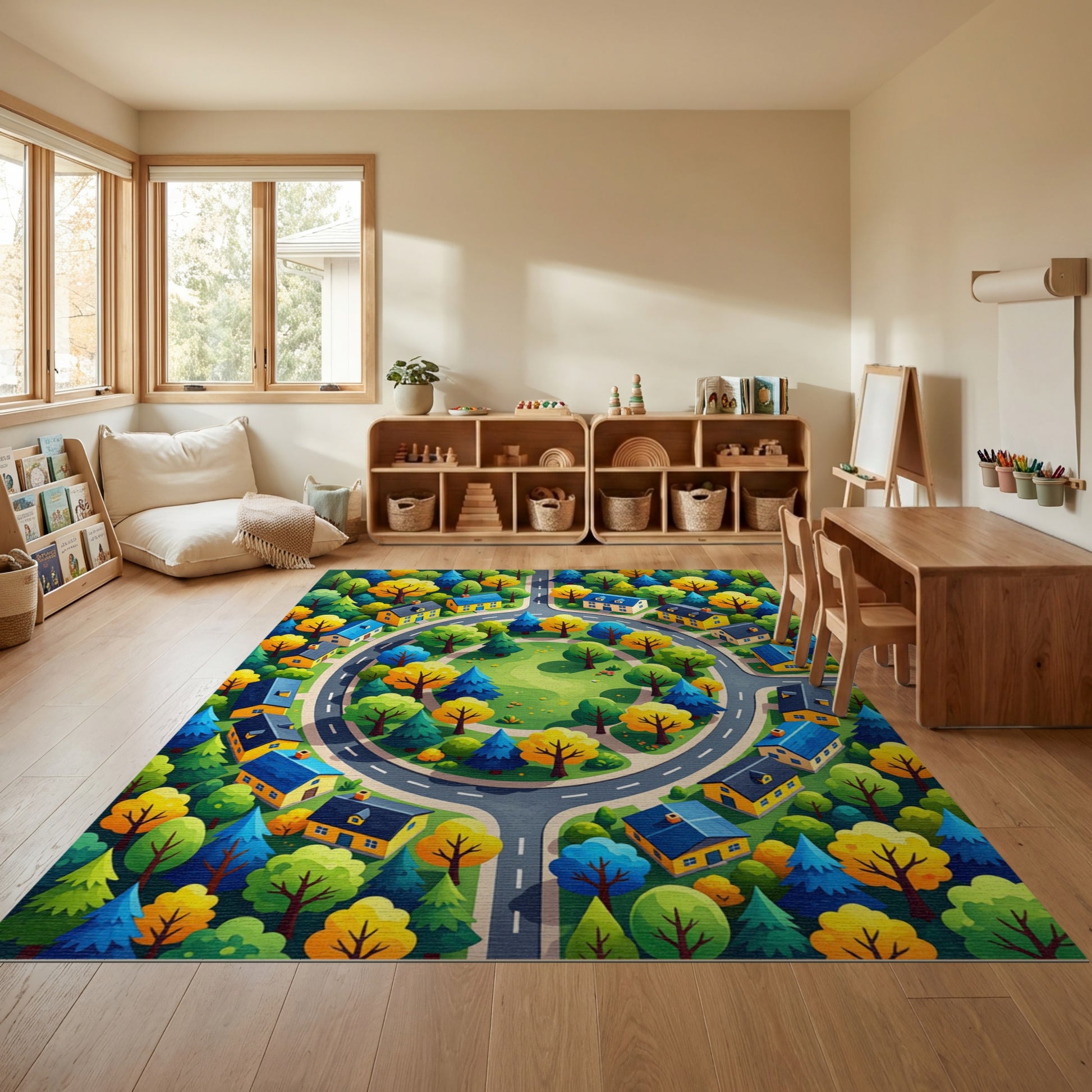 Flatwoven High Traffic Area Rug, Vibrant Autumn Village Roundabout Trees Rug, Non Slip, Stain Resistant, Washable Area Rugs for Study Room, Playroom, Bedroom Overview: