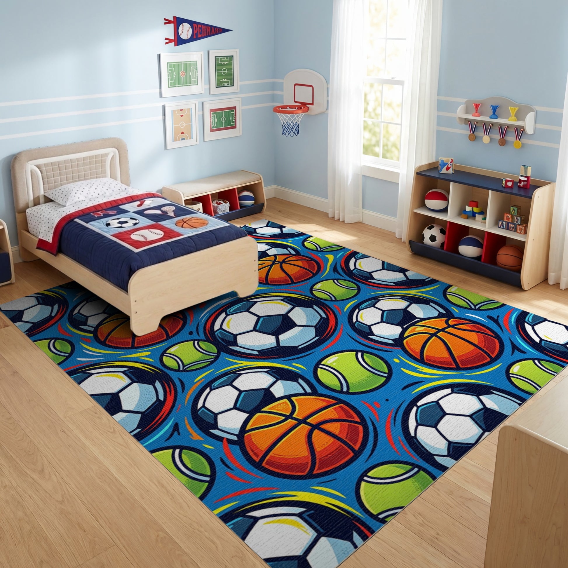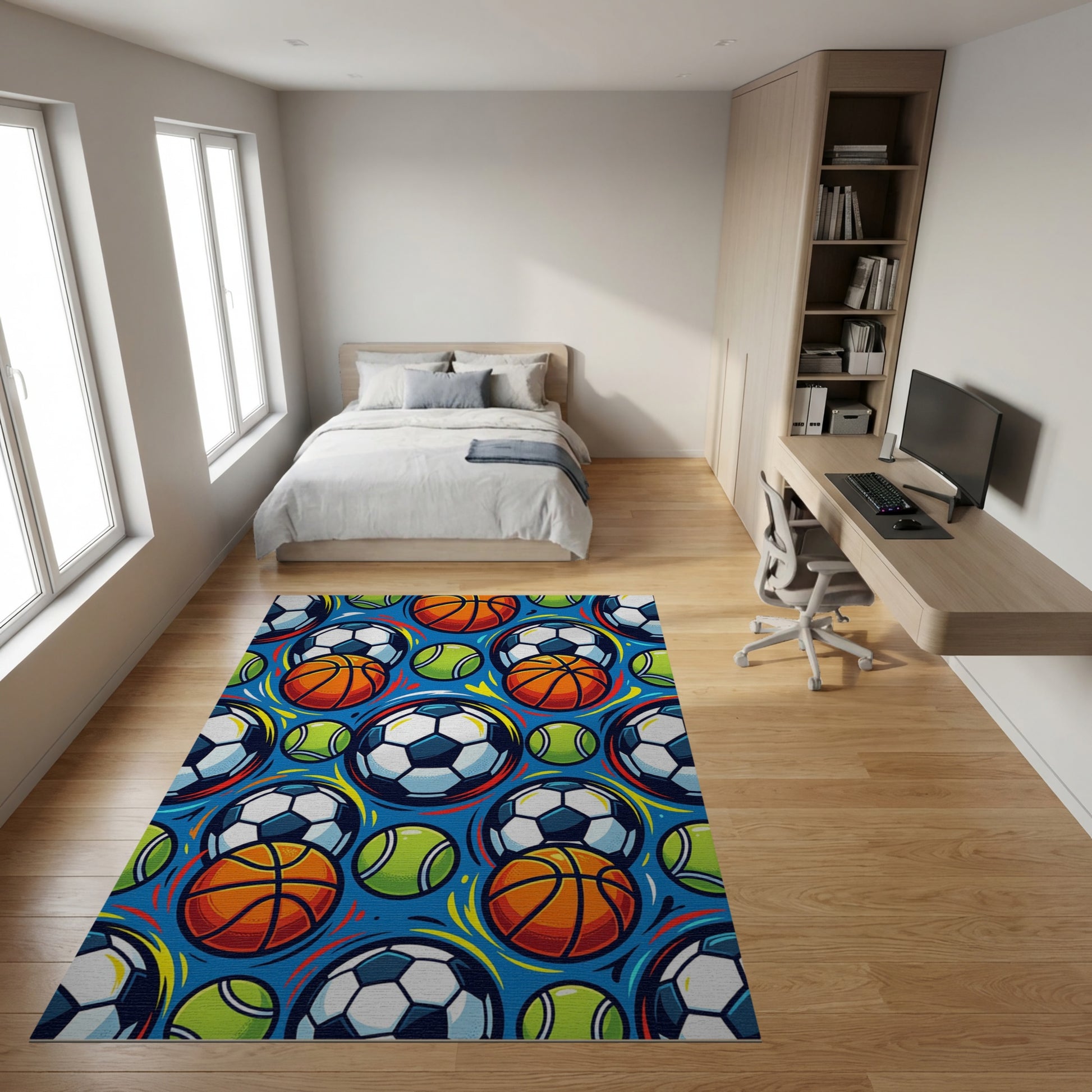 Flatwoven High Traffic Area Rug, Vibrant Basketball Soccer Tennis Balls Rug, Non Slip, Stain Resistant, Washable Area Rugs for Study Room, Playroom, Bedroom Overview: