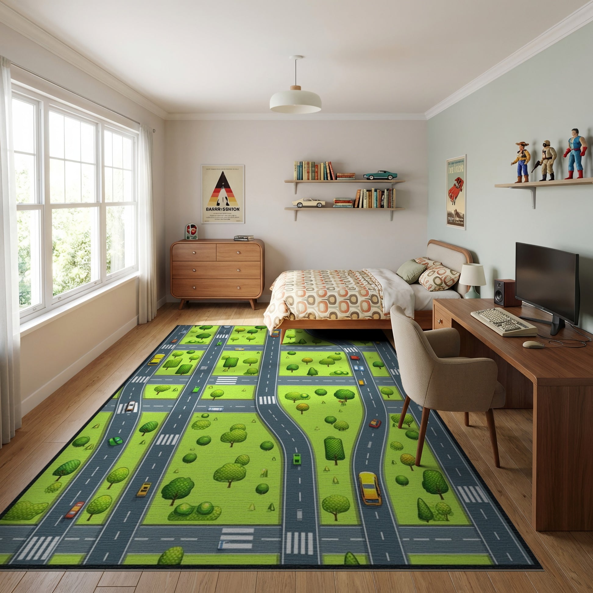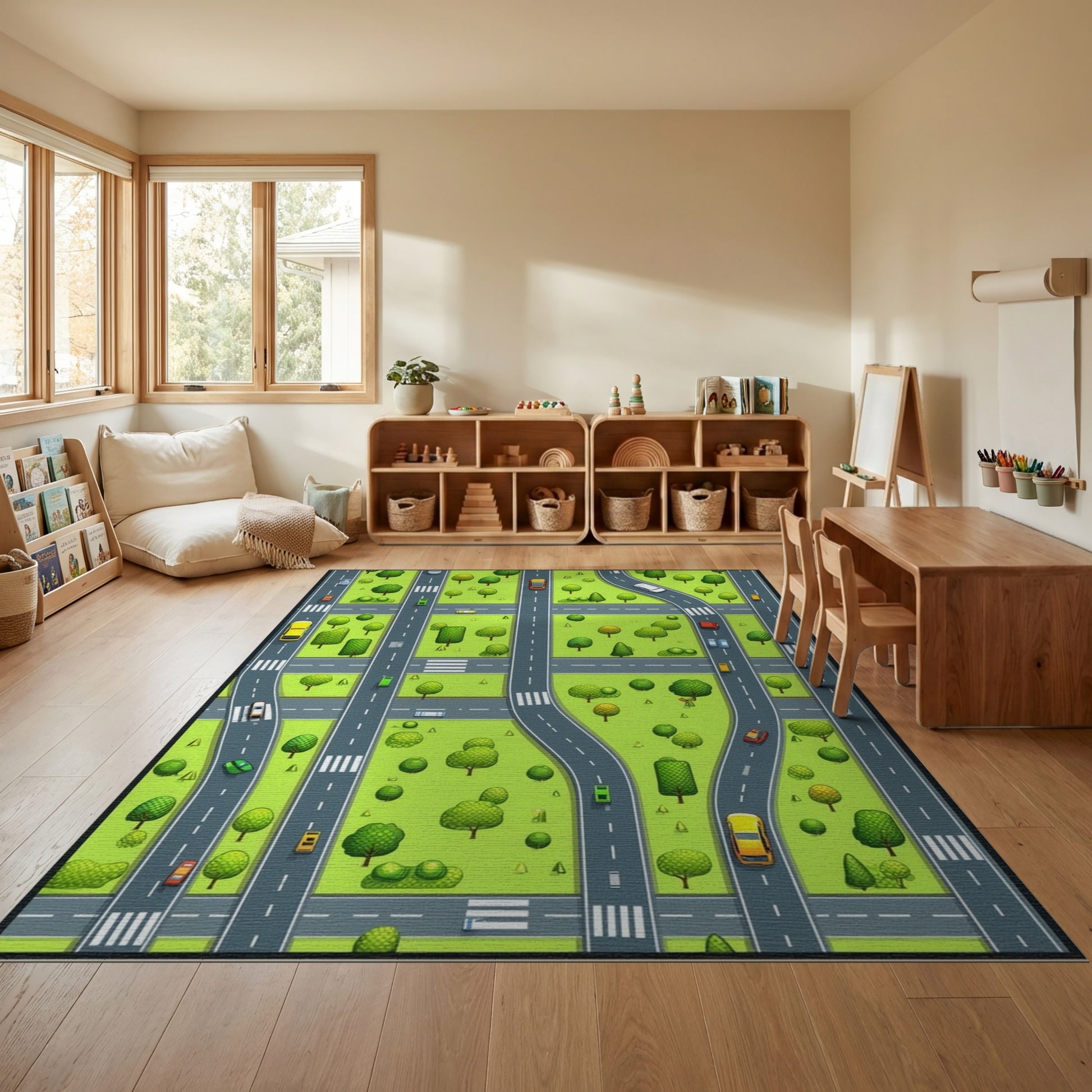 Flatwoven High Traffic Area Rug, Vibrant City Roads Trees Cars Rug, Non Slip, Stain Resistant, Washable Area Rugs for Study Room, Playroom, Bedroom Overview: