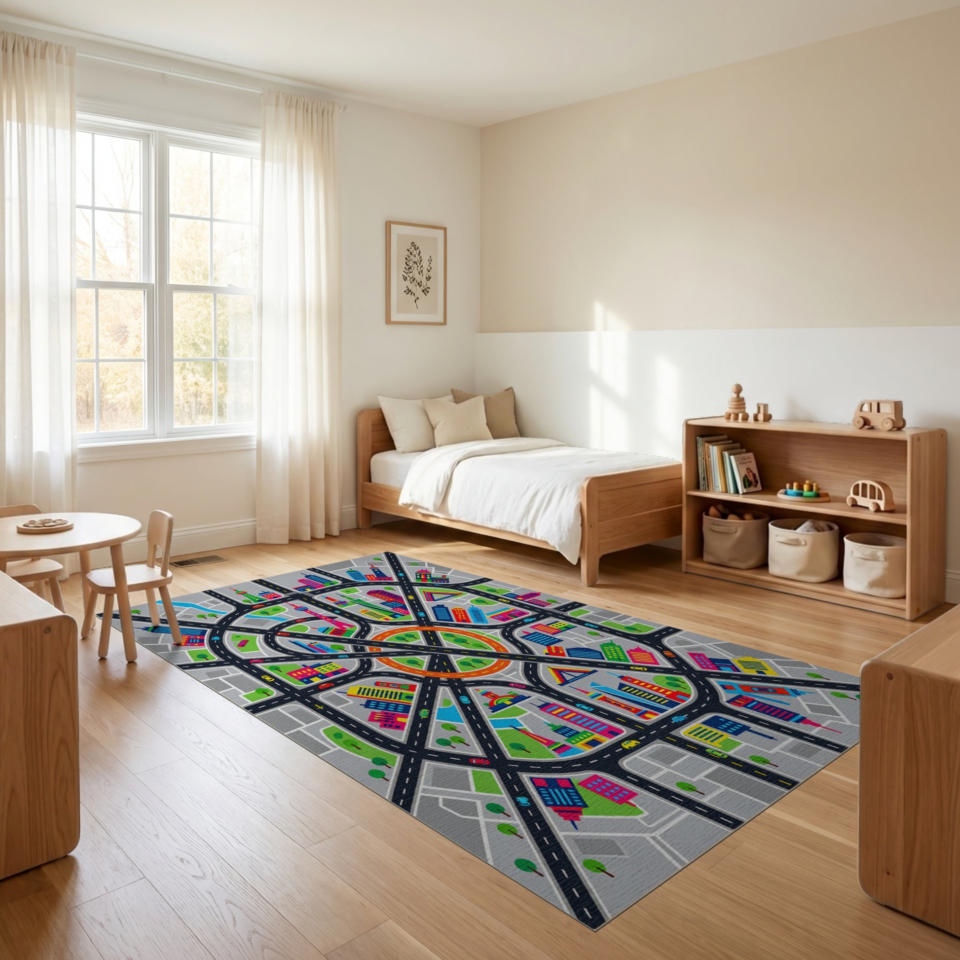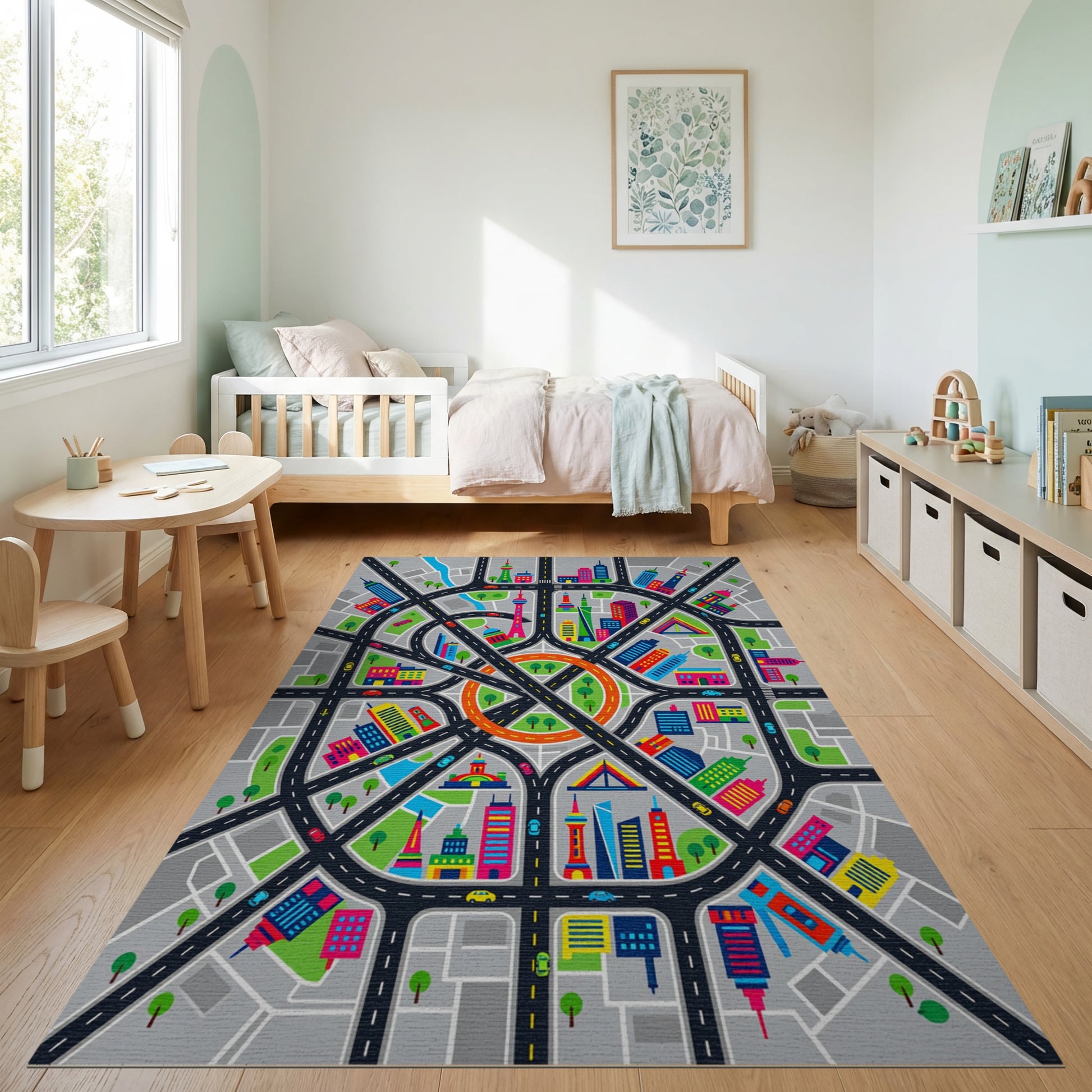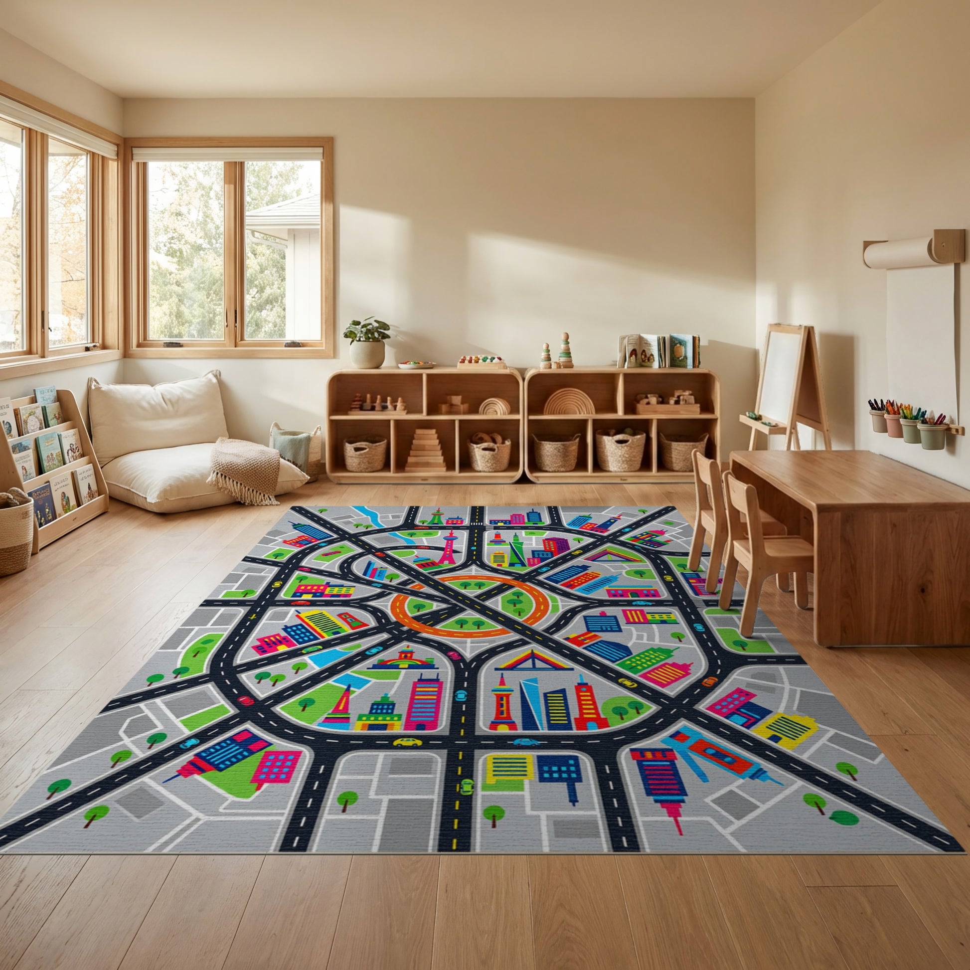Flatwoven High Traffic Area Rug, Vibrant City Streets Skyscrapers Rug, Non Slip, Stain Resistant, Washable Area Rugs for Study Room, Playroom, Bedroom Overview: