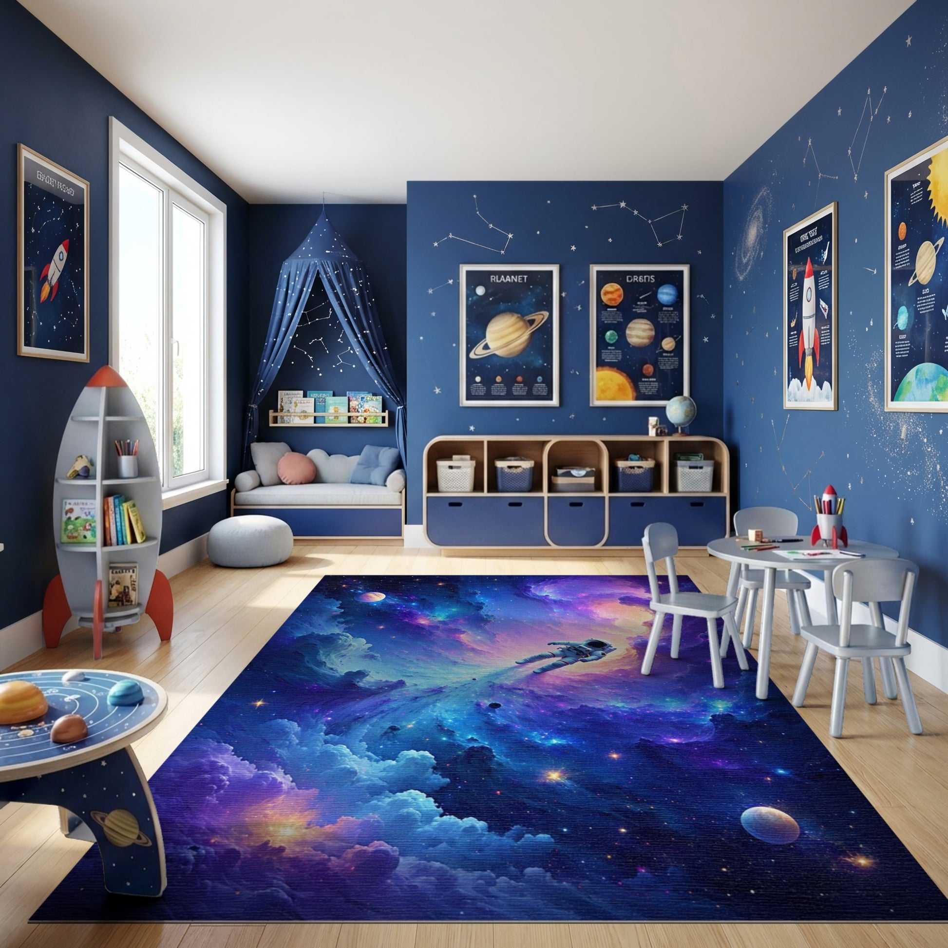 Flatwoven High Traffic Area Rug, Vibrant Cosmic Astronaut Nebula Rug, Non Slip, Stain Resistant, Washable Area Rugs for Study Room, Playroom, Bedroom Overview: