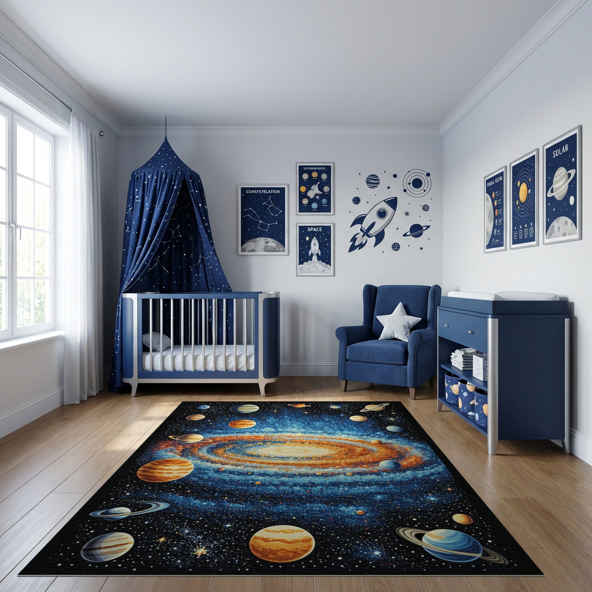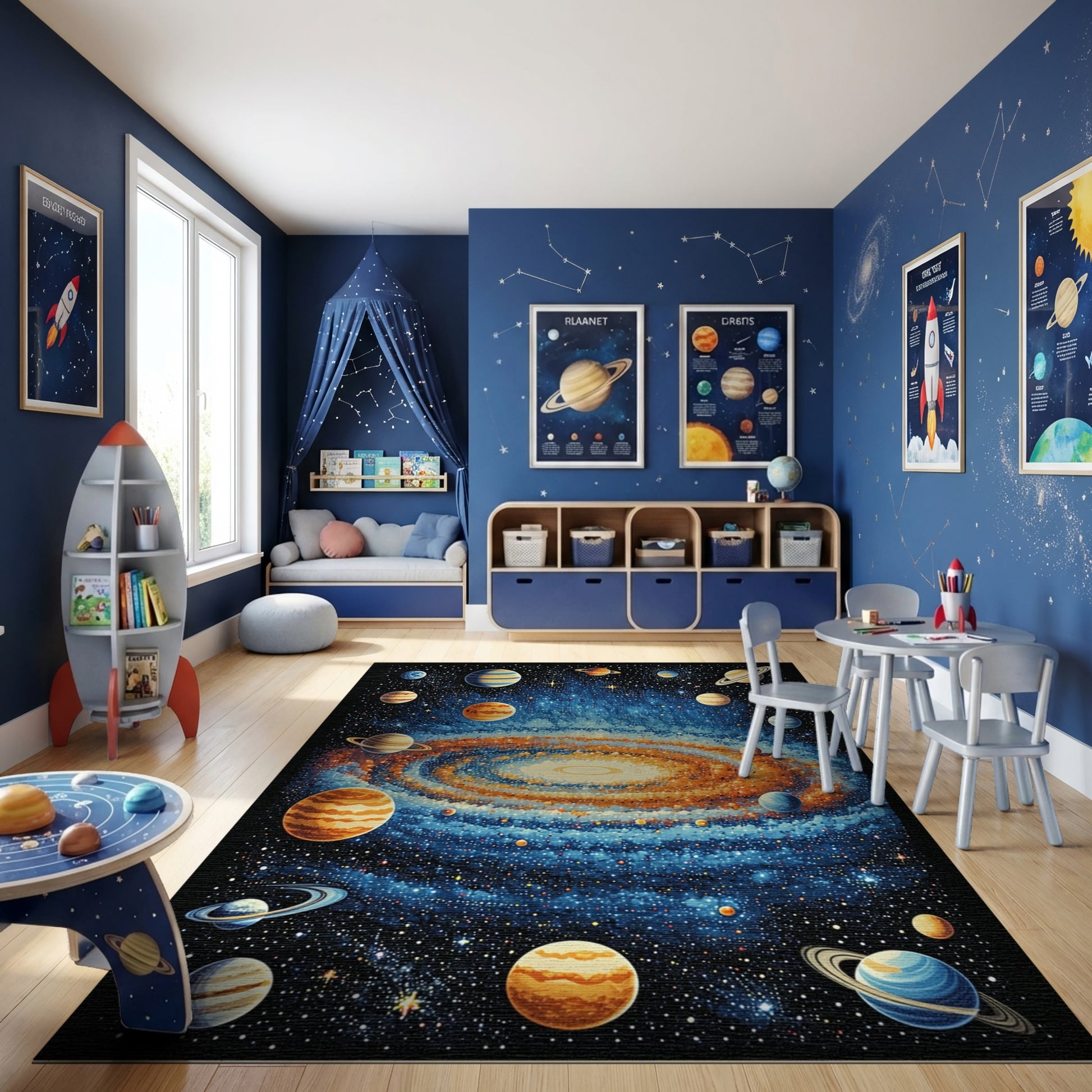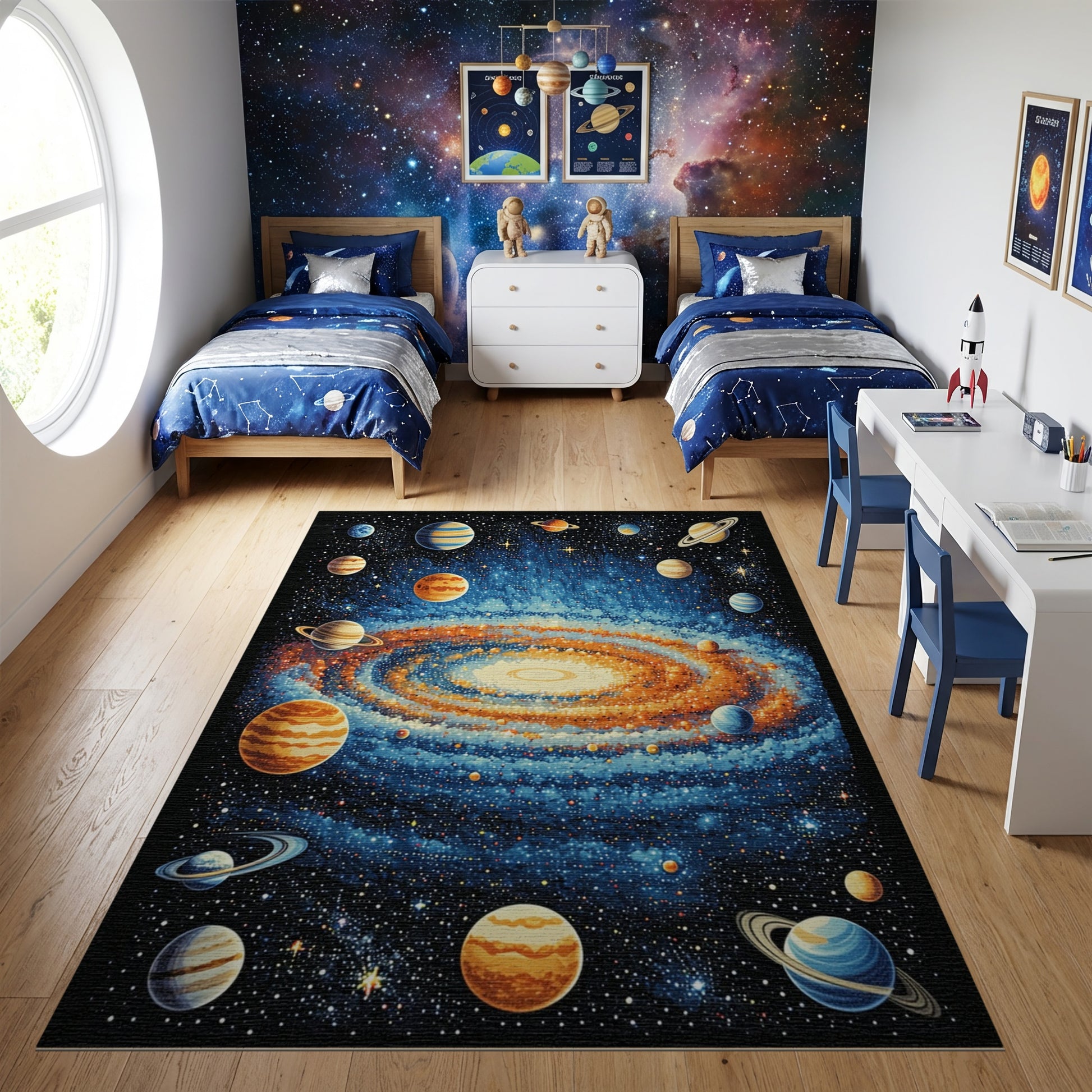 Flatwoven High Traffic Area Rug, Vibrant Cosmic Spiral Galaxy Planets Rug, Non Slip, Stain Resistant, Washable Area Rugs for Study Room, Playroom, Bedroom Overview: