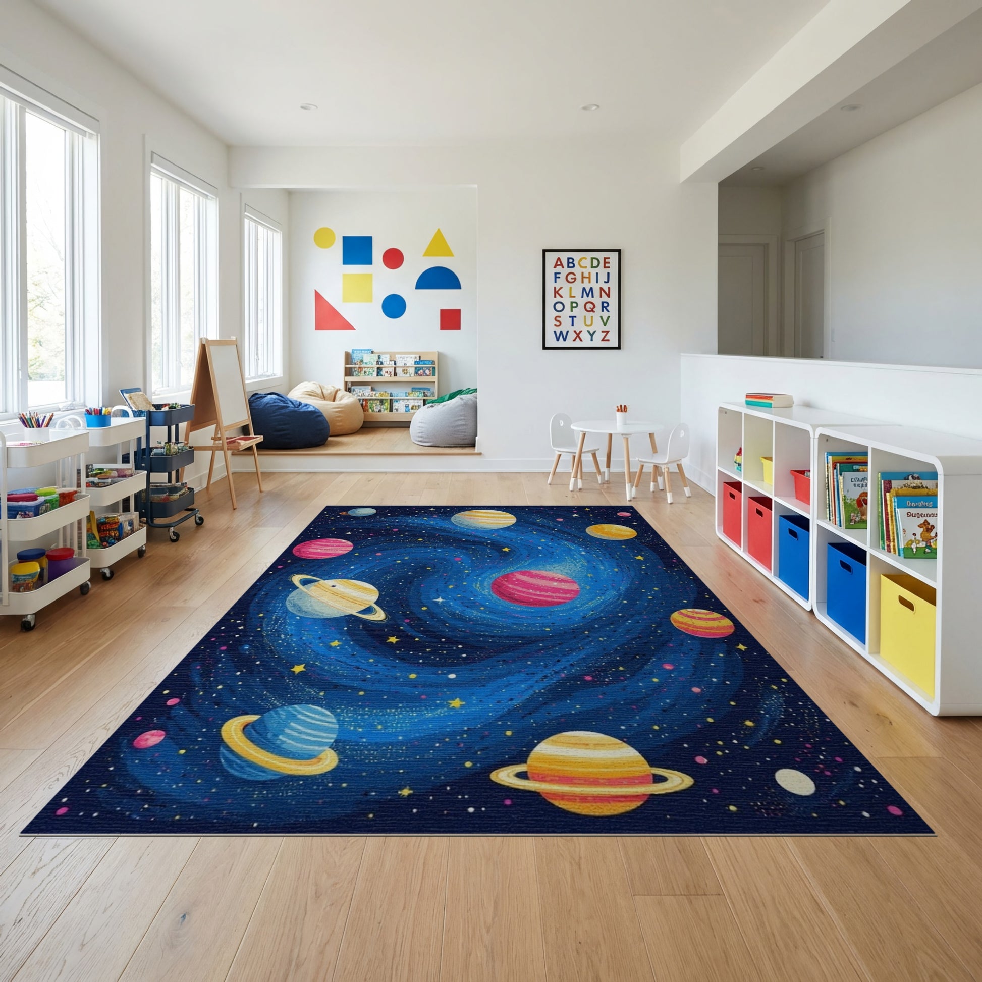 Flatwoven High Traffic Area Rug, Vibrant Cosmic Swirl Planets Rug, Non Slip, Stain Resistant, Washable Area Rugs for Study Room, Playroom, Bedroom Overview: