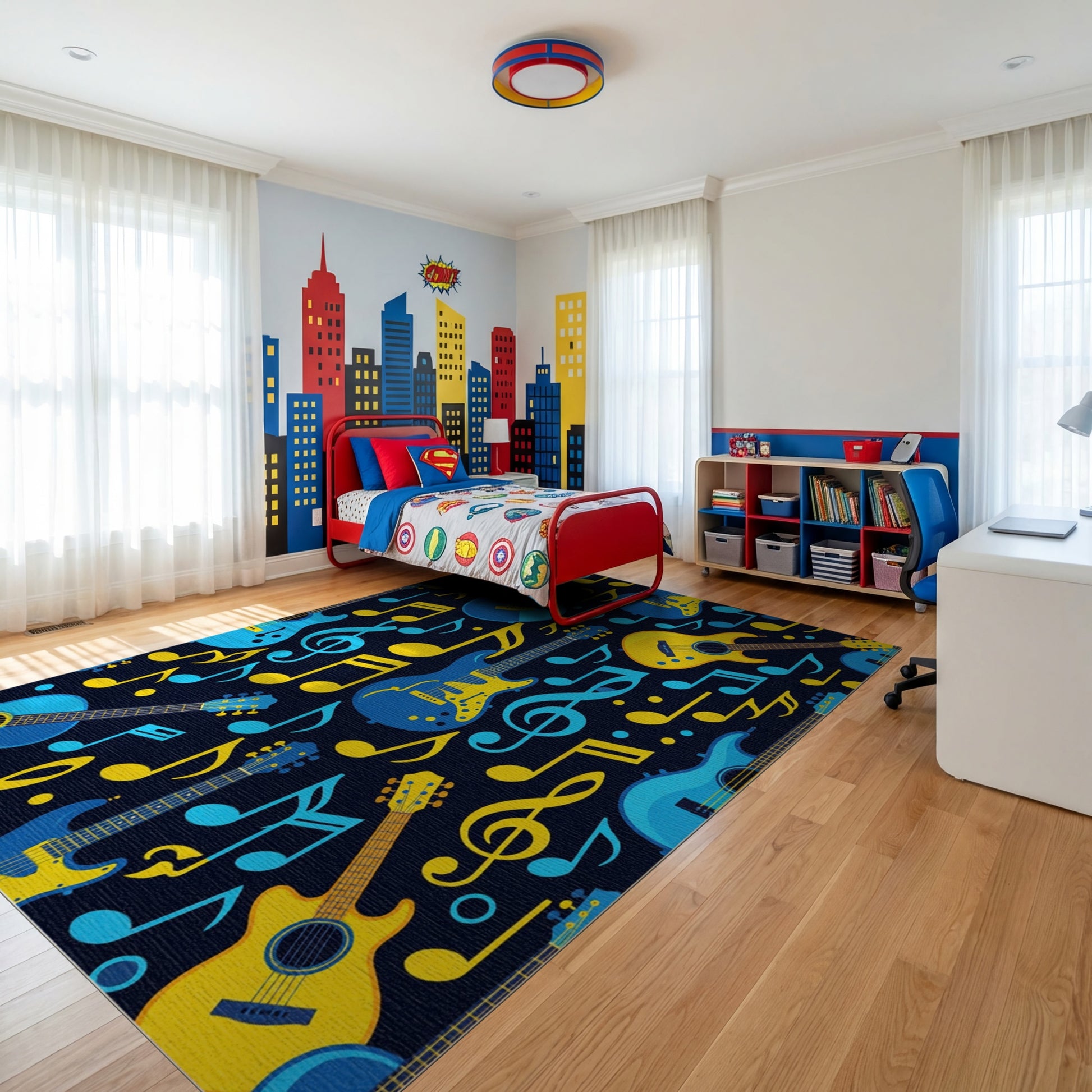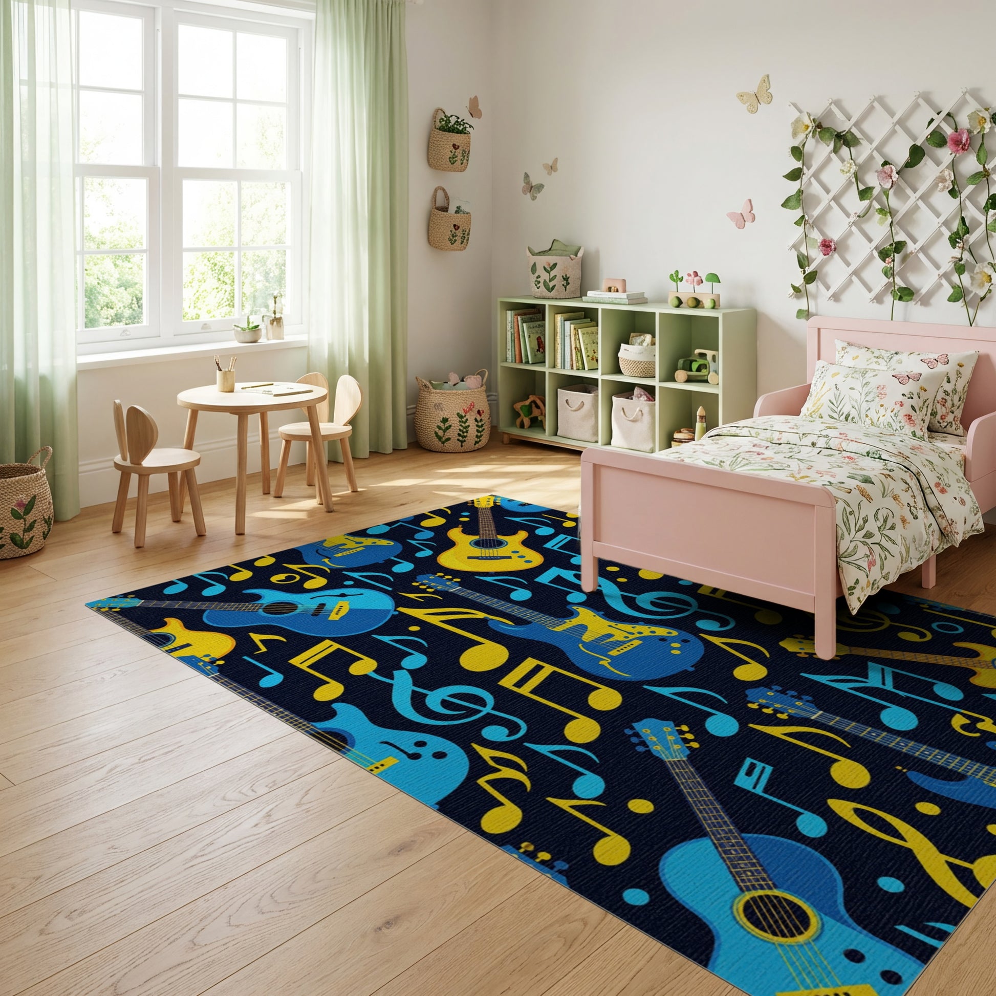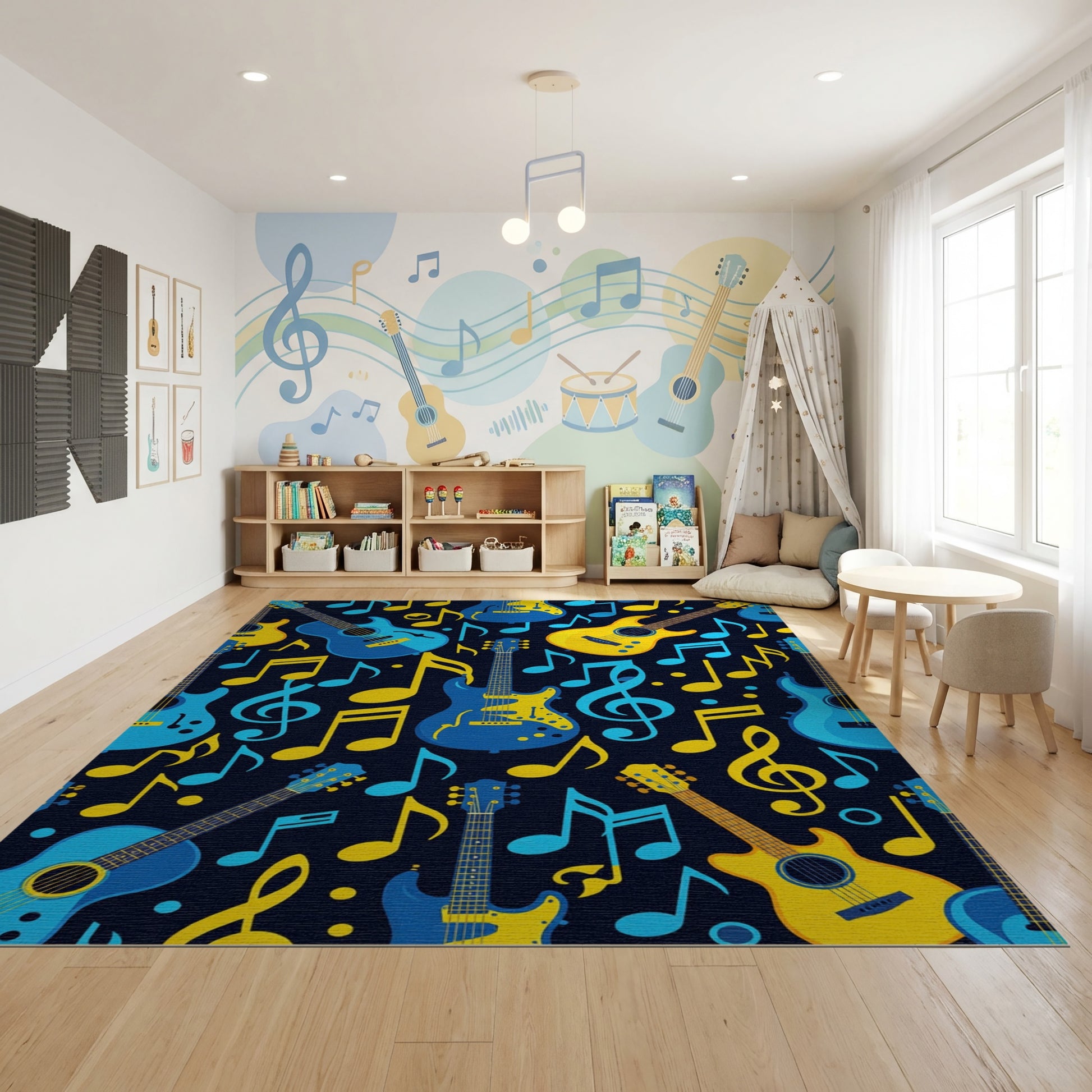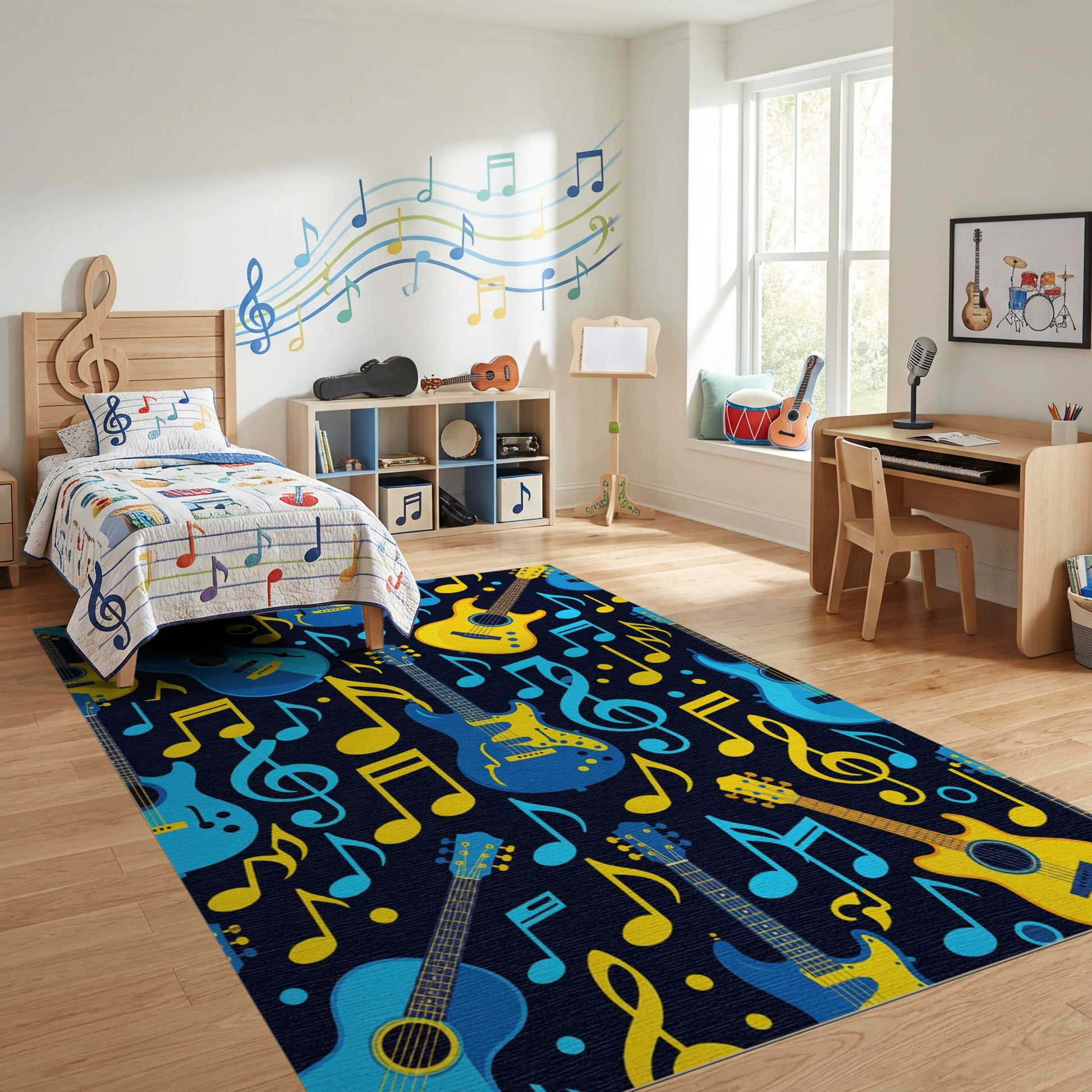 Flatwoven High Traffic Area Rug, Vibrant Electric Guitars Notes Navy Rug, Non Slip, Stain Resistant, Washable Area Rugs for Study Room, Playroom, Bedroom Overview: