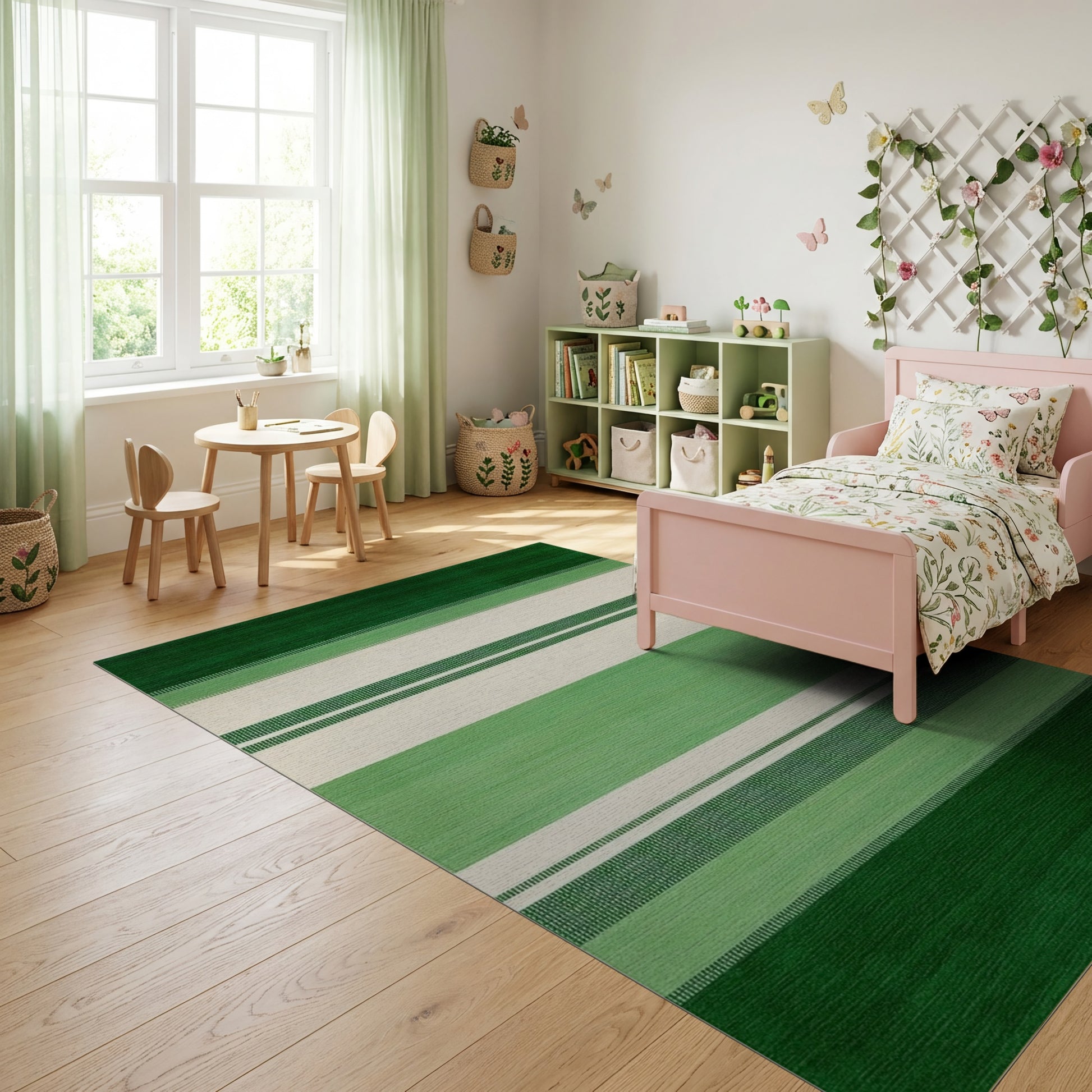 Flatwoven High Traffic Area Rug, Vibrant Green and Cream Striped Rug, Non Slip, Stain Resistant, Washable Area Rugs for Study Room, Playroom, Bedroom Overview: