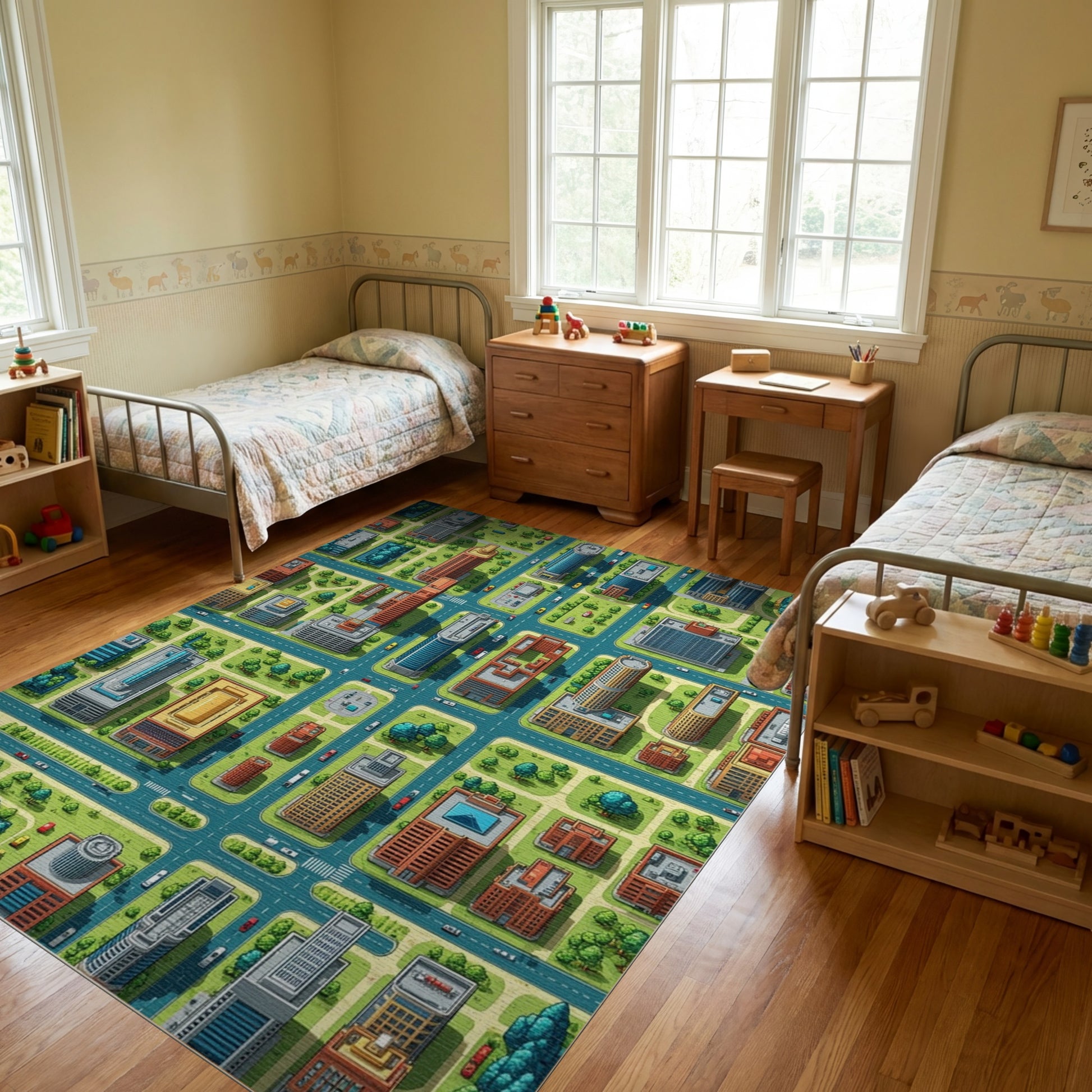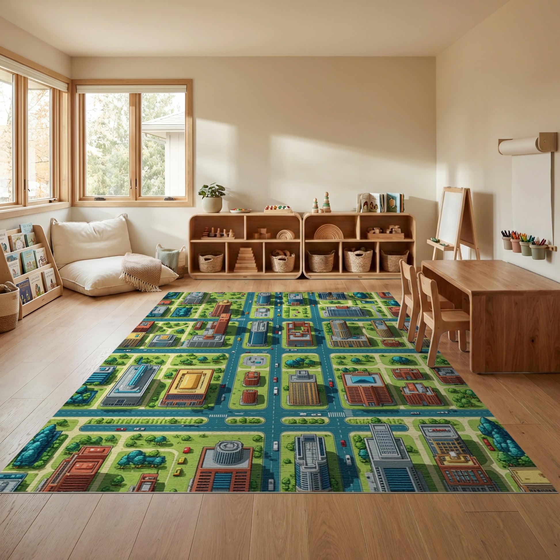 Flatwoven High Traffic Area Rug, Vibrant Isometric City Grid Rug, Non Slip, Stain Resistant, Washable Area Rugs for Study Room, Playroom, Bedroom Overview: