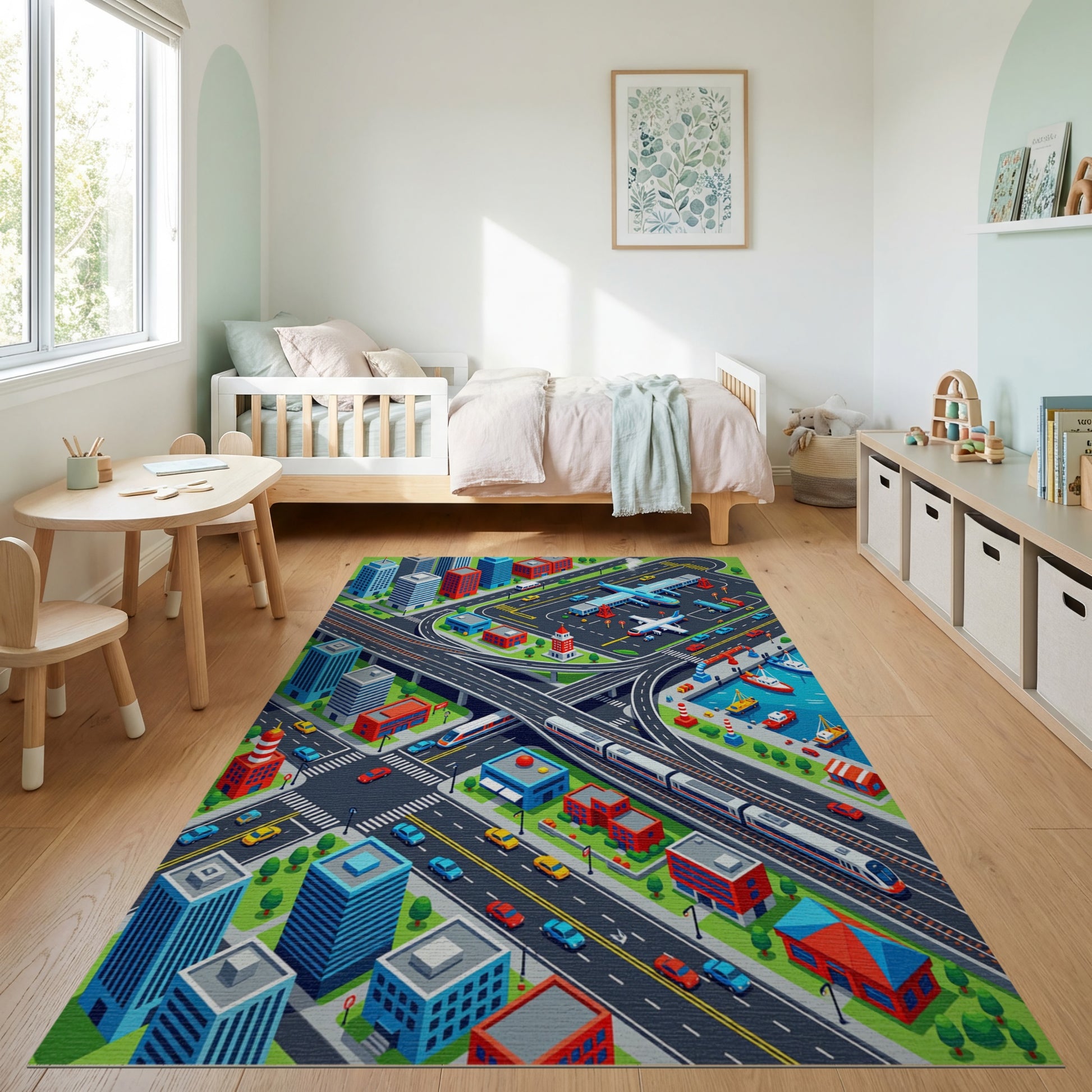 Flatwoven High Traffic Area Rug, Vibrant Isometric City Transport Rug, Non Slip, Stain Resistant, Washable Area Rugs for Study Room, Playroom, Bedroom Overview: