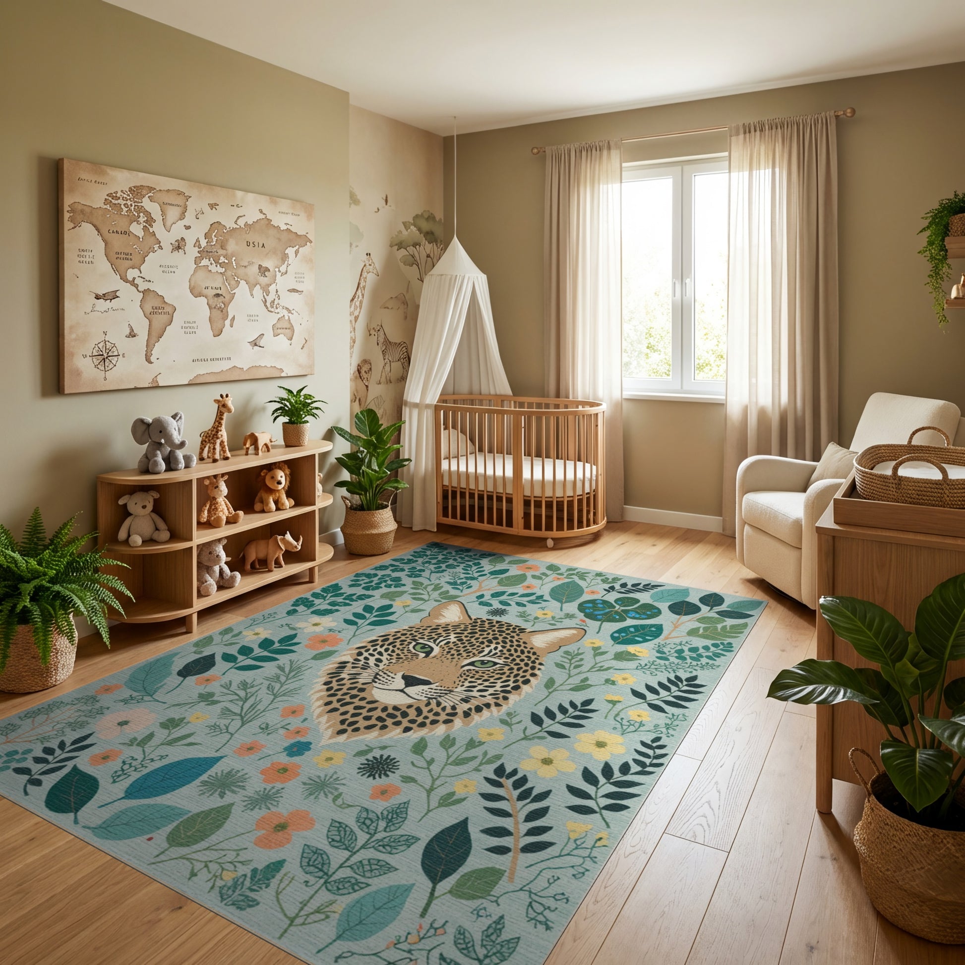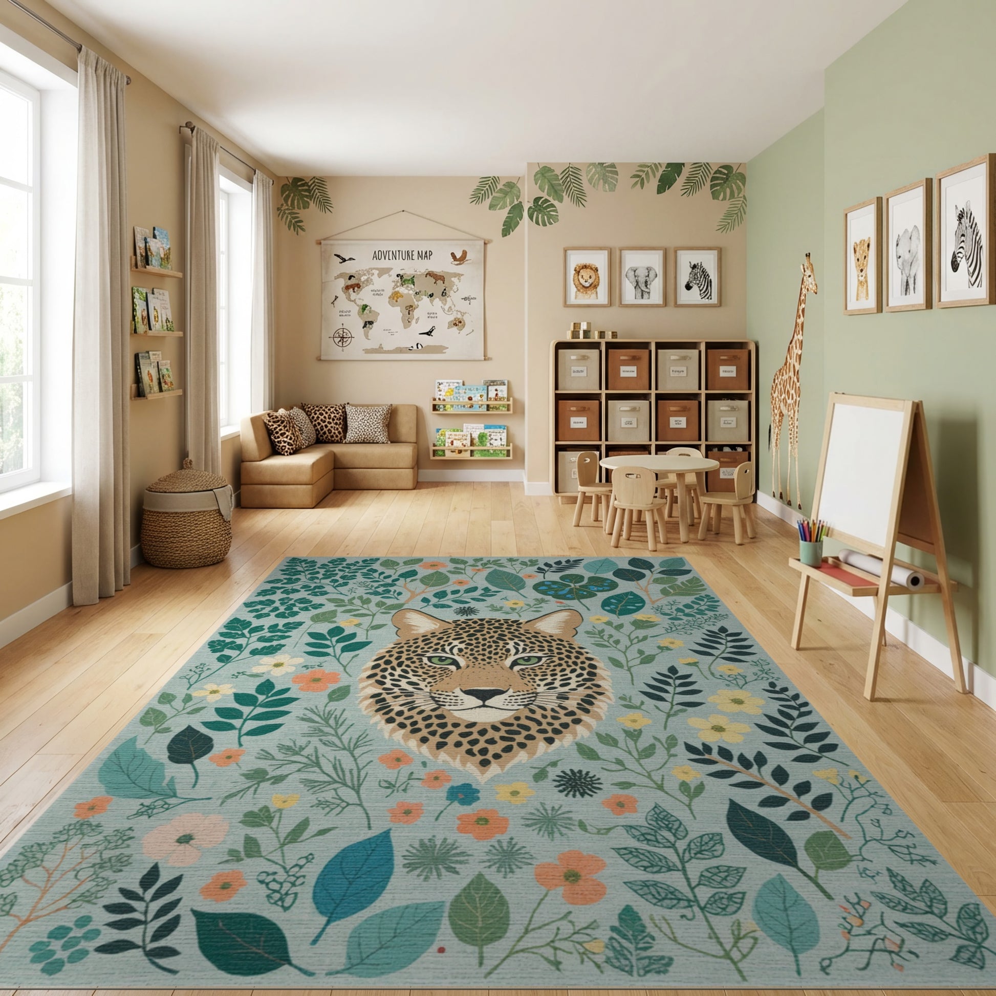 Flatwoven High Traffic Area Rug, Vibrant Leopard Green Foliage Floral Rug, Non Slip, Stain Resistant, Washable Area Rugs for Study Room, Playroom, Bedroom Overview: