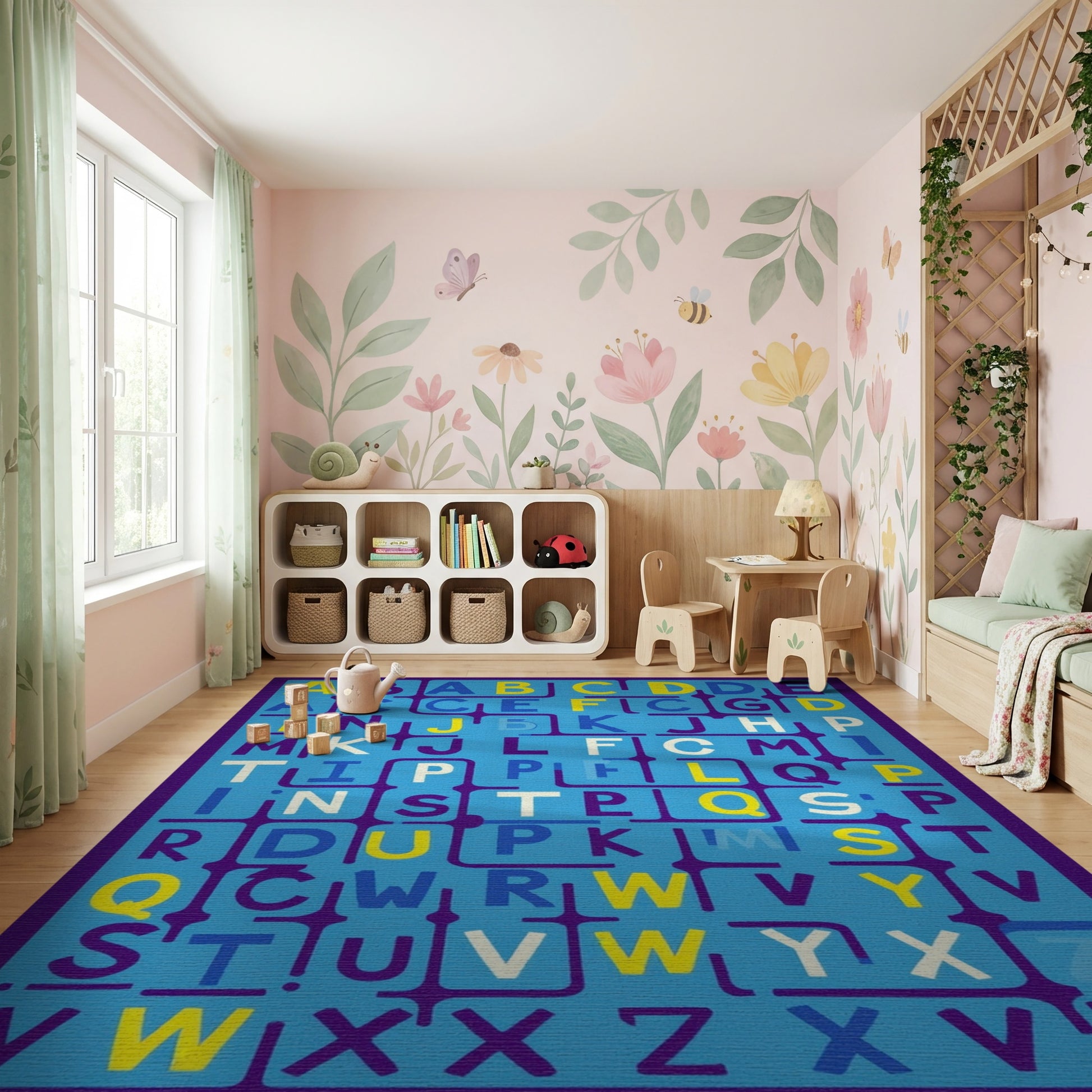 Flatwoven High Traffic Area Rug, Vibrant Multicolor Alphabet Grid Rug, Non Slip, Stain Resistant, Washable Area Rugs for Study Room, Playroom, Bedroom Overview: