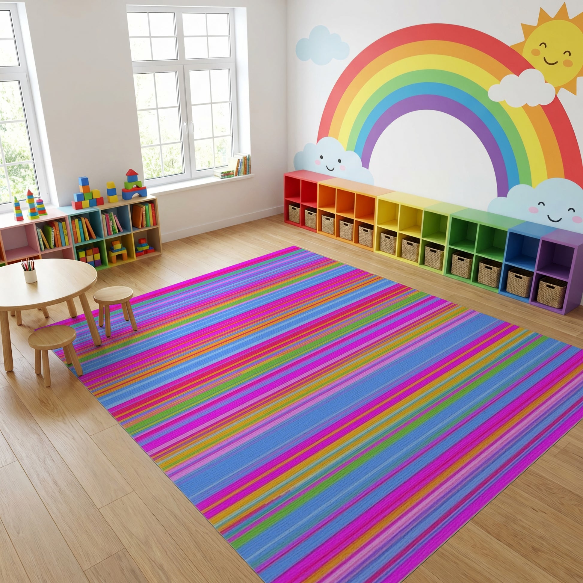 Flatwoven High Traffic Area Rug, Vibrant Multicolor Horizontal Stripes Rug, Non Slip, Stain Resistant, Washable Area Rugs for Study Room, Playroom, Bedroom Overview: