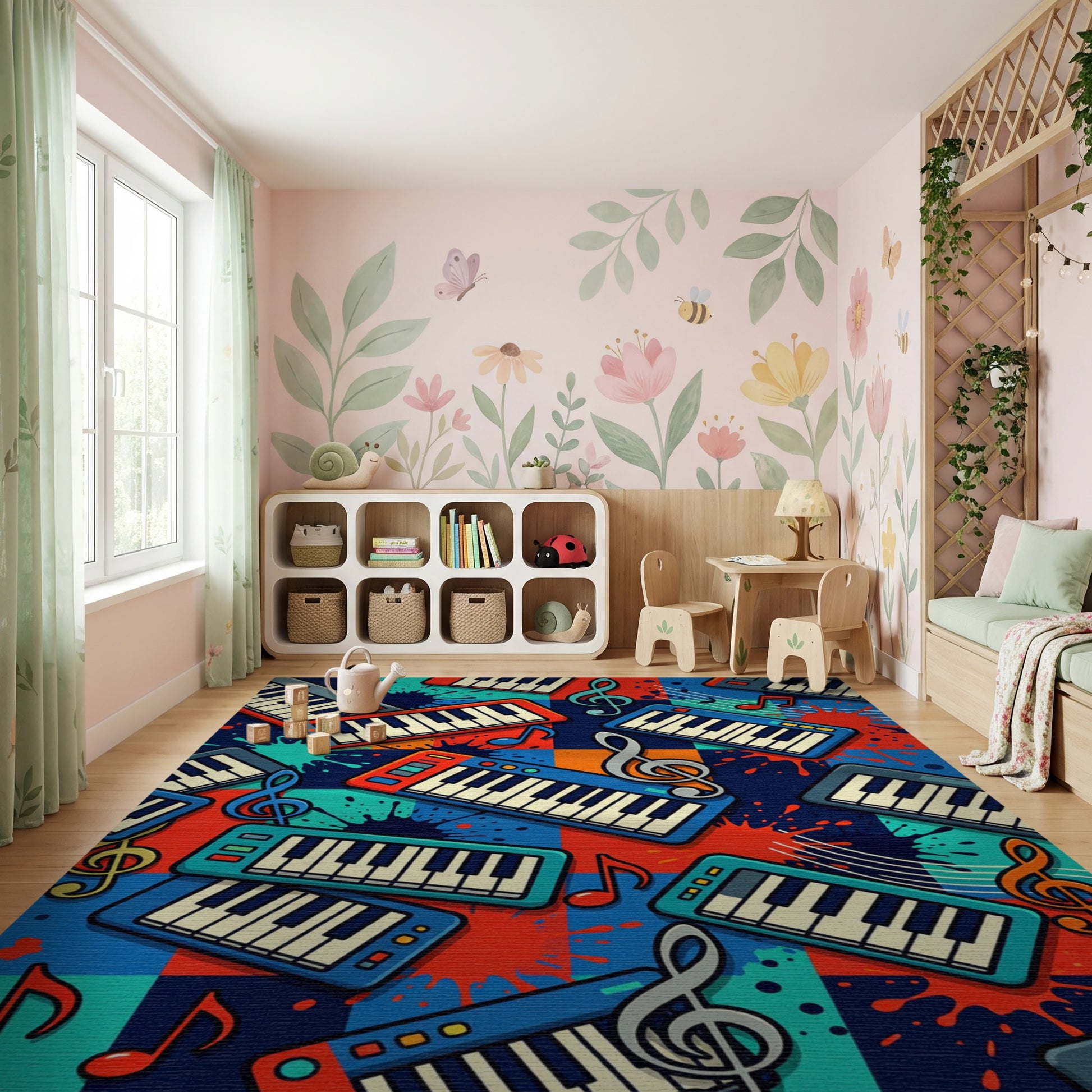 Flatwoven High Traffic Area Rug, Vibrant Musical Keyboards Splatter Notes Rug, Non Slip, Stain Resistant, Washable Area Rugs for Study Room, Playroom, Bedroom Overview: