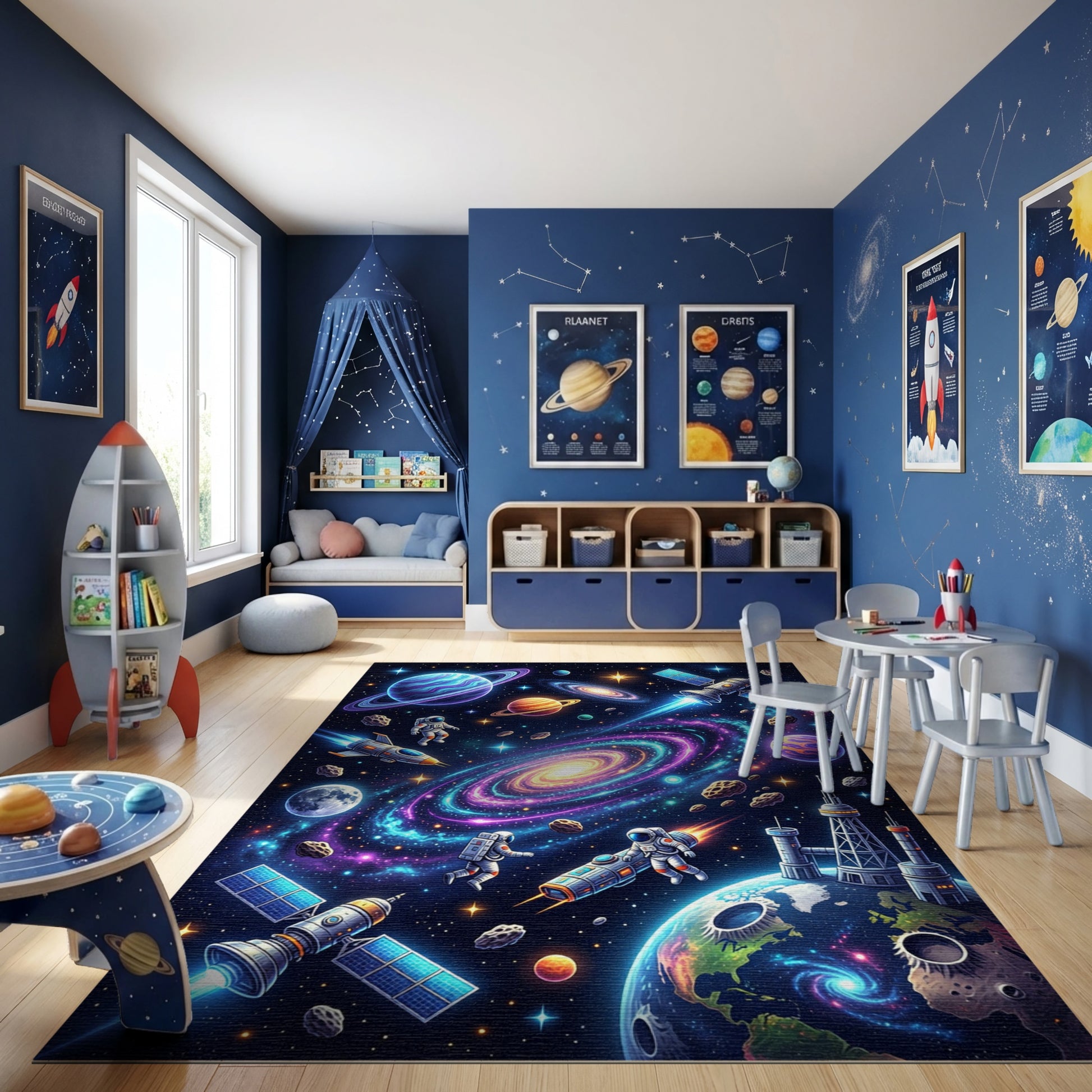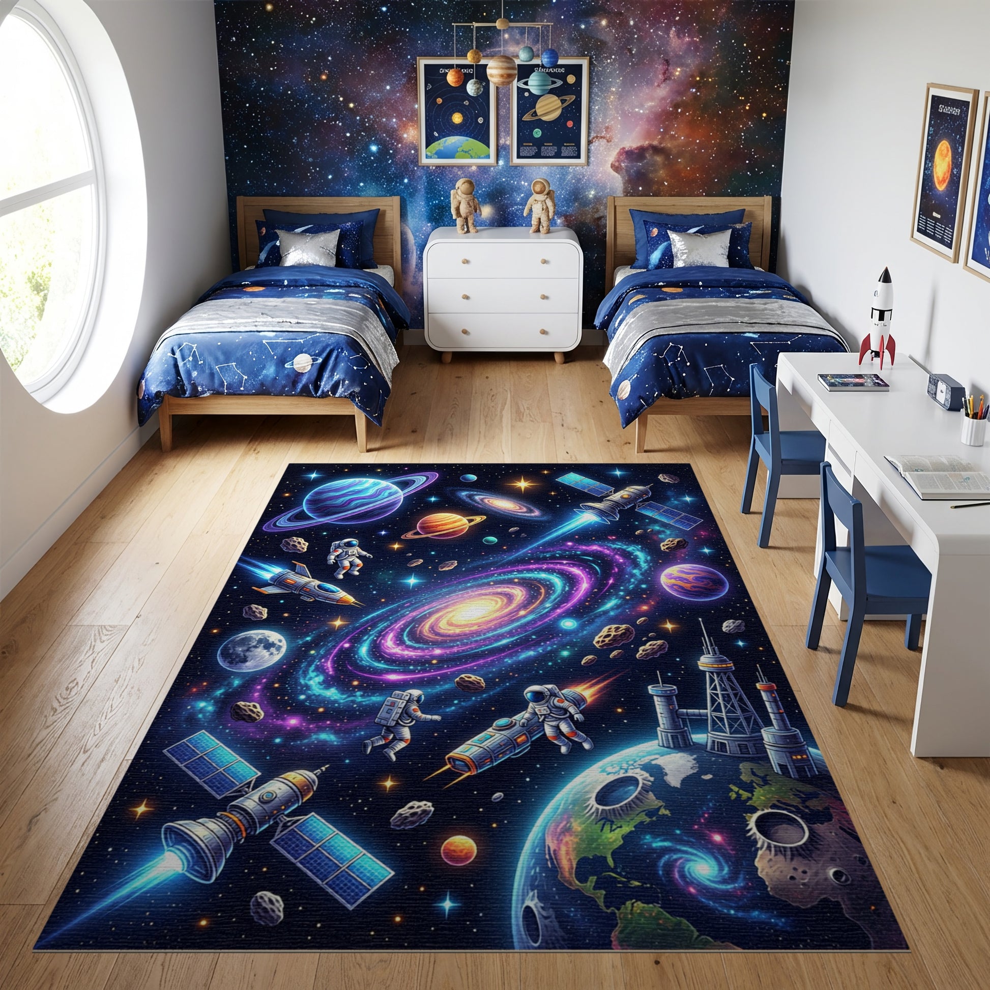 Flatwoven High Traffic Area Rug, Vibrant Neon Cosmic Galaxy Astronauts Rug, Non Slip, Stain Resistant, Washable Area Rugs for Study Room, Playroom, Bedroom Overview: