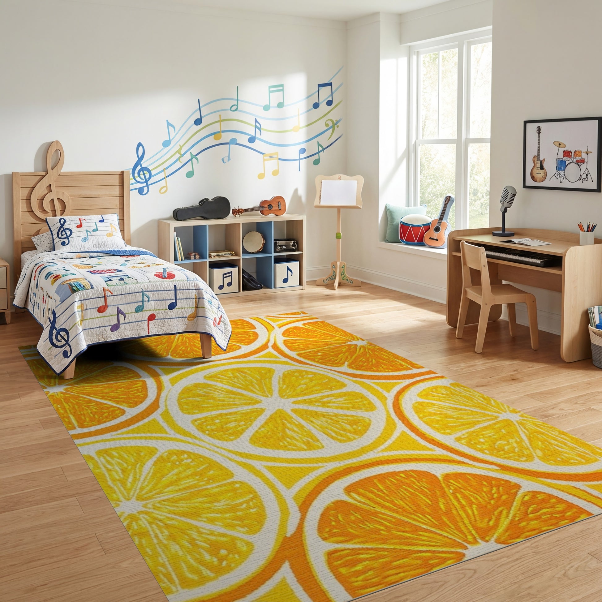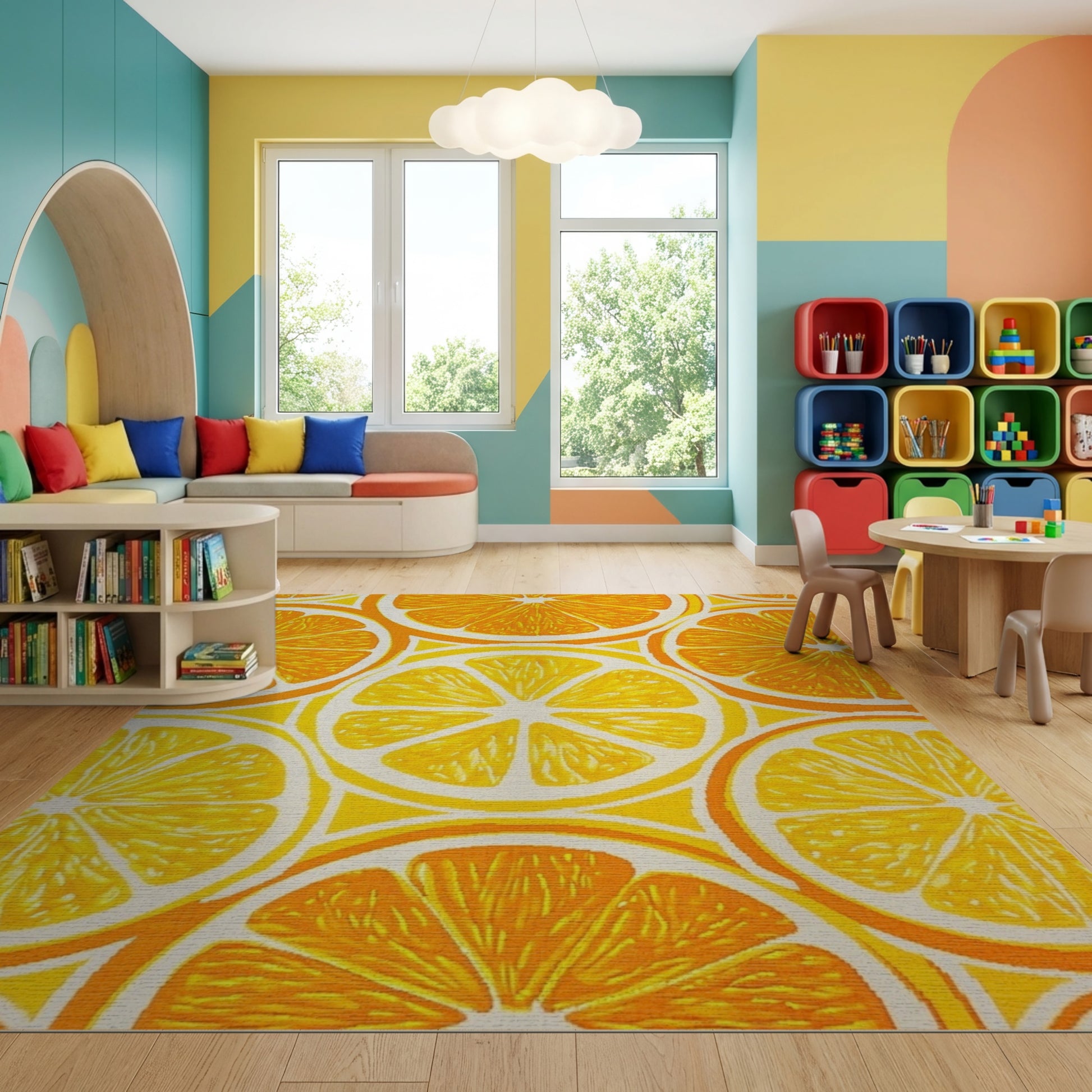 Flatwoven High Traffic Area Rug, Vibrant Orange Slices Bold Pattern Rug, Non Slip, Stain Resistant, Washable Area Rugs for Study Room, Playroom, Bedroom Overview: