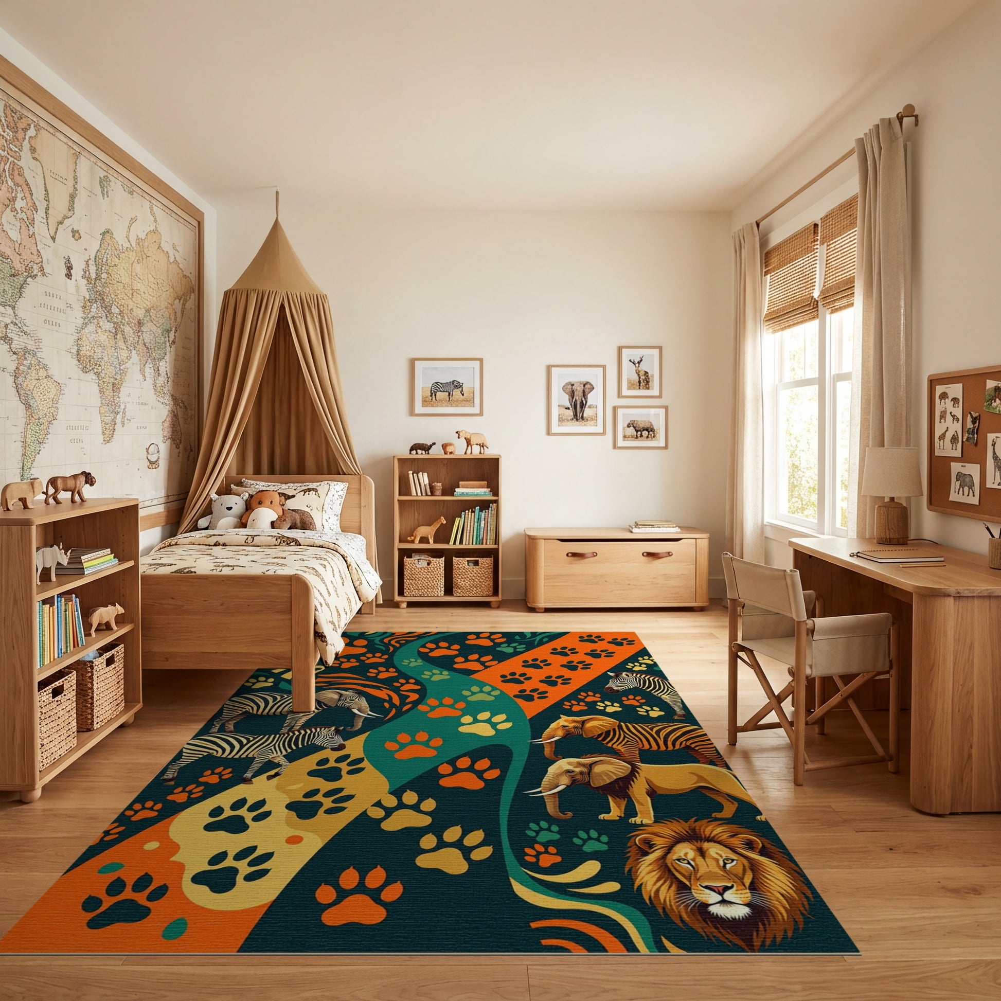 Flatwoven High Traffic Area Rug, Vibrant Paw Prints Zebras Elephants Lion Rug, Non Slip, Stain Resistant, Washable Area Rugs for Study Room, Playroom, Bedroom Overview: