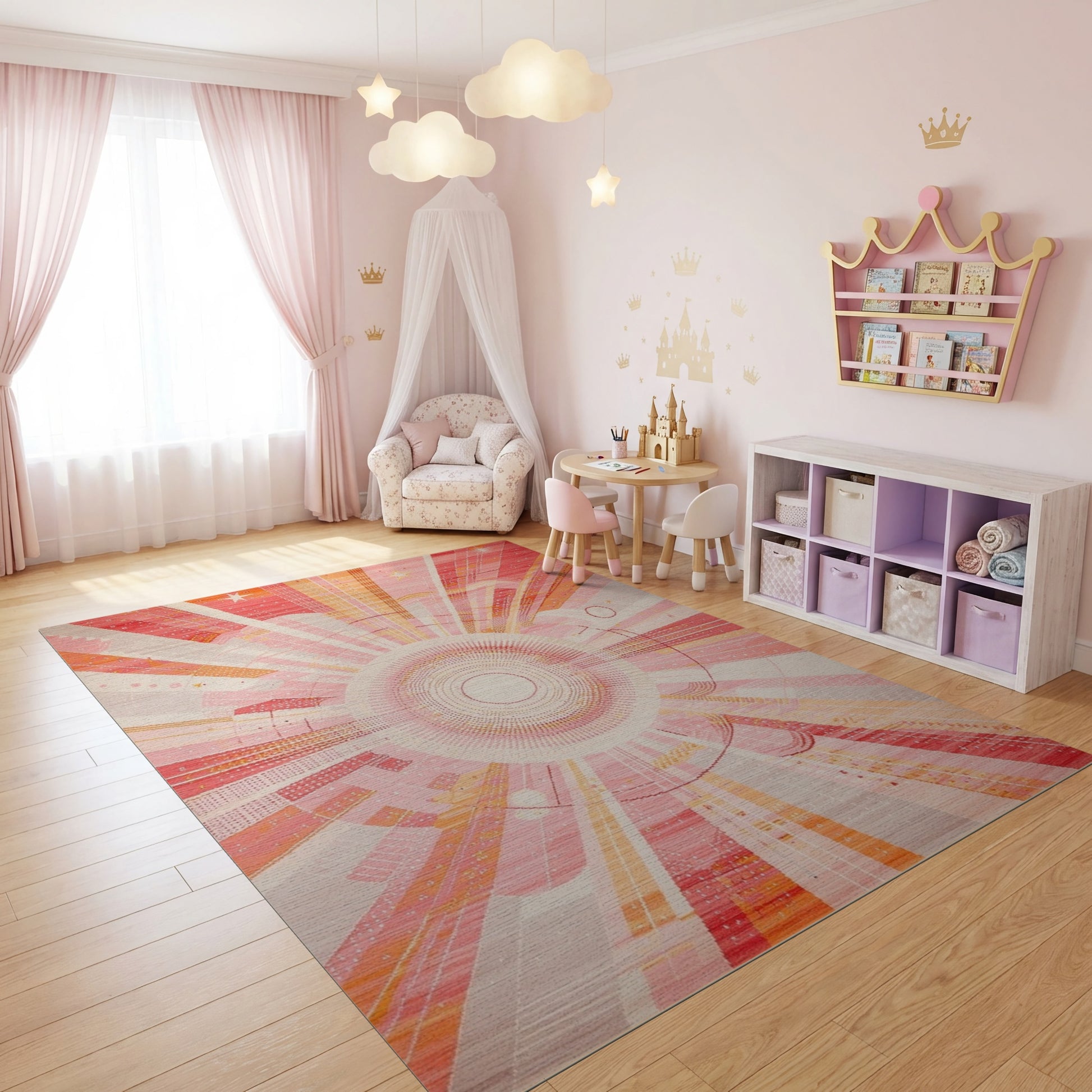 Flatwoven High Traffic Area Rug, Vibrant Pink Radiant Starburst Geometric Rug, Non Slip, Stain Resistant, Washable Area Rugs for Study Room, Playroom, Bedroom Overview: