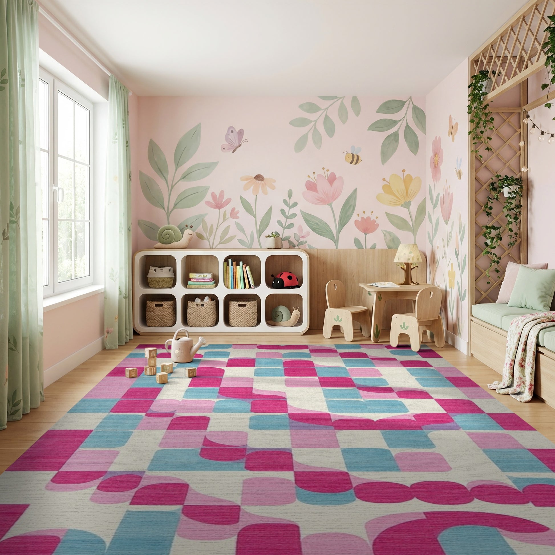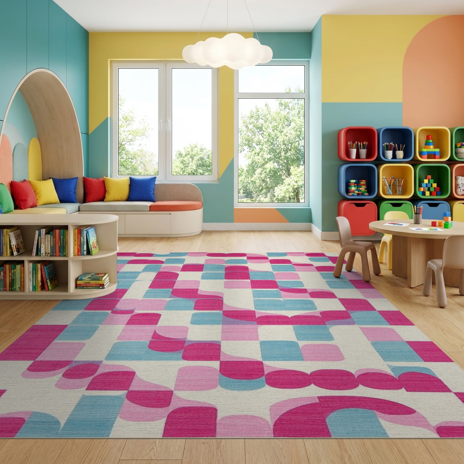 Flatwoven High Traffic Area Rug, Vibrant Pink Teal Curved Geometric Rug, Non Slip, Stain Resistant, Washable Area Rugs for Study Room, Playroom, Bedroom Overview: