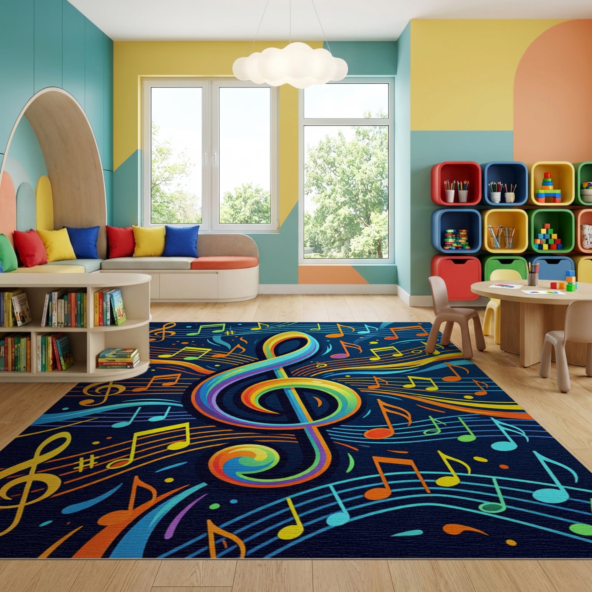Flatwoven High Traffic Area Rug, Vibrant Rainbow Treble Clef Notes Rug, Non Slip, Stain Resistant, Washable Area Rugs for Study Room, Playroom, Bedroom Overview: