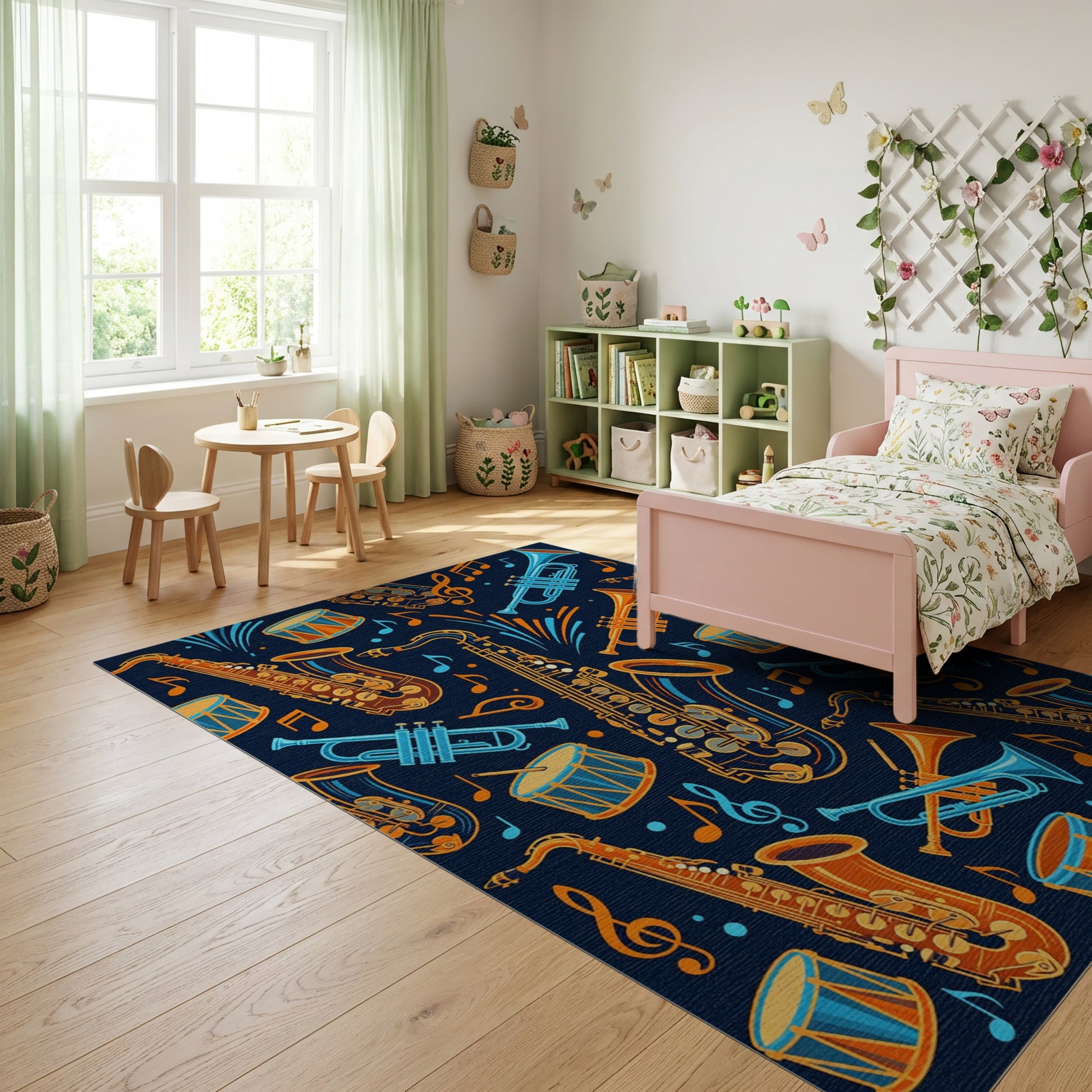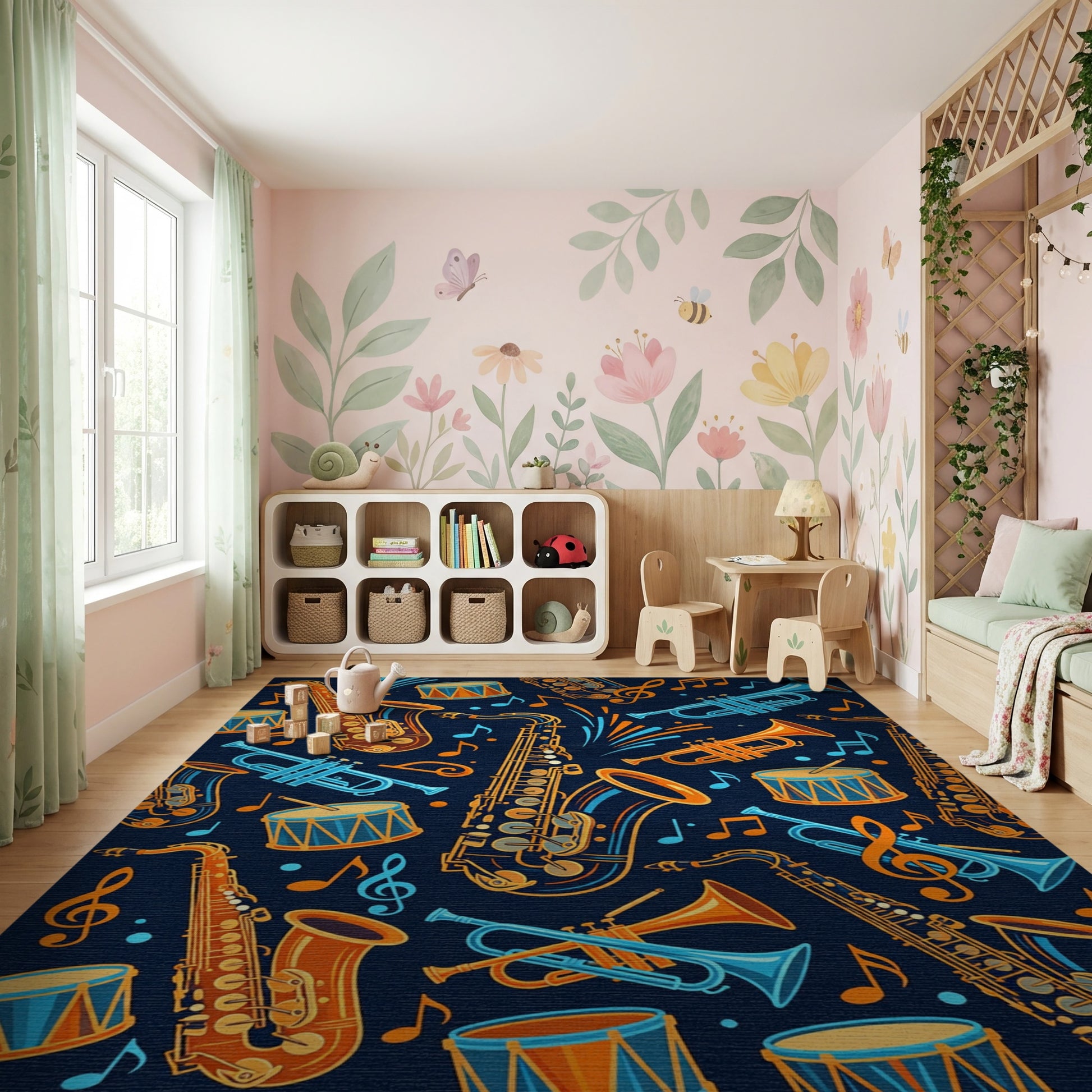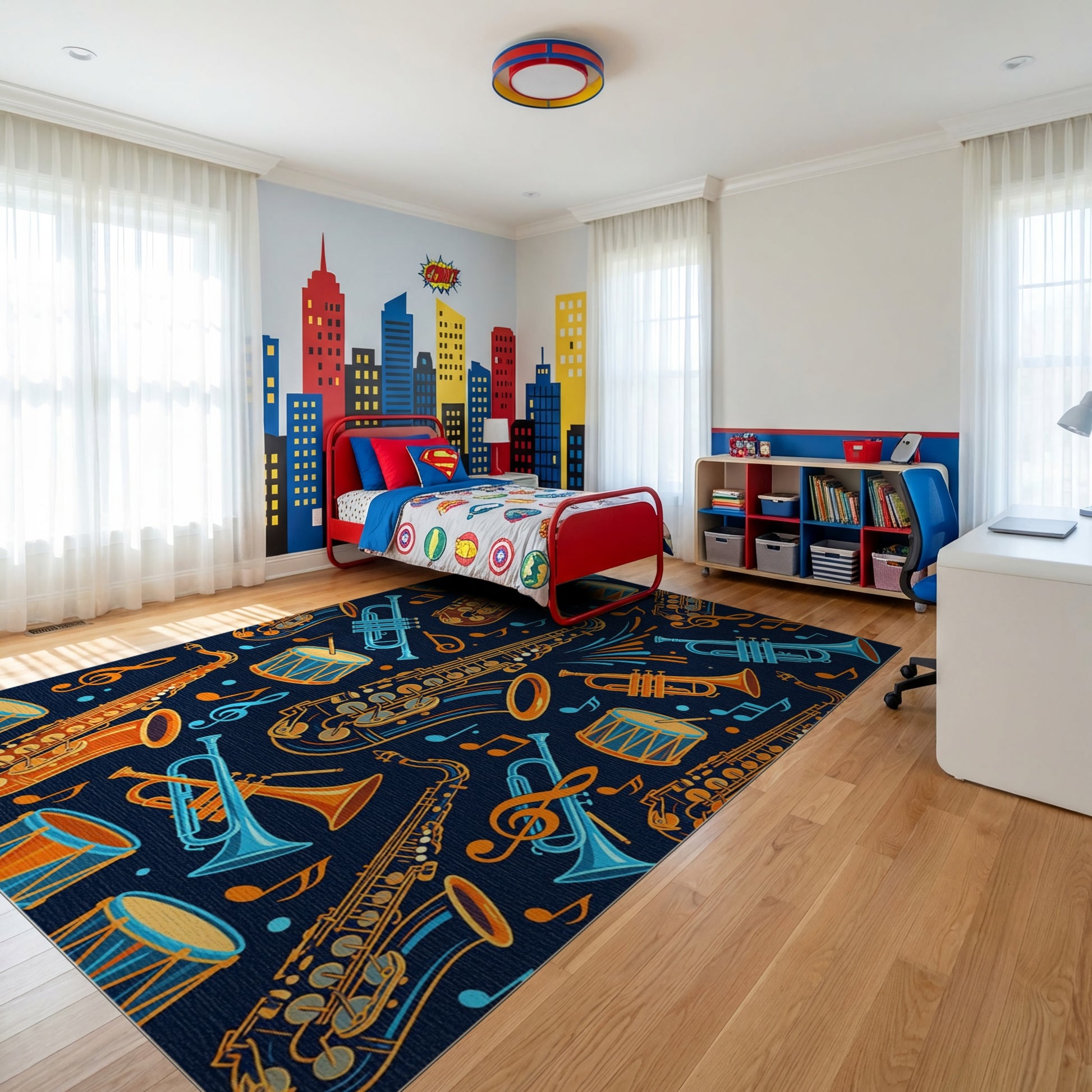 Flatwoven High Traffic Area Rug, Vibrant Saxophone Trumpet Drum Notes Rug, Non Slip, Stain Resistant, Washable Area Rugs for Study Room, Playroom, Bedroom Overview: