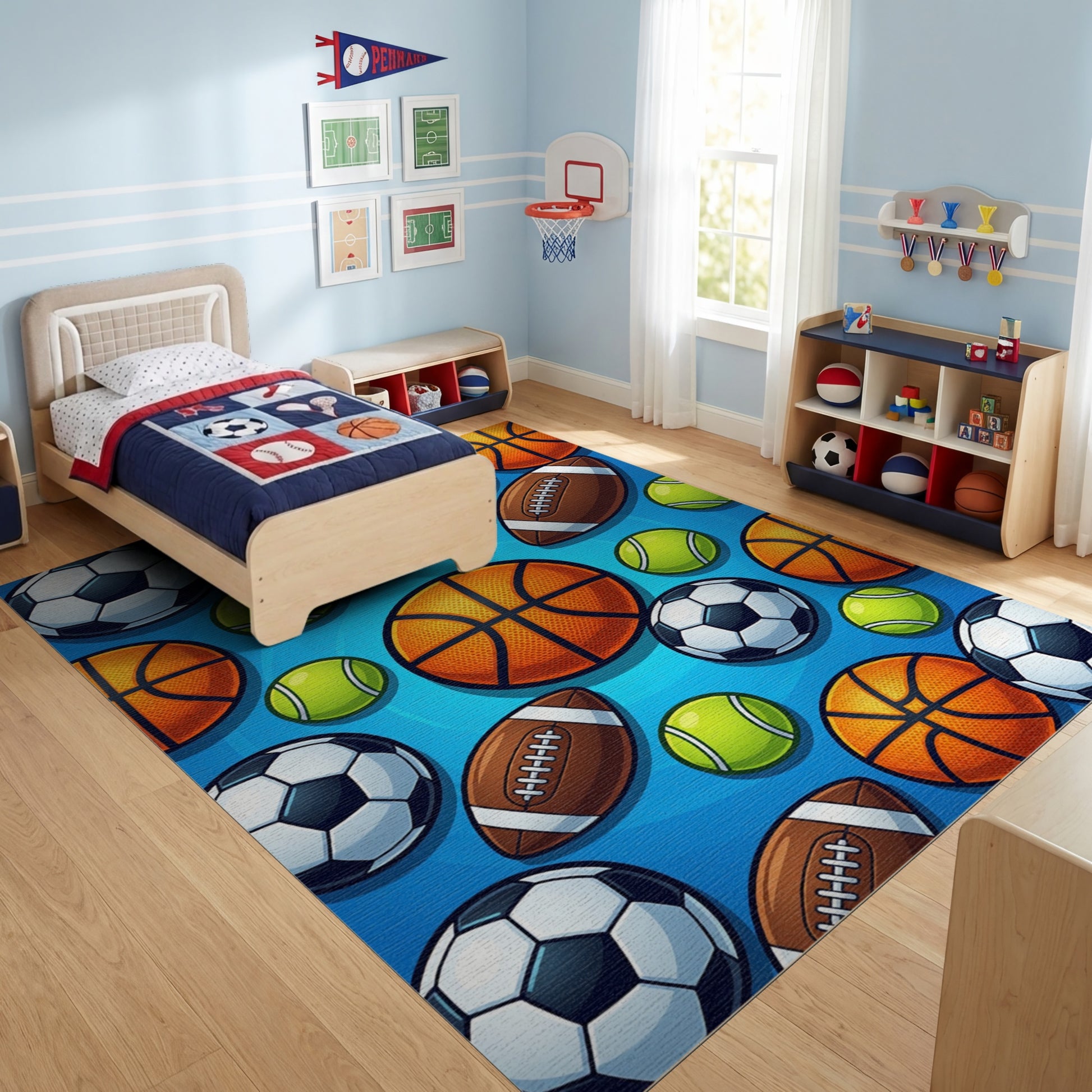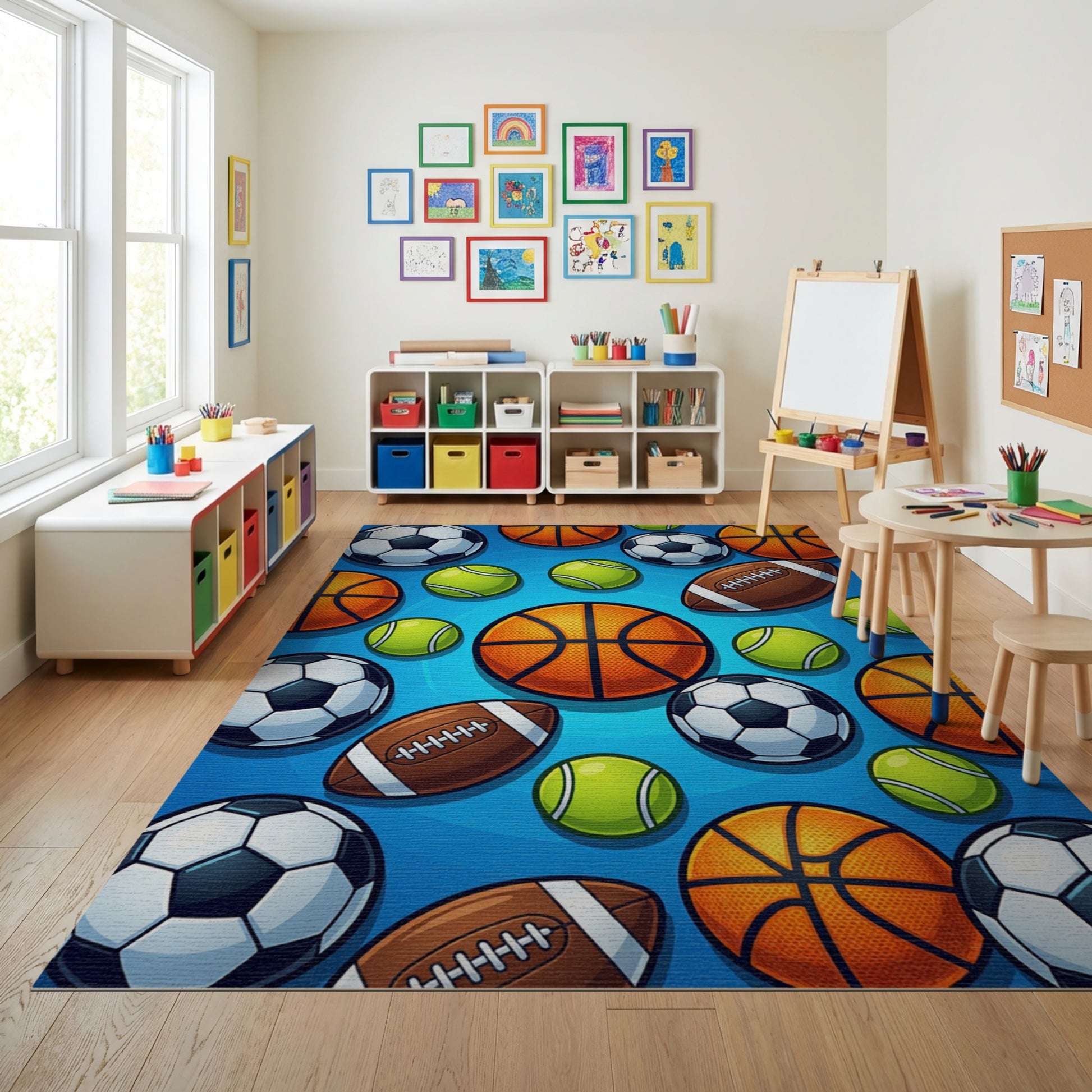 Bring high-energy excitement to your home with this playful sports-themed area rug. Featuring a vibrant variety of basketballs, soccer balls, tennis balls, and footballs set against a striking blue background, this novelty area rug serves as a spirited focal point for playrooms, bedrooms, or dens. Crafted with a soft chenille surface, this flatwoven rug offers everyday comfort that feels great underfoot. Because we know active spaces require practical solutions, this washable rug is designed for easy maintenance, allowing you to simply clean up life's little messes. With a convenient low pile height, it fits seamlessly under furniture and provides easier door clearance. Available in sizes ranging from 2x3 to 8x10, this OEKO-TEX Standard 100 certified piece is thoughtfully tested for harmful substances, ensuring a worry-free choice for your home.