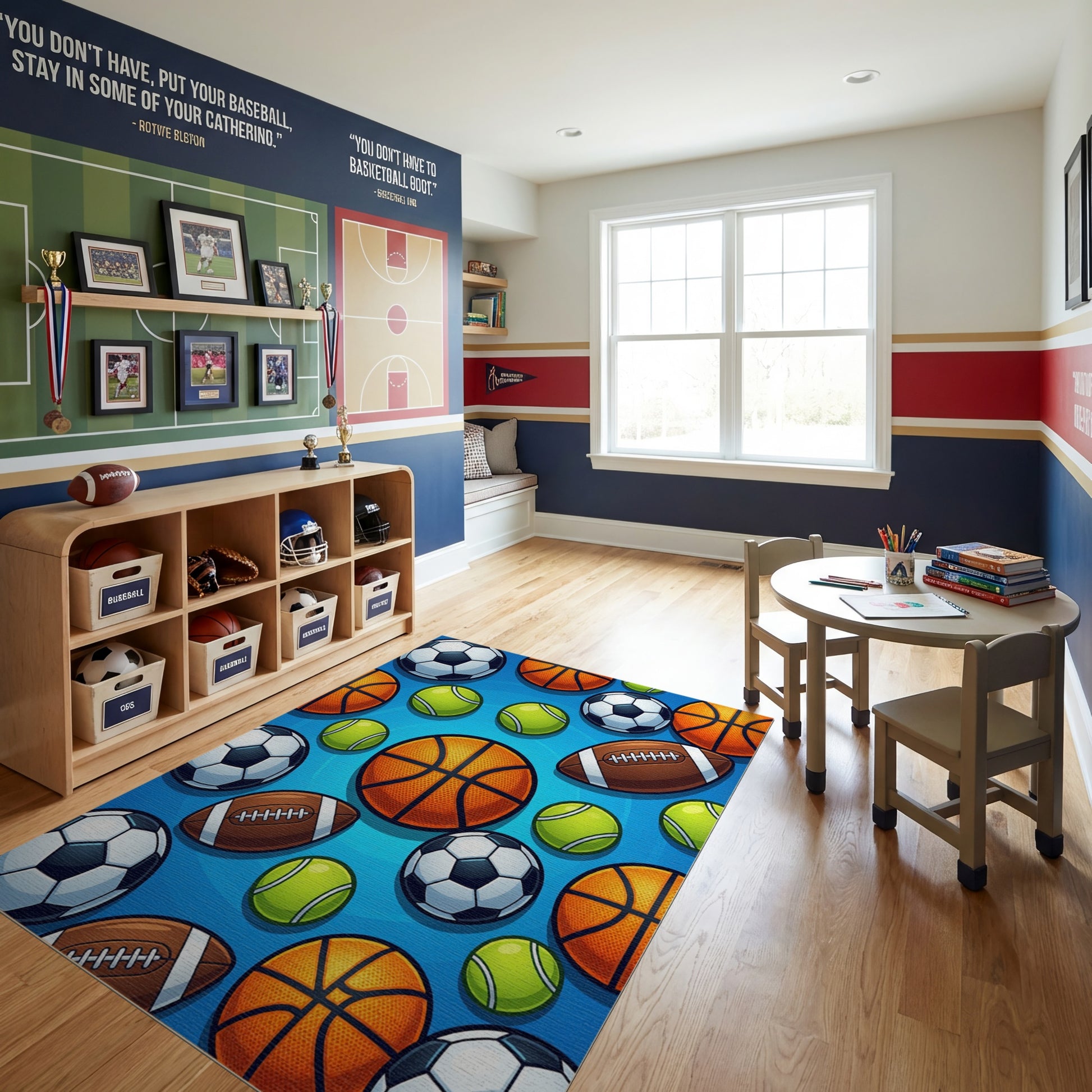 Capture the exhilaration of the game with a design that echoes the kinetic joy of a backyard championship. This rug channels the midcentury illustrative style of vintage sports comics, where graphic boldness meets the optimism of endless Saturday afternoons. Each ball—textured orange basketballs, crisp green tennis spheres, and classic monochrome soccer patterns—is rendered with a rhythmic repetition that mimics the bounce and movement of play. It transforms a floor into a cheering stadium, where the atmosphere shifts from idle quiet to palpable, winning energy. For the spirited family, the future athlete, or the soul that finds solace in the camaraderie of sport, this piece brings a sense of enthusiastic momentum into the home. It is more than just decor; it is an invitation to stay active, play hard, and dream big. Step onto this field and feel the room wake up. Don't just decorate your floor—set the stage for play.