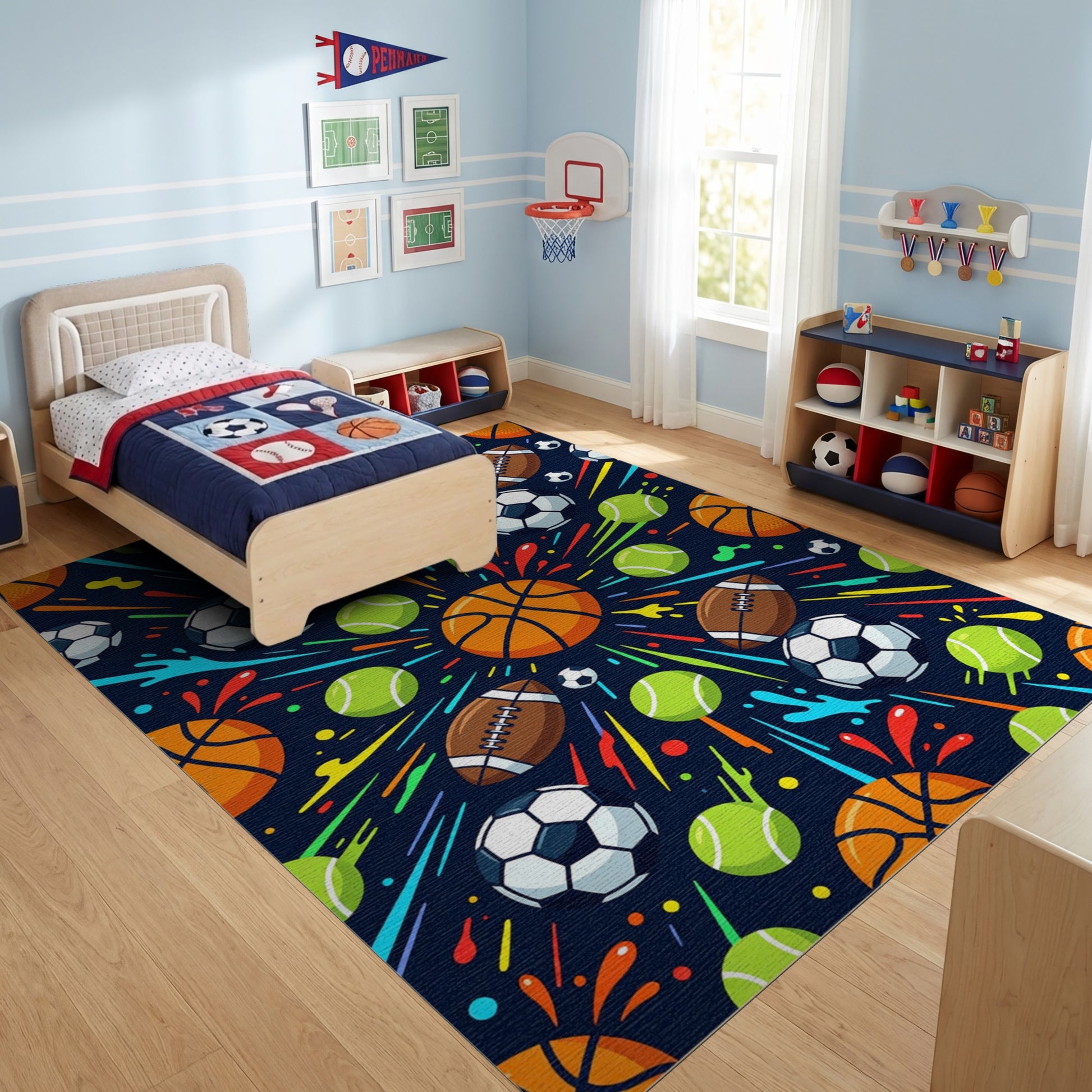 Flatwoven High Traffic Area Rug, Vibrant Sports Balls Explosive Splatter Rug, Non Slip, Stain Resistant, Washable Area Rugs for Study Room, Playroom, Bedroom Overview: