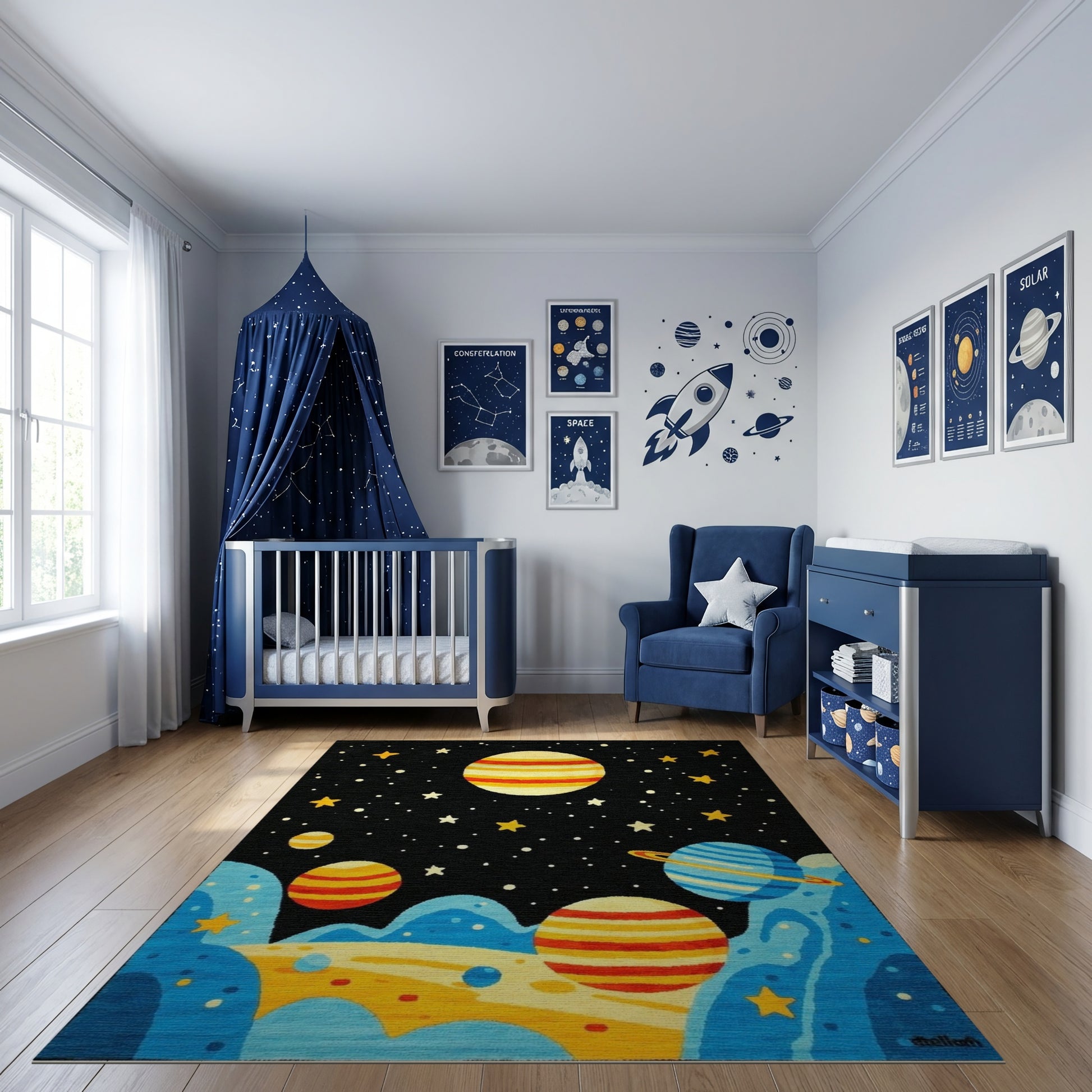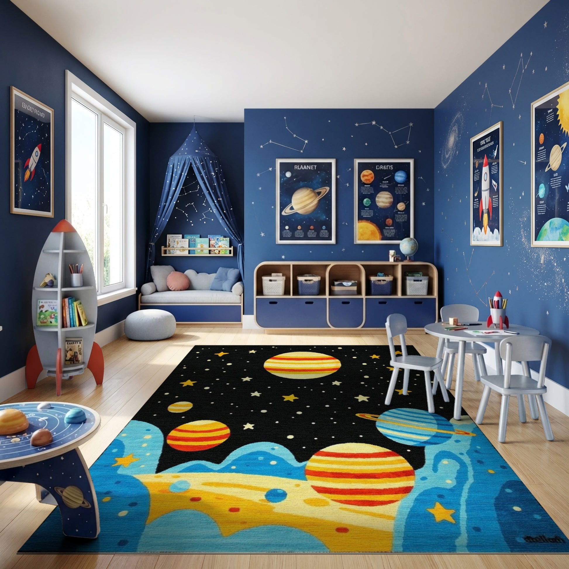 Flatwoven High Traffic Area Rug, Vibrant Striped Planets Stars Cosmic Rug, Non Slip, Stain Resistant, Washable Area Rugs for Study Room, Playroom, Bedroom Overview: