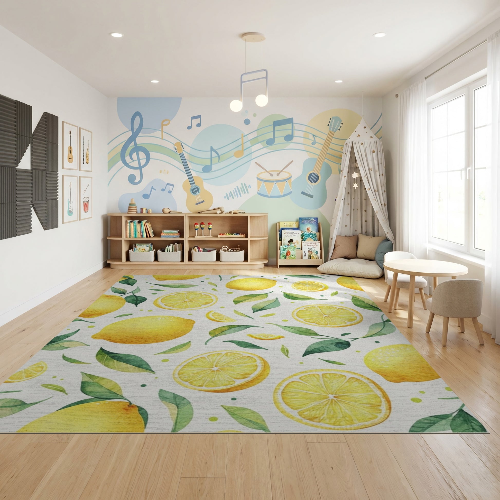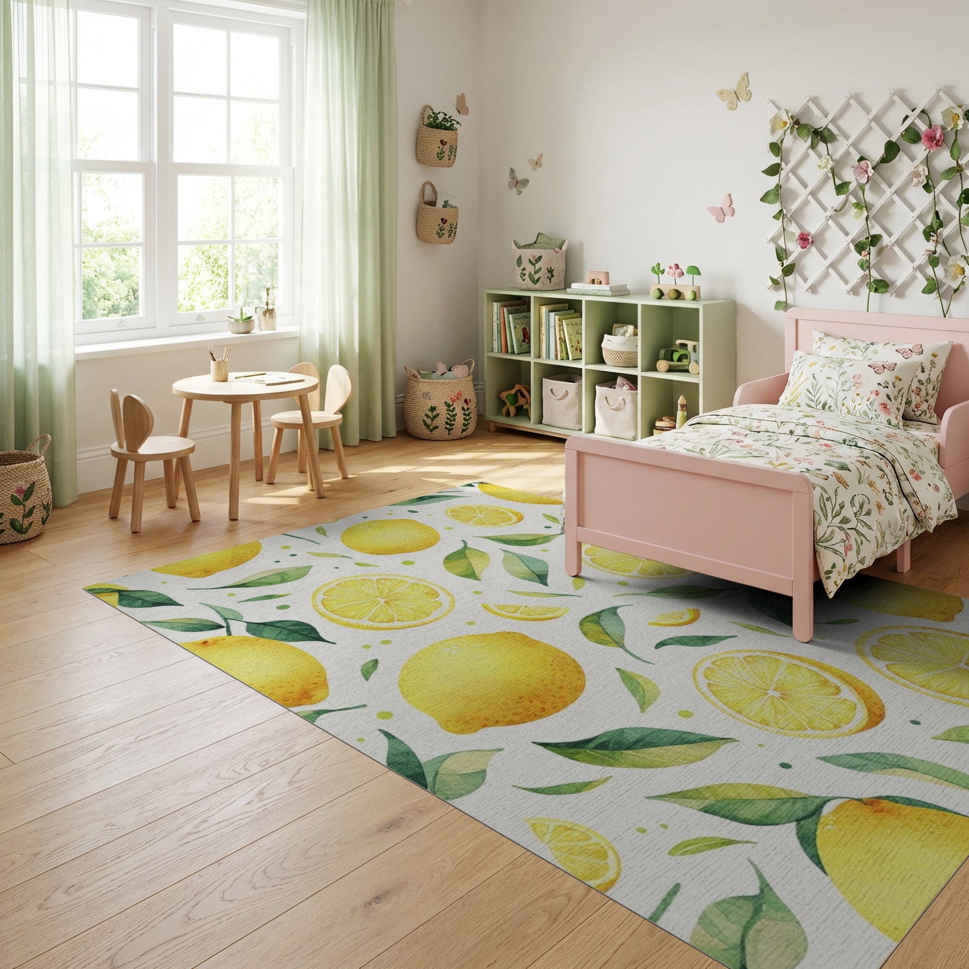 Flatwoven High Traffic Area Rug, Vibrant Watercolor Lemons Green Leaves Rug, Non Slip, Stain Resistant, Washable Area Rugs for Study Room, Playroom, Bedroom Overview:
