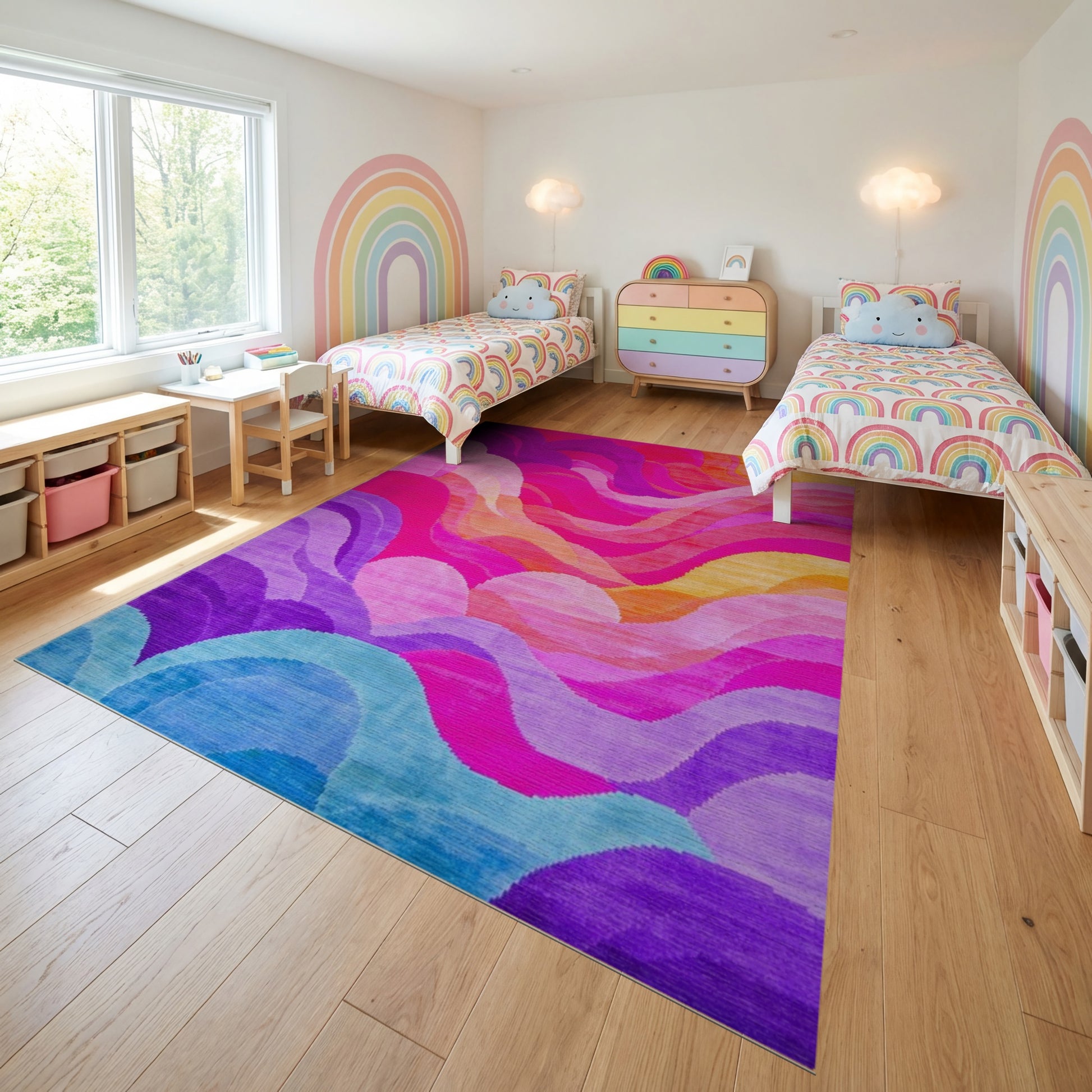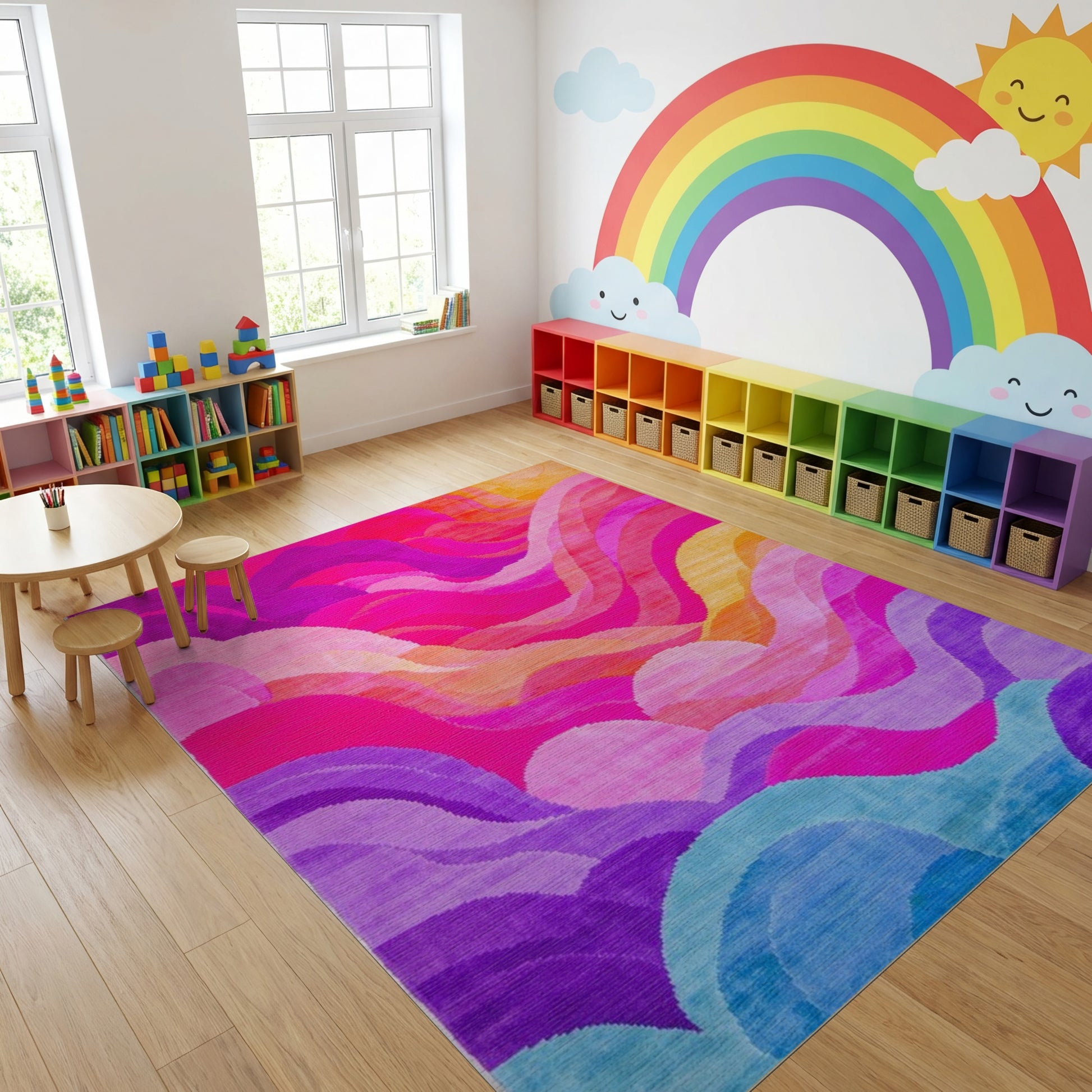 Flatwoven High Traffic Area Rug, Vibrant Wavy Multicolor Gradient Rug, Non Slip, Stain Resistant, Washable Area Rugs for Study Room, Playroom, Bedroom Overview: