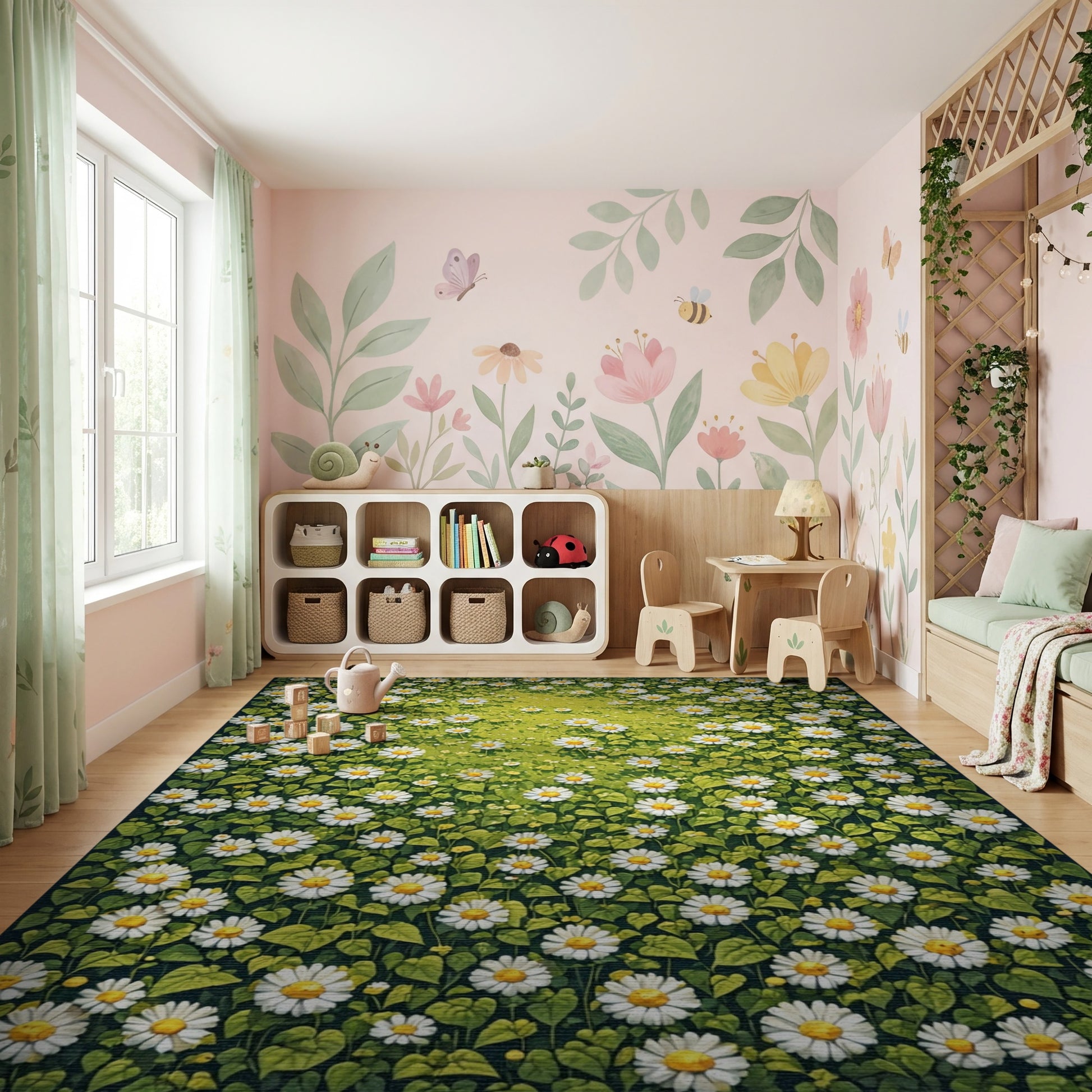 Flatwoven High Traffic Area Rug, Vibrant White Daisy Meadow Rug, Non Slip, Stain Resistant, Washable Area Rugs for Study Room, Playroom, Bedroom Overview: