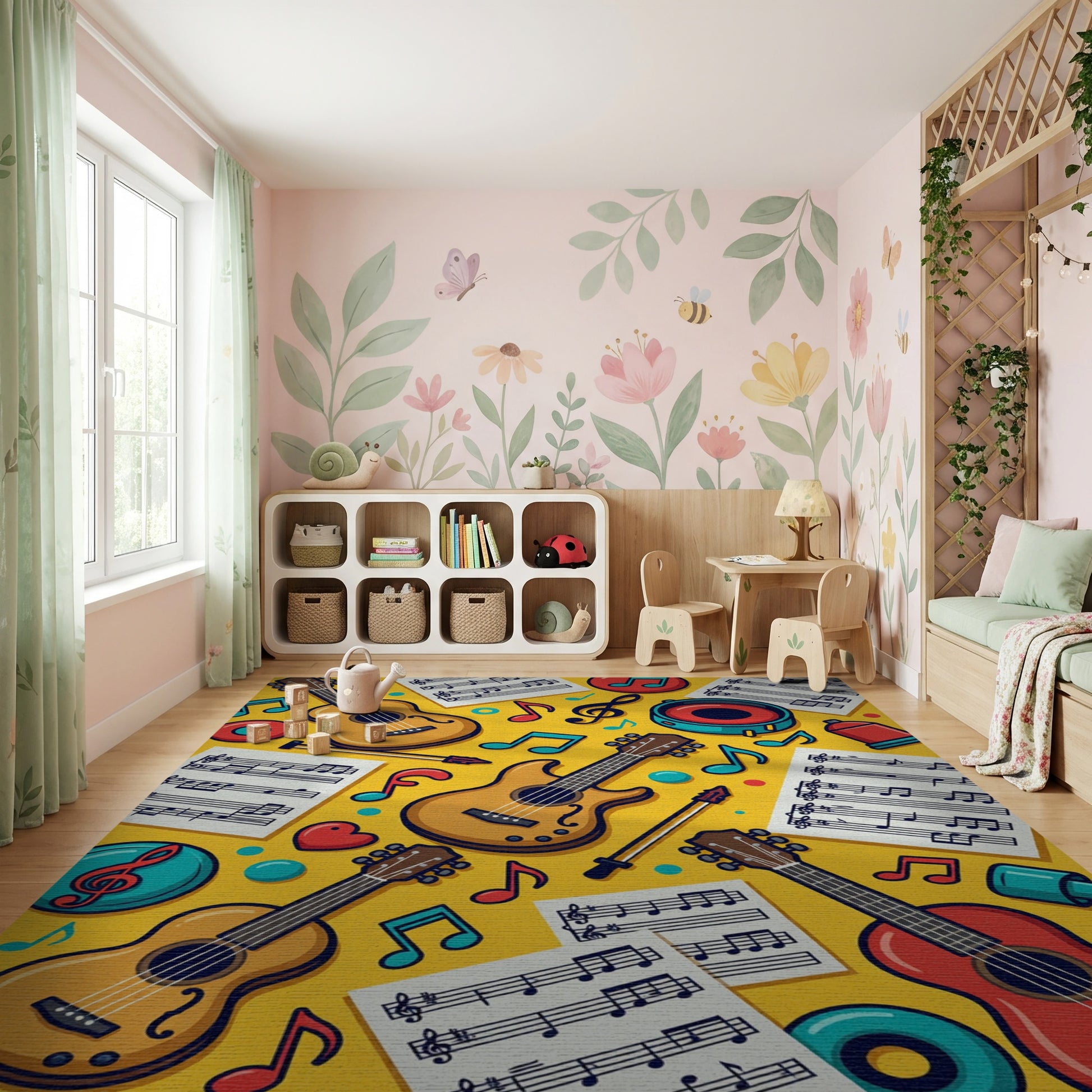 Flatwoven High Traffic Area Rug, Vibrant Yellow Guitars Music Notes Rug, Non Slip, Stain Resistant, Washable Area Rugs for Study Room, Playroom, Bedroom Overview: