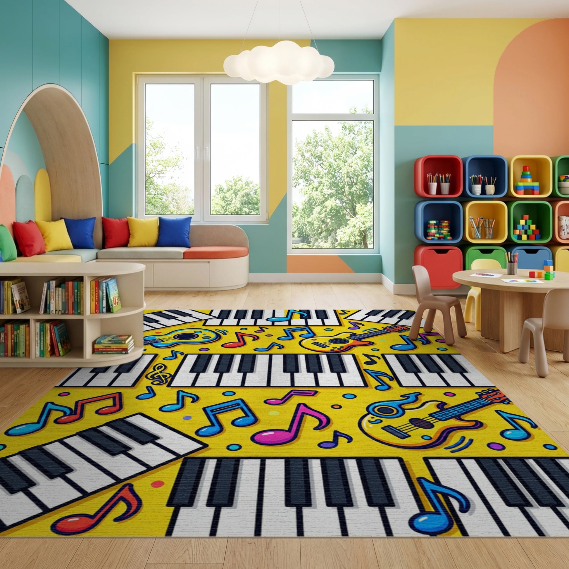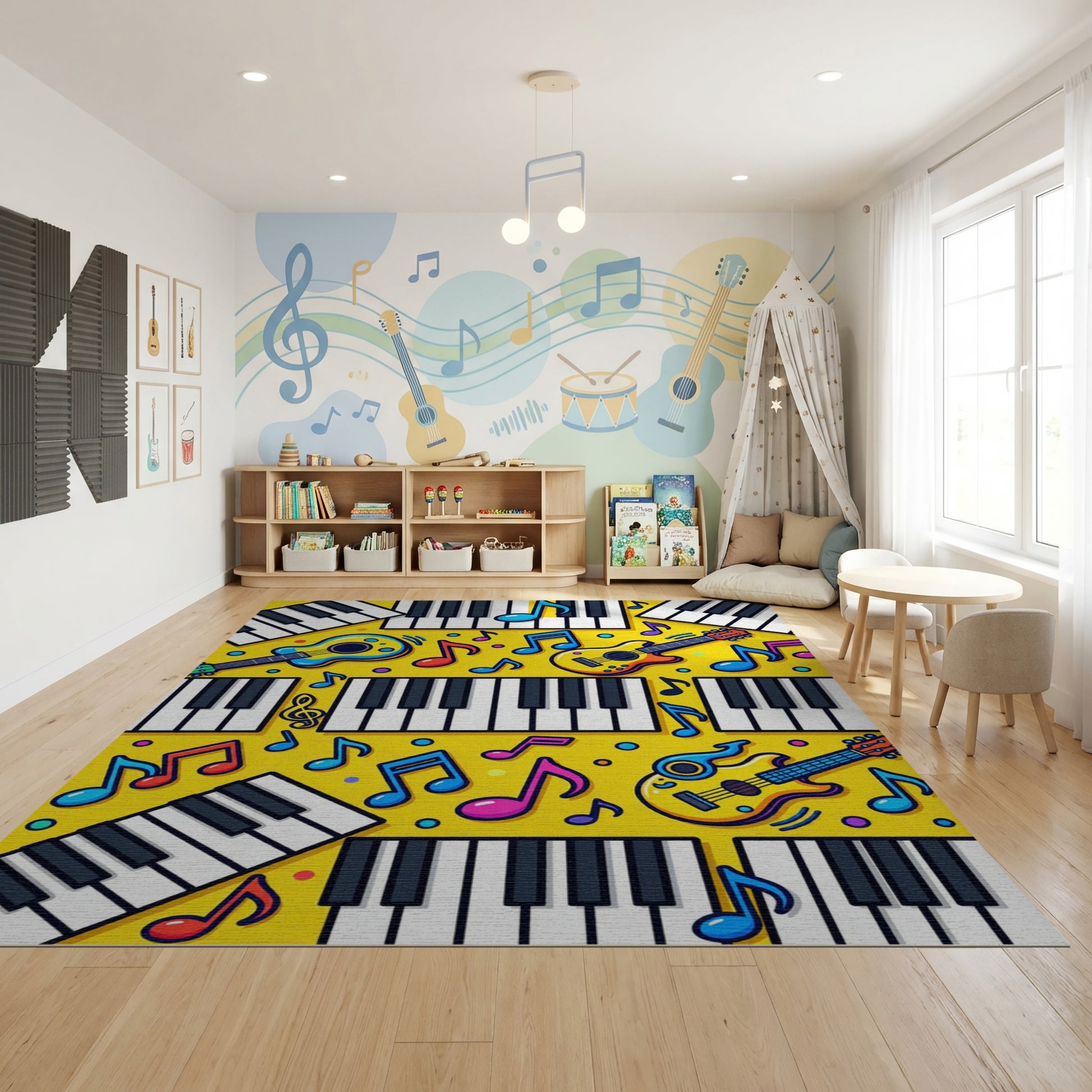 Flatwoven High Traffic Area Rug, Vibrant Yellow Piano Guitar Notes Rug, Non Slip, Stain Resistant, Washable Area Rugs for Study Room, Playroom, Bedroom Overview: