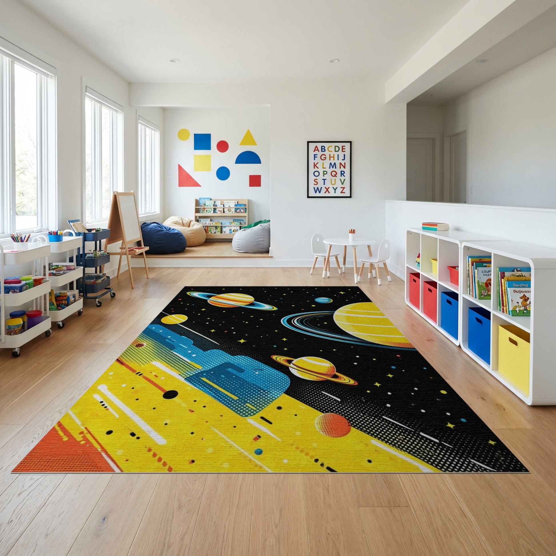 Flatwoven High Traffic Area Rug, Vibrant Yellow Ringed Planets Stars Rug, Non Slip, Stain Resistant, Washable Area Rugs for Study Room, Playroom, Bedroom Overview: