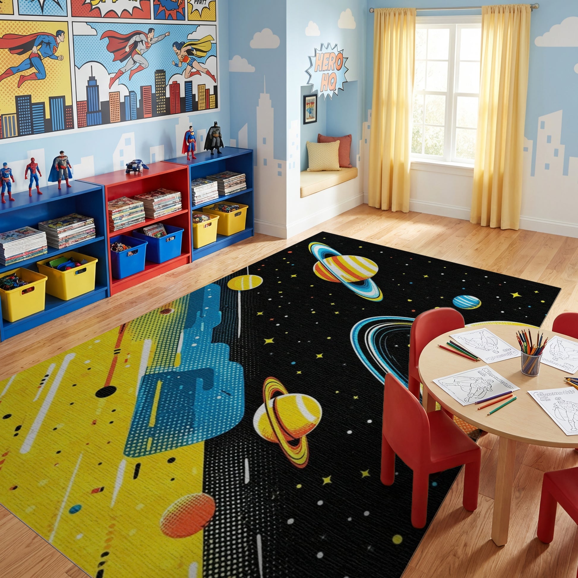 Vibrant Yellow Ringed Planets Stars Rug