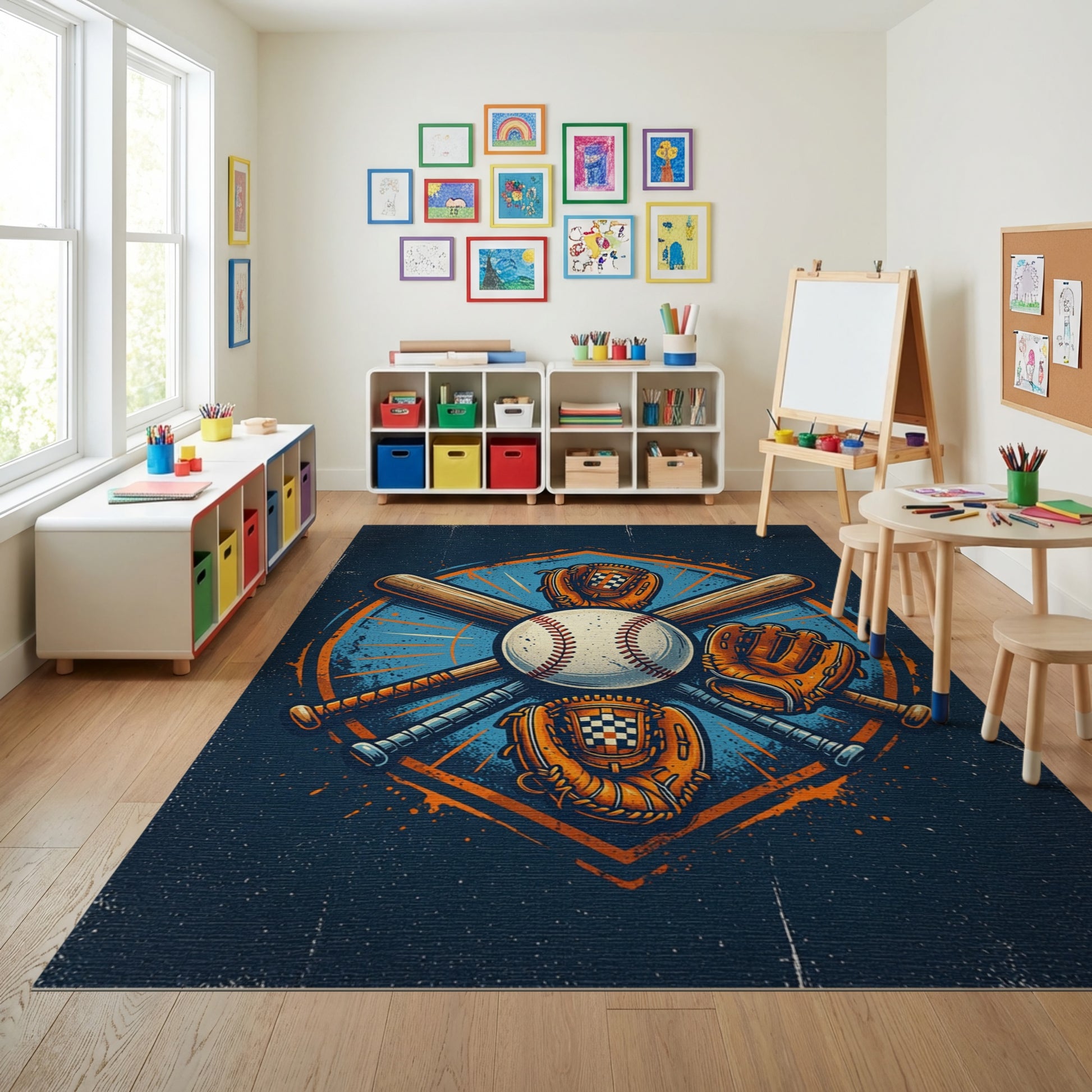 Flatwoven High Traffic Area Rug, Vintage Baseball Bats Gloves Shield Rug, Non Slip, Stain Resistant, Washable Area Rugs for Study Room, Playroom, Bedroom Overview: