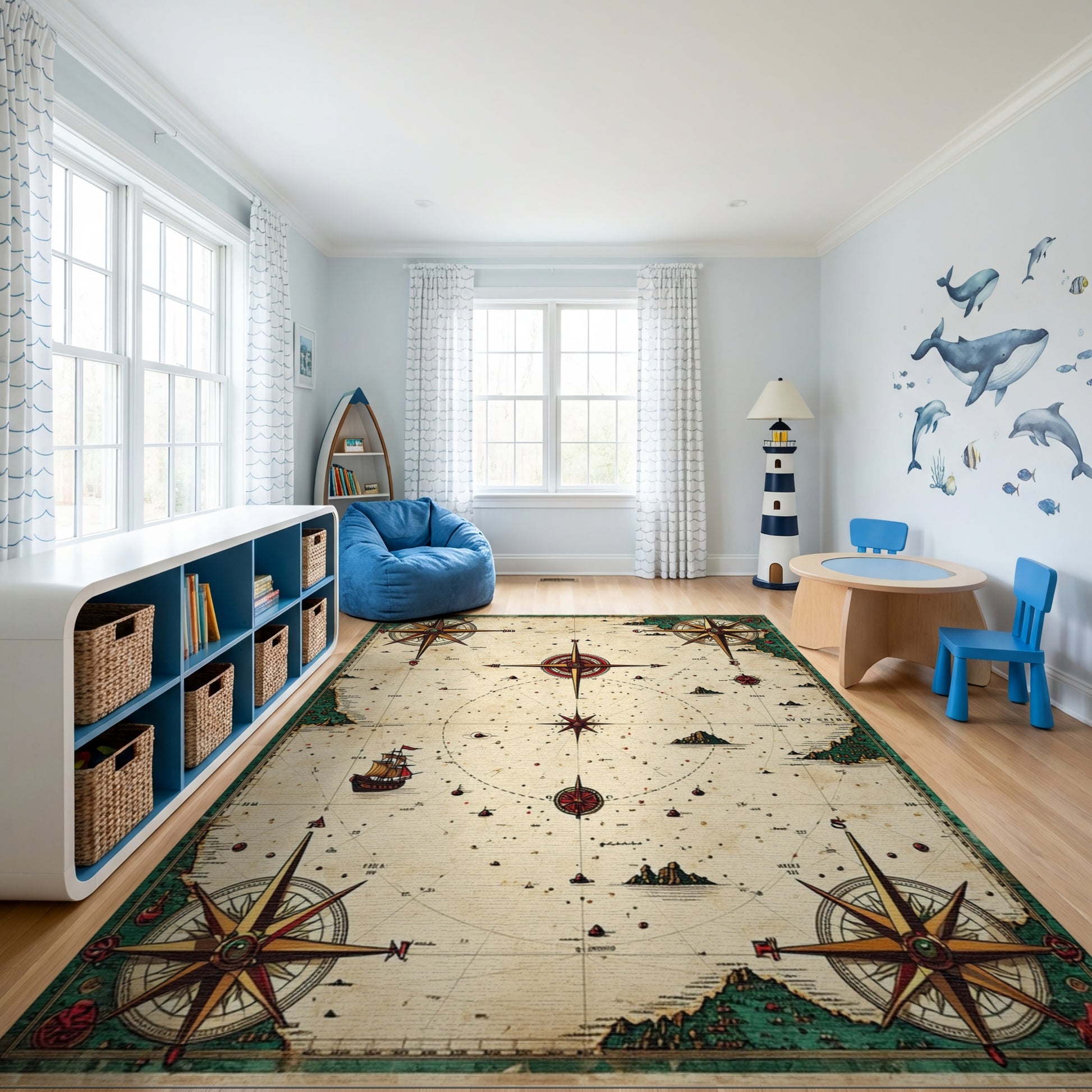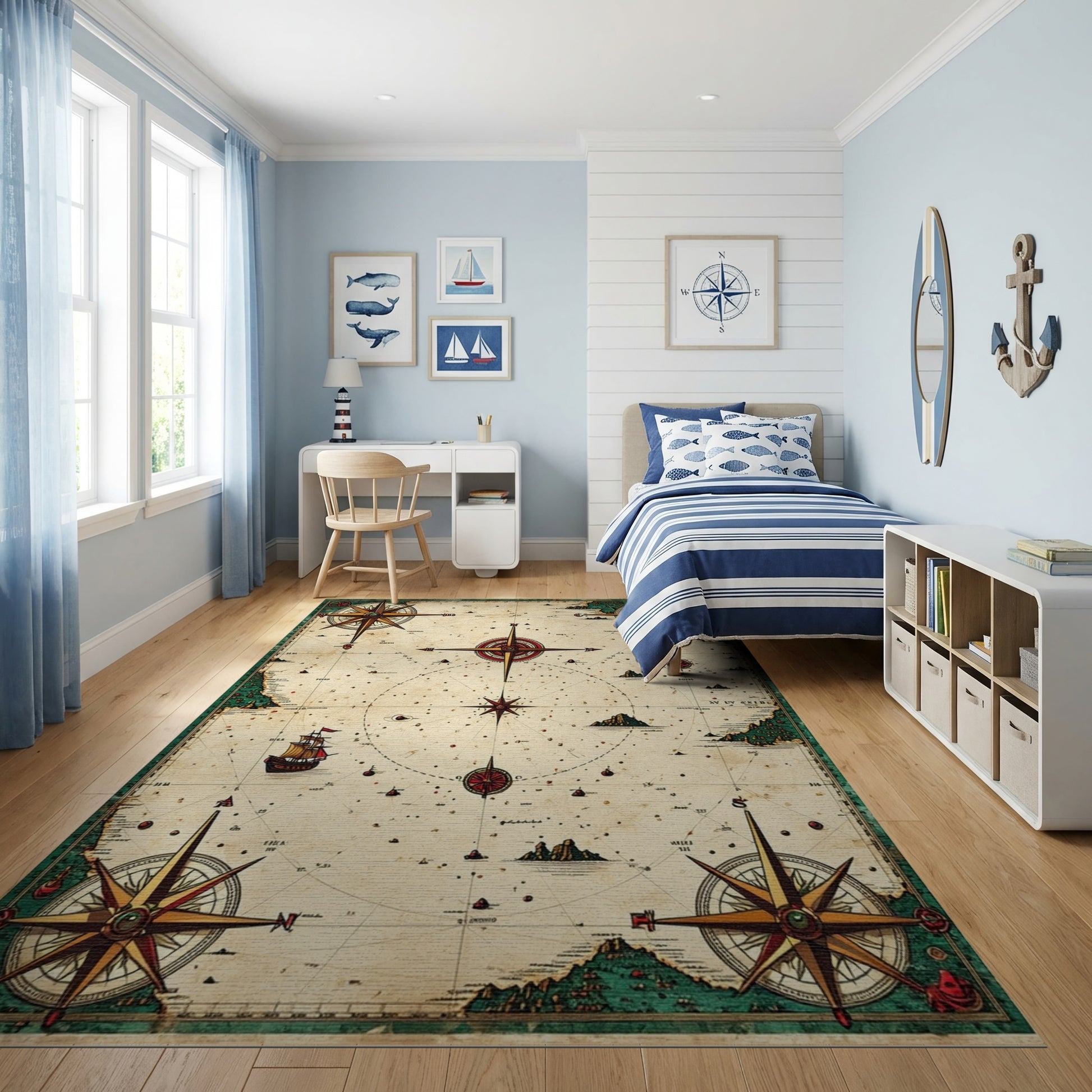 Flatwoven High Traffic Area Rug, Vintage Nautical Compass Map Rug, Non Slip, Stain Resistant, Washable Area Rugs for Study Room, Playroom, Bedroom Overview: