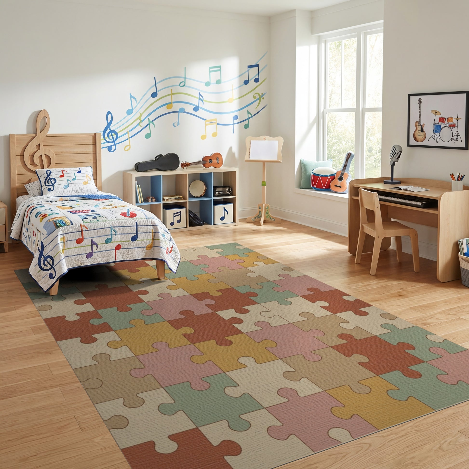 Flatwoven High Traffic Area Rug, Warm Earthy Puzzle Mosaic Rug, Non Slip, Stain Resistant, Washable Area Rugs for Study Room, Playroom, Bedroom Overview: