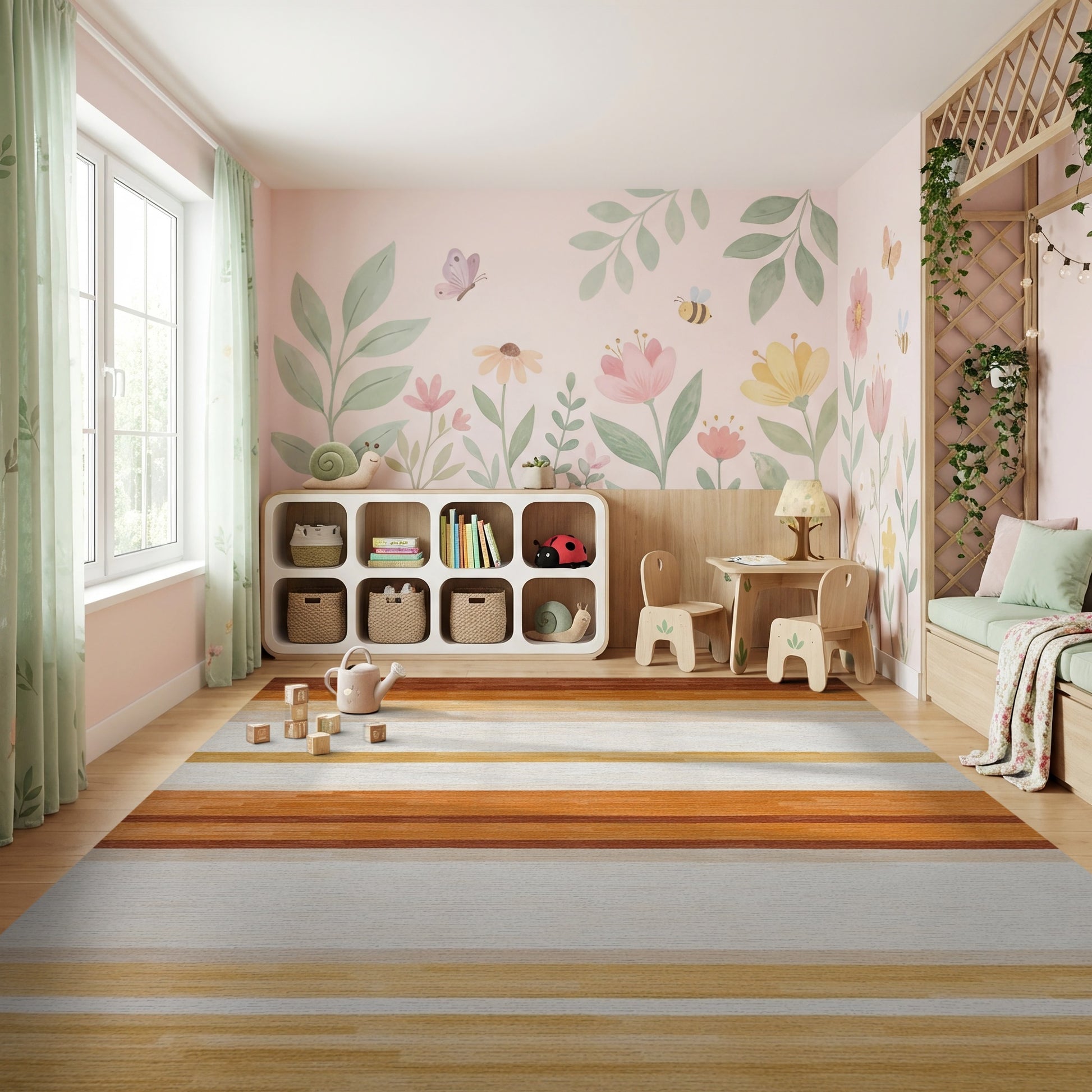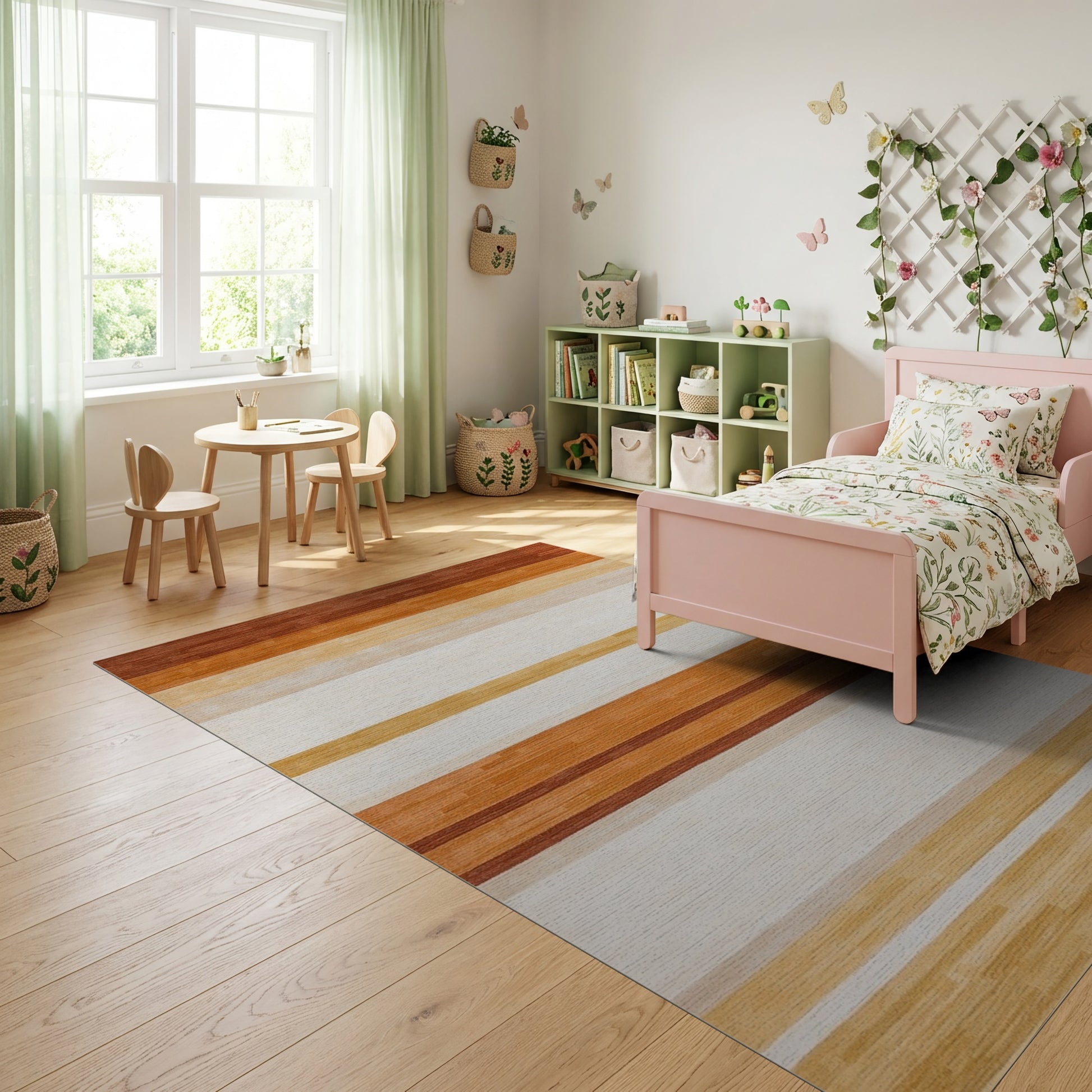Flatwoven High Traffic Area Rug, Warm Horizontal Gradient Stripes Rug, Non Slip, Stain Resistant, Washable Area Rugs for Study Room, Playroom, Bedroom Overview: