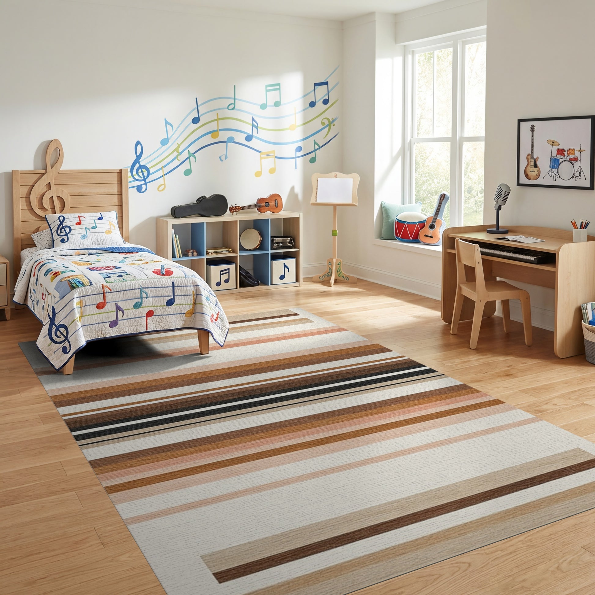 Flatwoven High Traffic Area Rug, Warm Horizontal Striped Earth Tones Rug, Non Slip, Stain Resistant, Washable Area Rugs for Study Room, Playroom, Bedroom Overview: