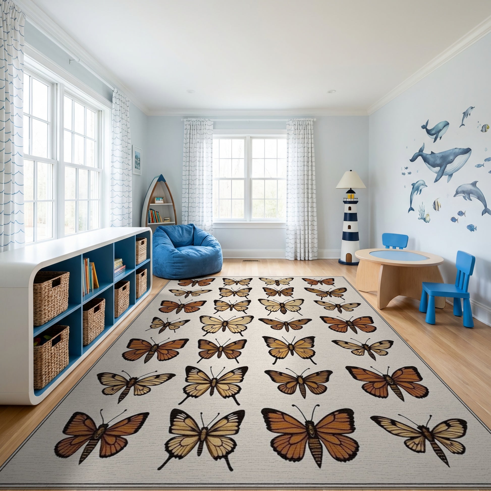 Flatwoven High Traffic Area Rug, Warm Tones Butterfly Pattern Rug, Non Slip, Stain Resistant, Washable Area Rugs for Study Room, Playroom, Bedroom Overview: