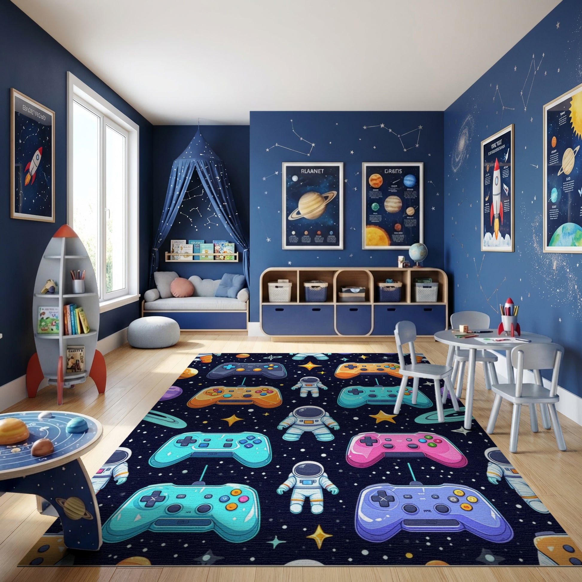 Flatwoven High Traffic Area Rug, Whimsical Astronauts Game Controllers Cosmic Rug, Non Slip, Stain Resistant, Washable Area Rugs for Study Room, Playroom, Bedroom Overview: