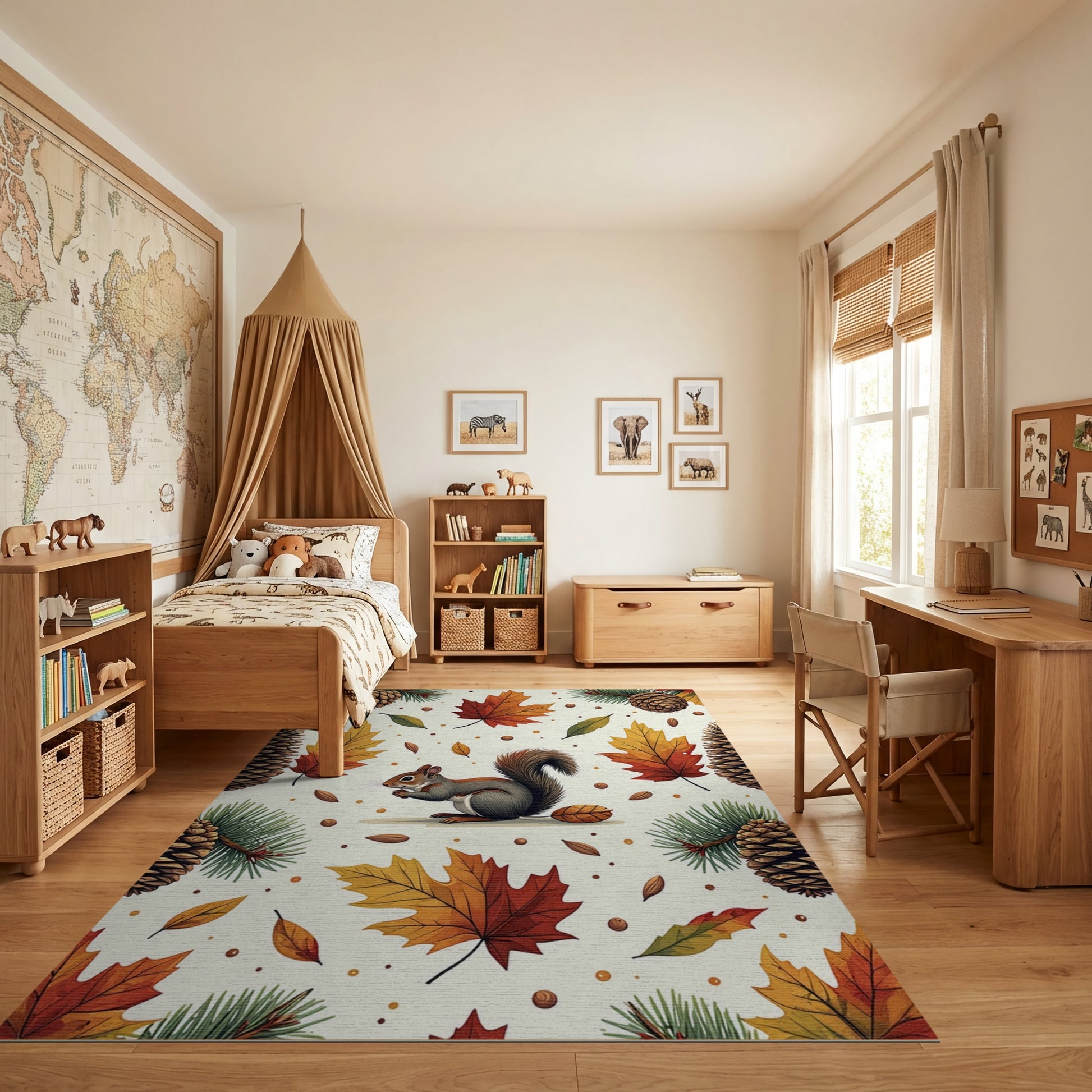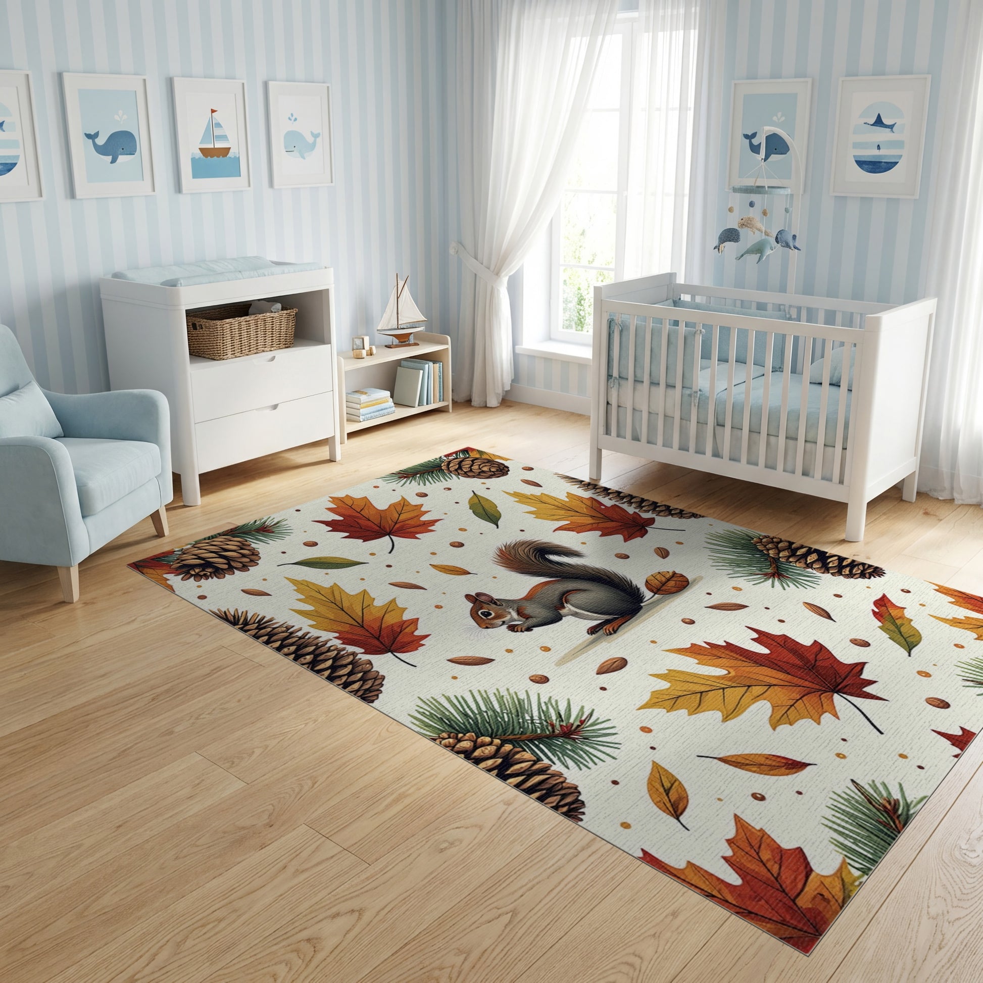 Whimsical Autumn Squirrel Pinecone Leaf Rug
