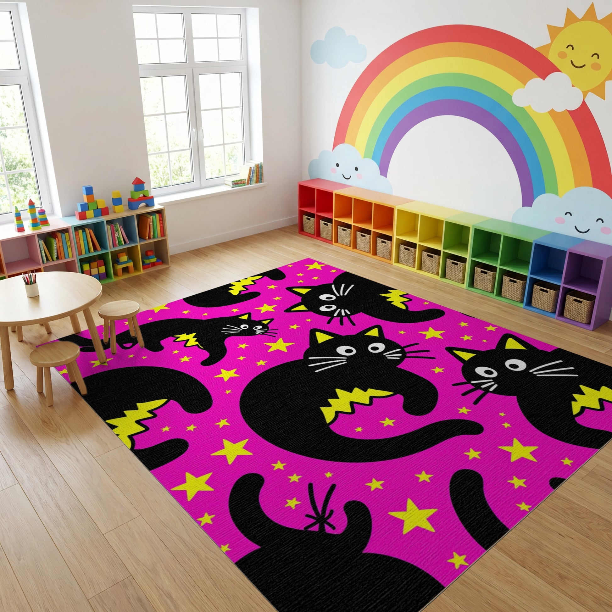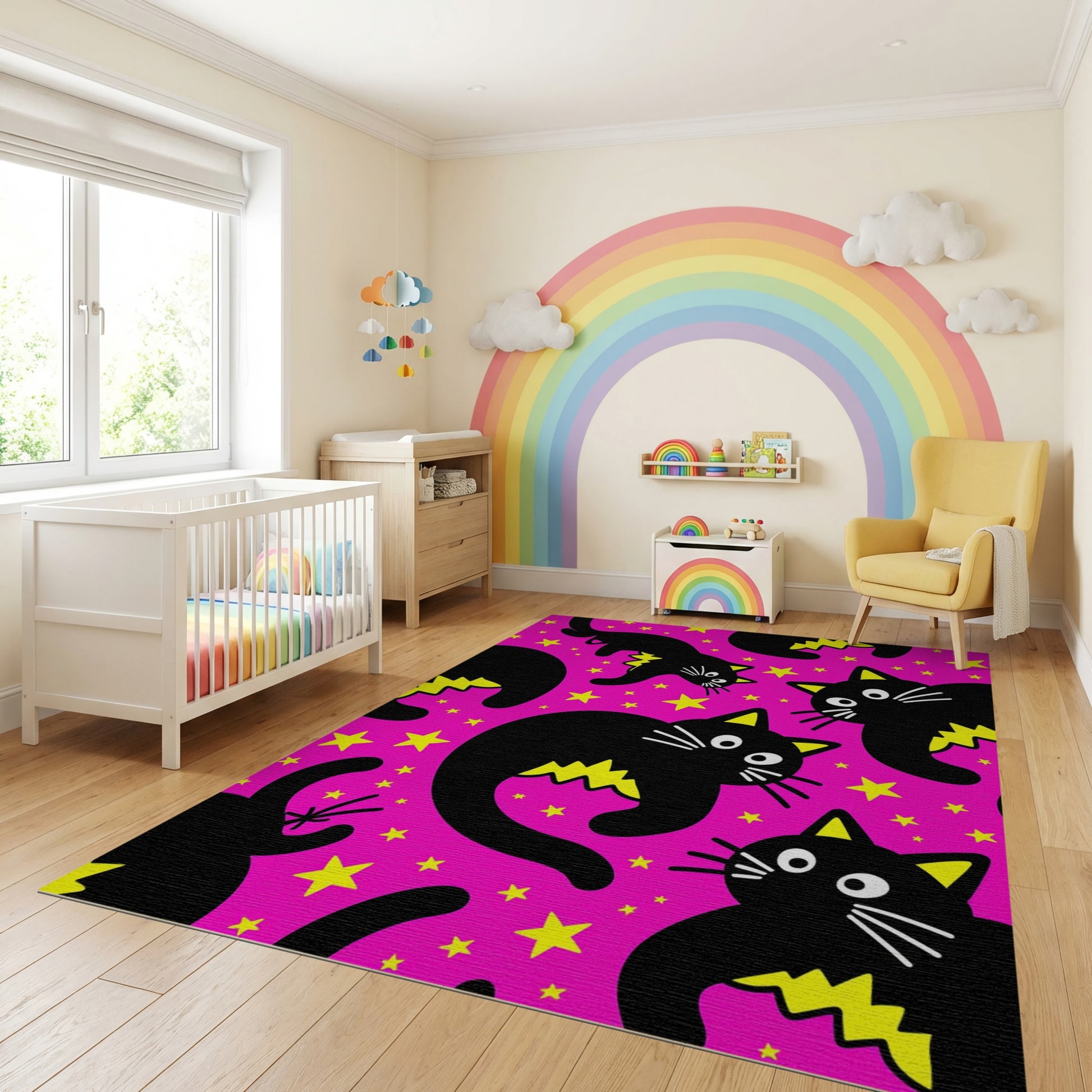 Flatwoven High Traffic Area Rug, Whimsical Black Cats Stars Lightning Pink Rug, Non Slip, Stain Resistant, Washable Area Rugs for Study Room, Playroom, Bedroom Overview: