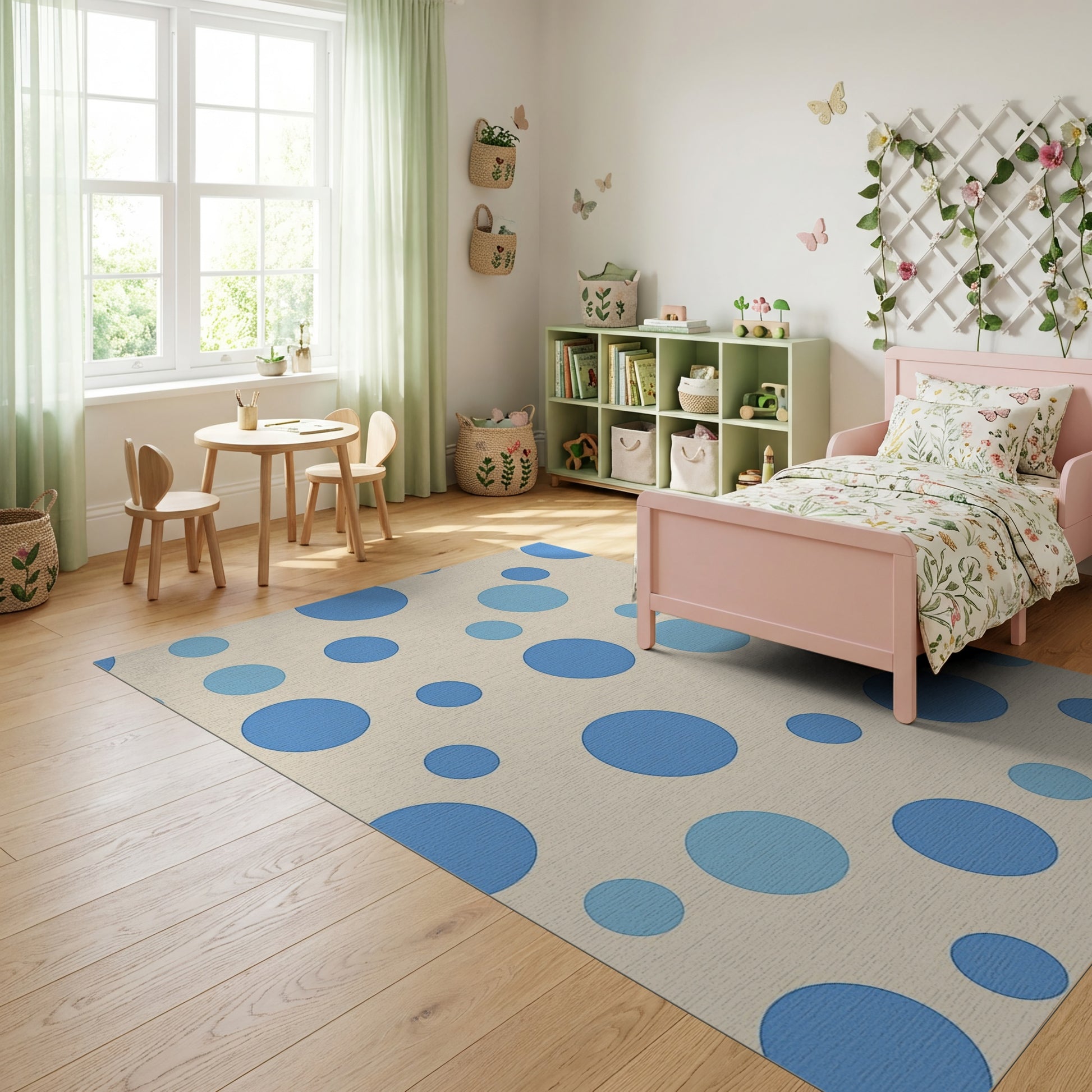Flatwoven High Traffic Area Rug, Whimsical Blue Polka Dots Rug, Non Slip, Stain Resistant, Washable Area Rugs for Study Room, Playroom, Bedroom Overview: