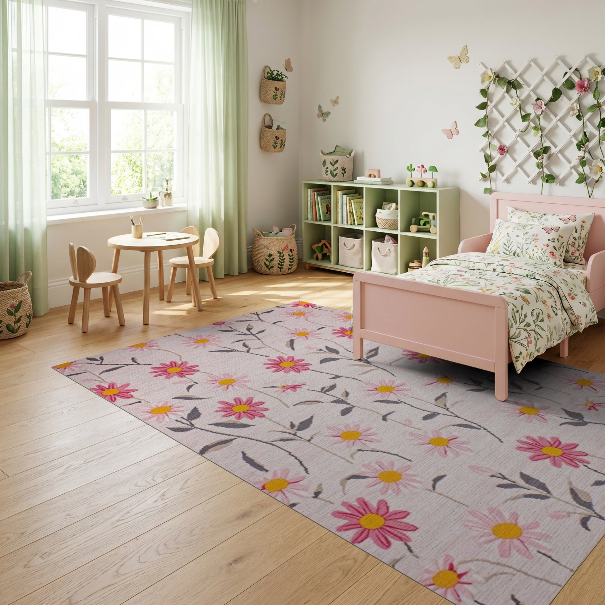 Flatwoven High Traffic Area Rug, Whimsical Blush Pink Daisy Stem Rug, Non Slip, Stain Resistant, Washable Area Rugs for Study Room, Playroom, Bedroom Overview: