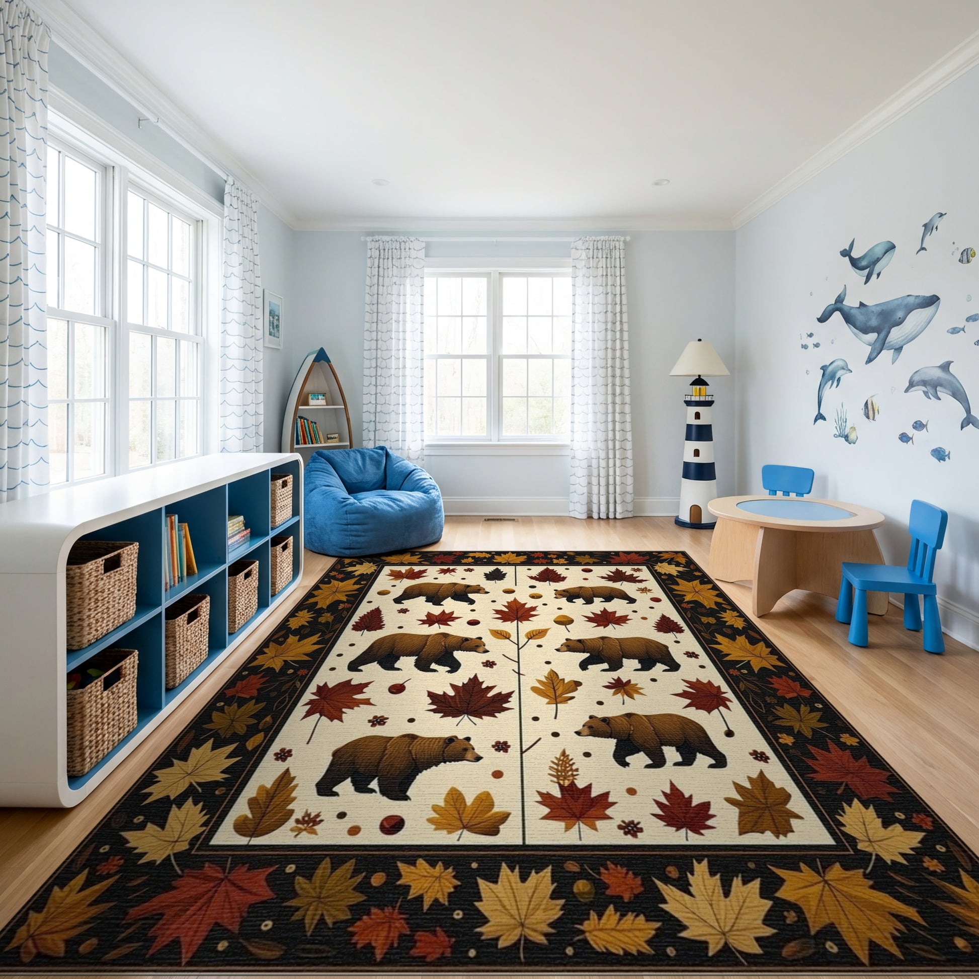 Flatwoven High Traffic Area Rug, Whimsical Brown Bears Autumn Leaves Rug, Non Slip, Stain Resistant, Washable Area Rugs for Study Room, Playroom, Bedroom Overview: