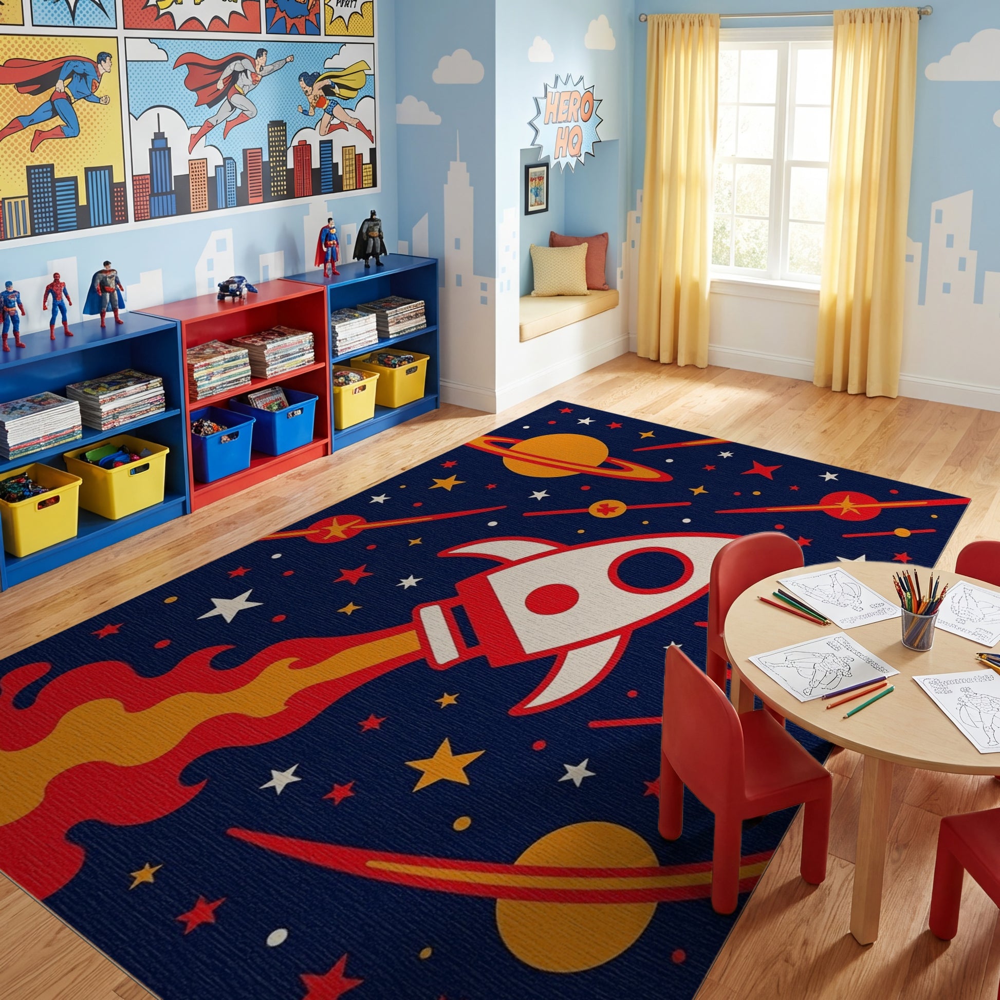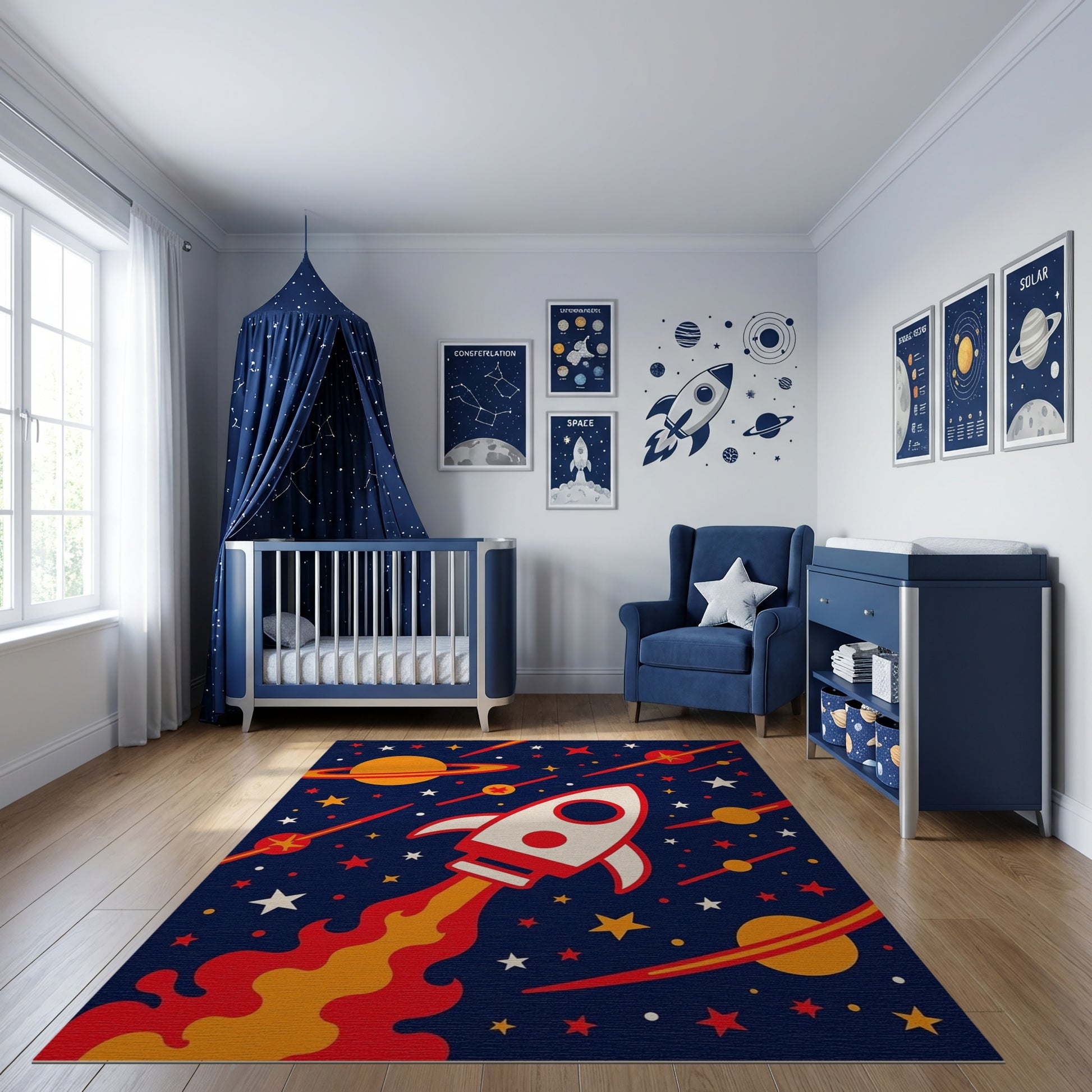 Flatwoven High Traffic Area Rug, Whimsical Cosmic Rocket Stars Rug, Non Slip, Stain Resistant, Washable Area Rugs for Study Room, Playroom, Bedroom Overview: