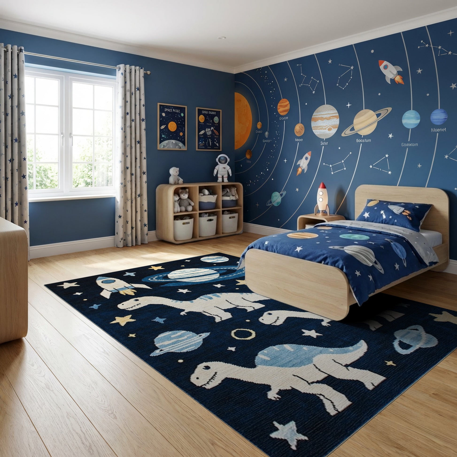 Flatwoven High Traffic Area Rug, Whimsical Dino Rocket Planet Stars Rug, Non Slip, Stain Resistant, Washable Area Rugs for Study Room, Playroom, Bedroom Overview: